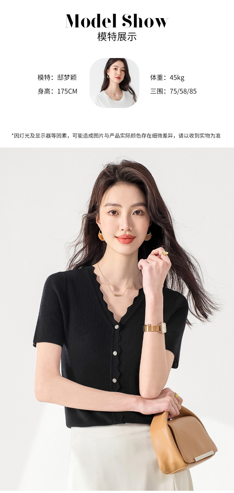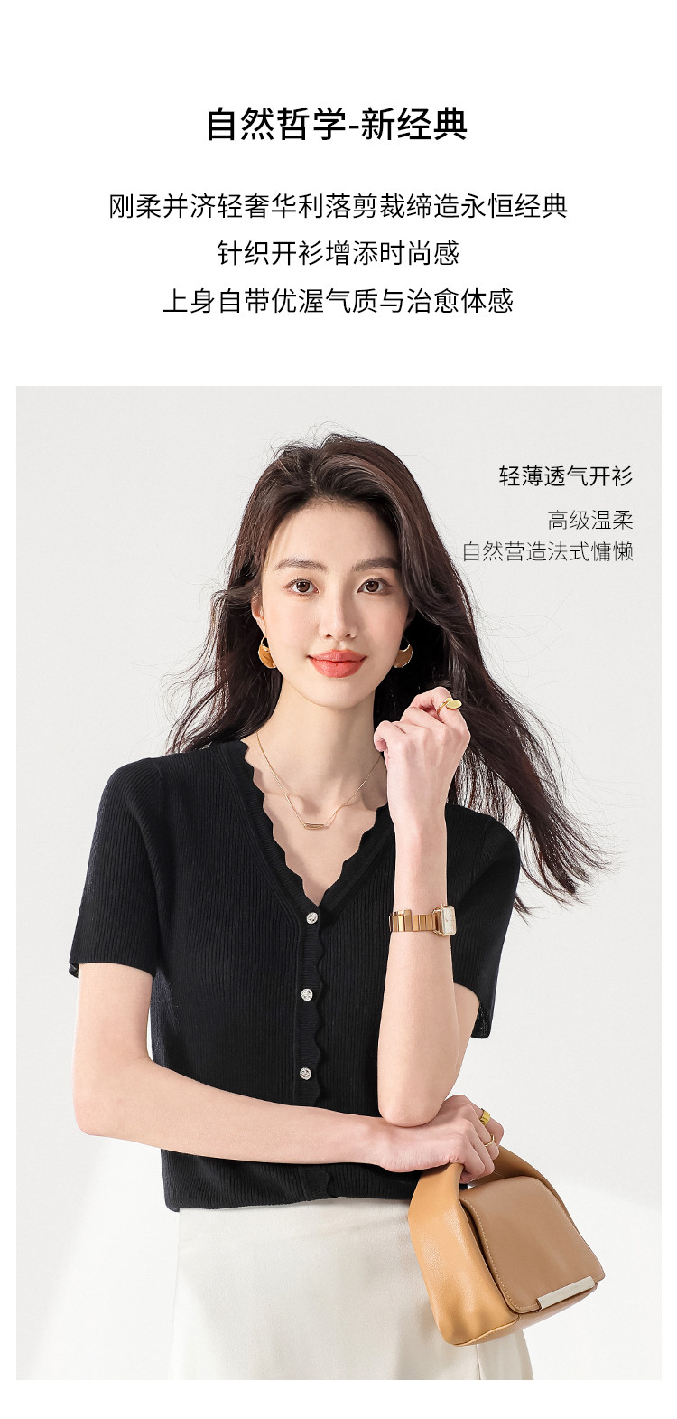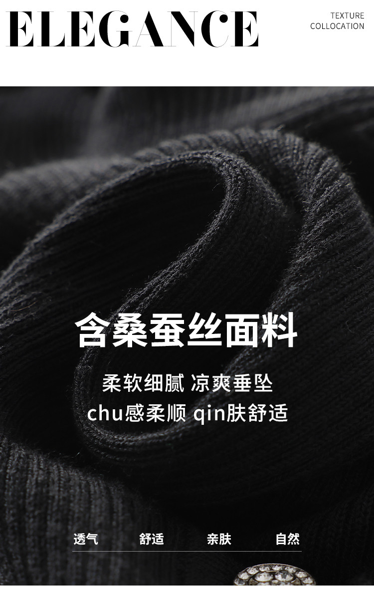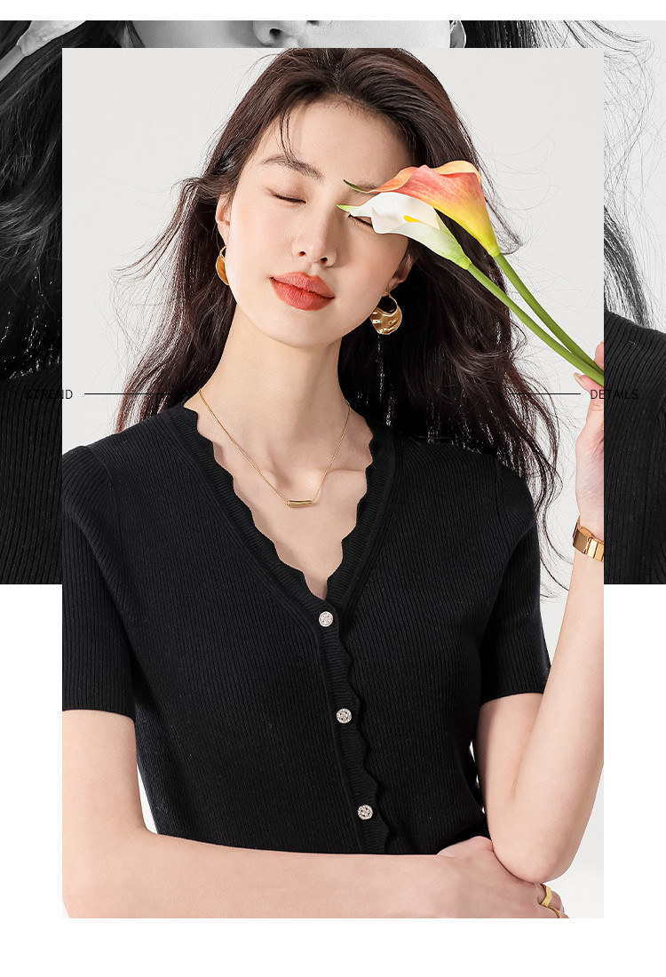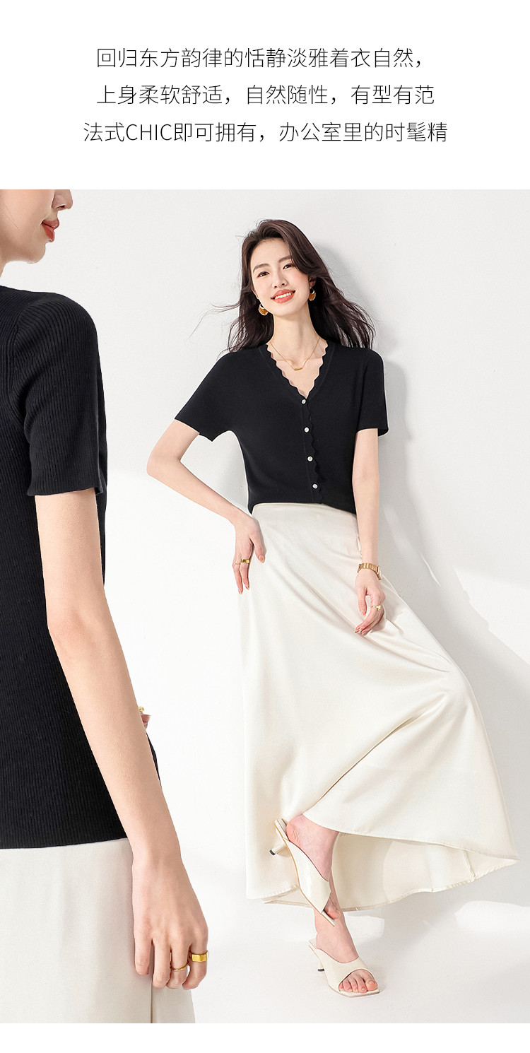 商品名称:【含桑蚕丝】纯色V领抽条短袖针织打底T恤开衫毛衣外套小衫 942355
