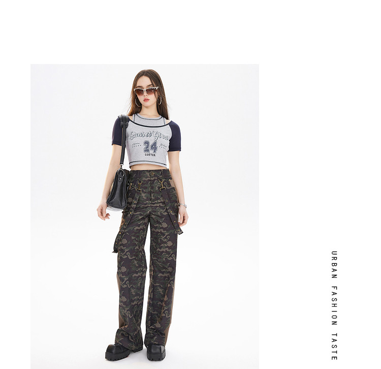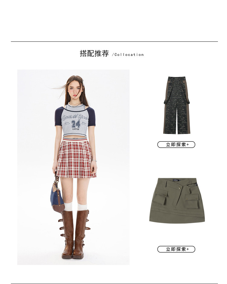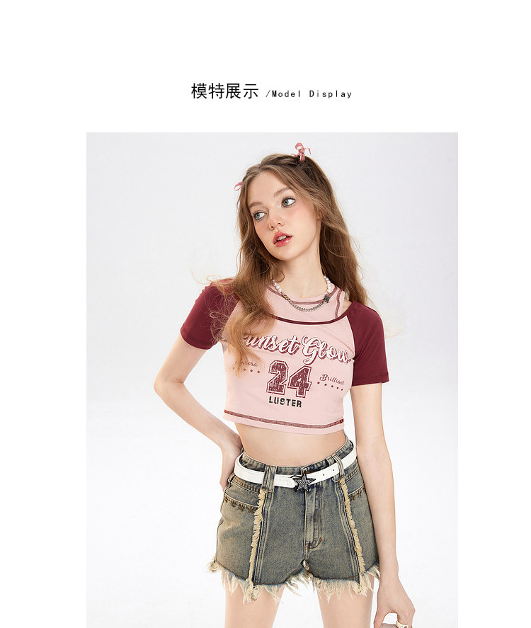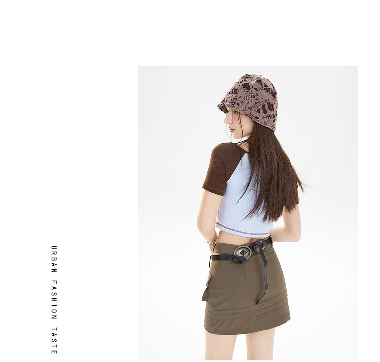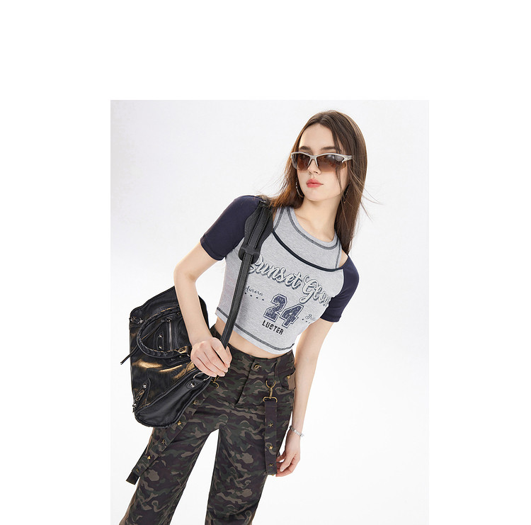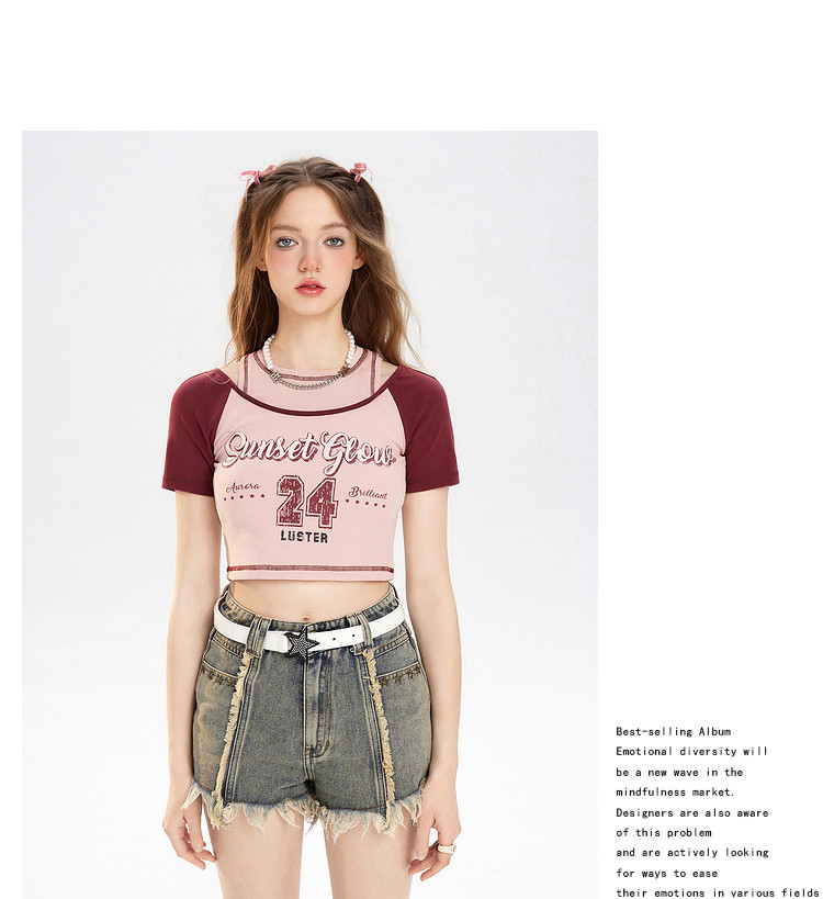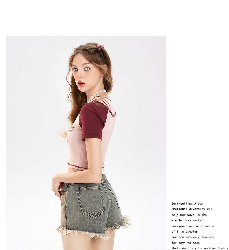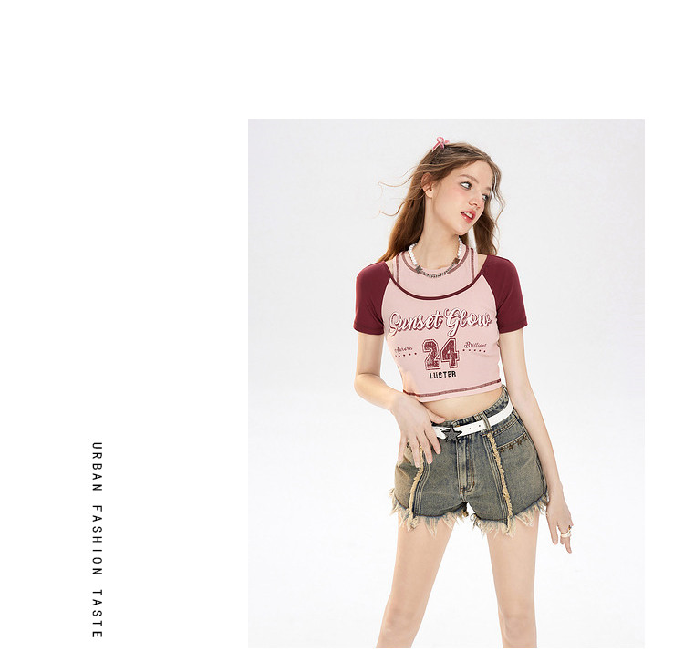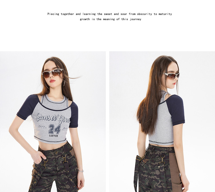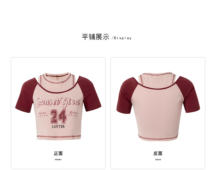商品名称:夏装美式学院风辣妹露肩t恤女镂空假两件上衣 910484