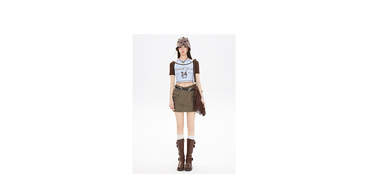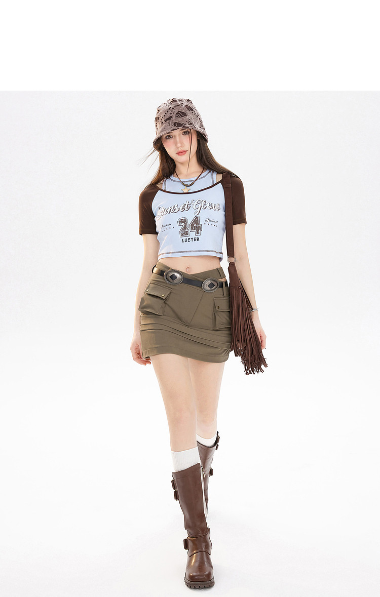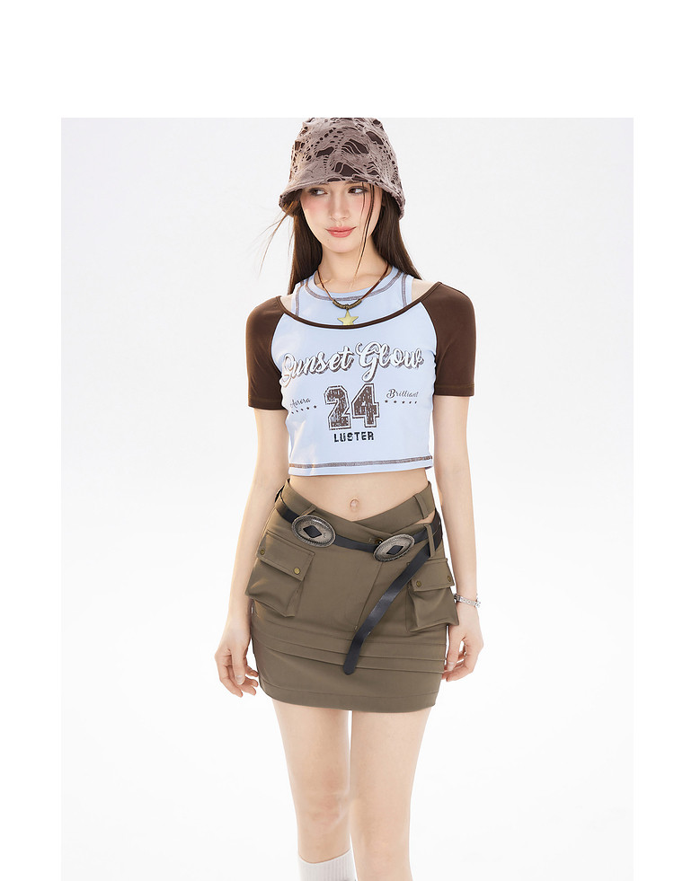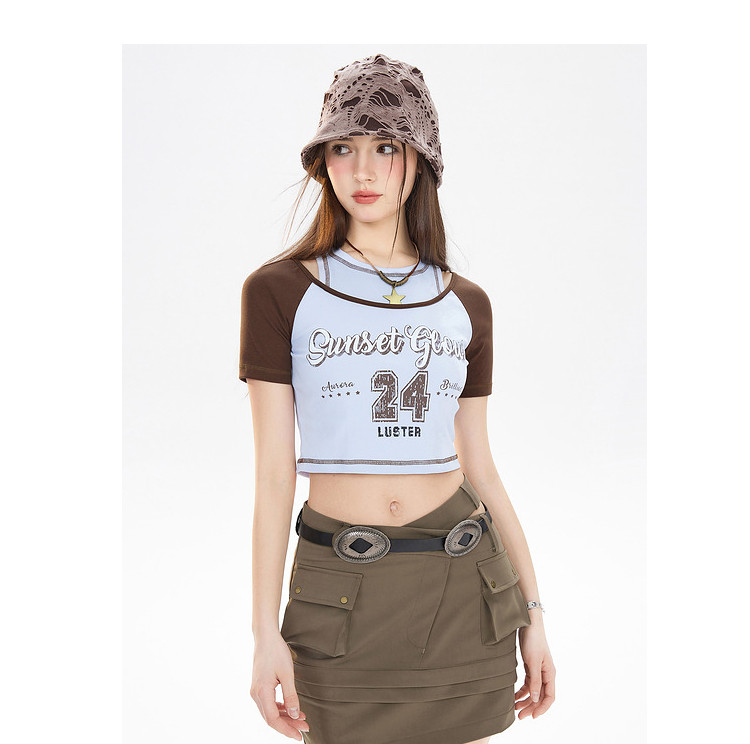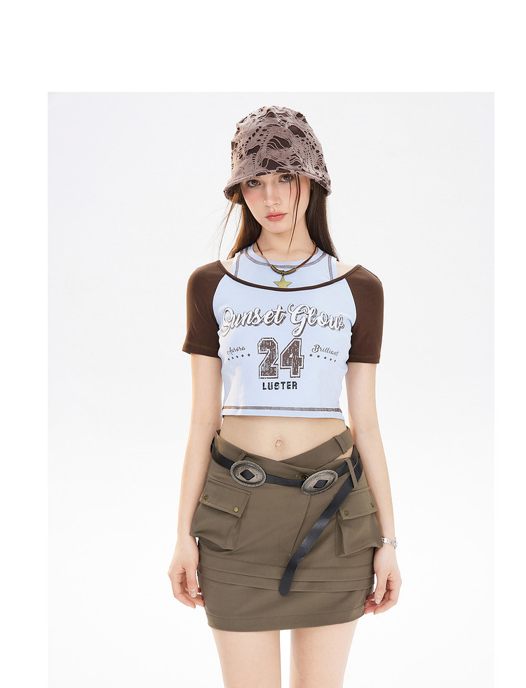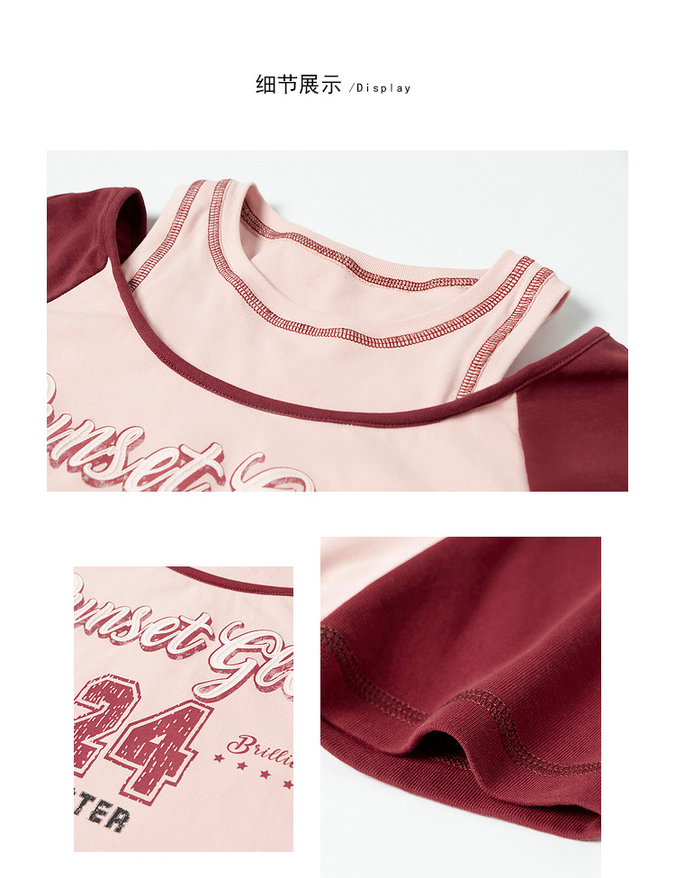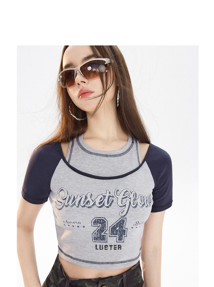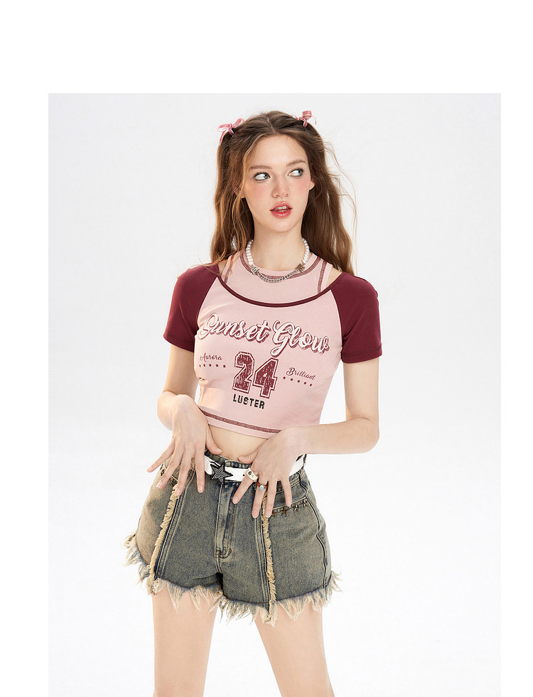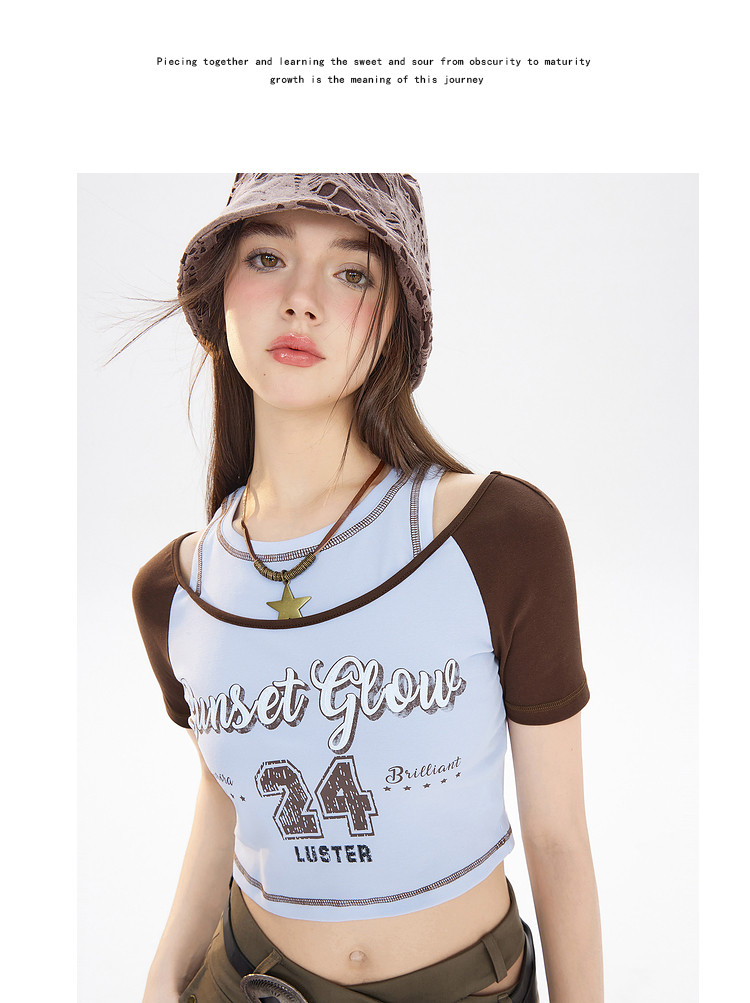 夏装美式学院风辣妹露肩t恤女镂空假两件上衣 910484