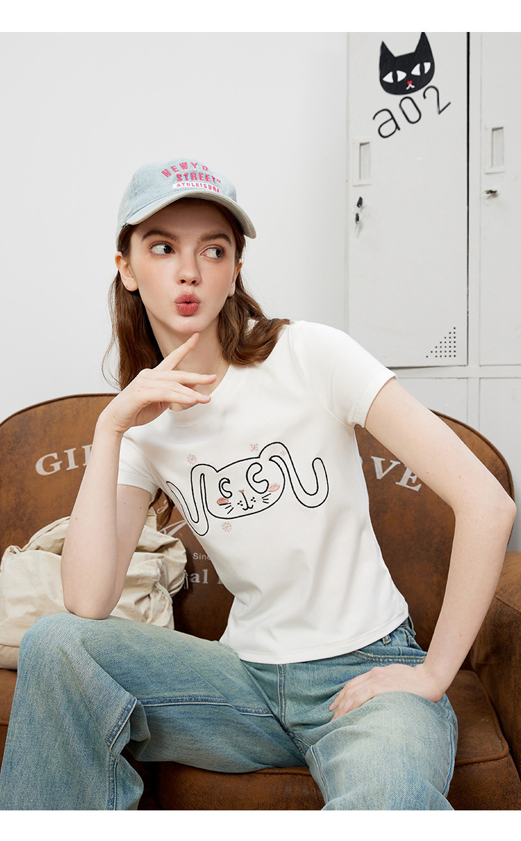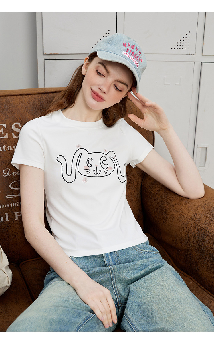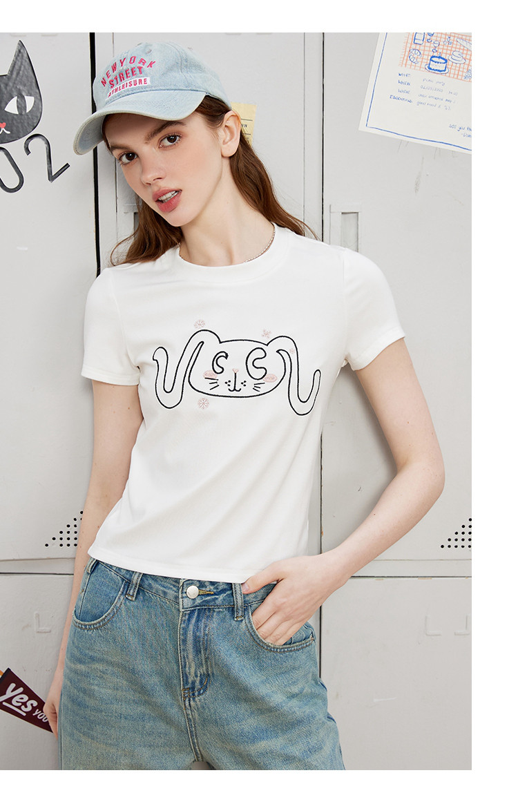 精致刺绣长耳朵猫头绣花修身显瘦短袖夏季女式T恤 763357