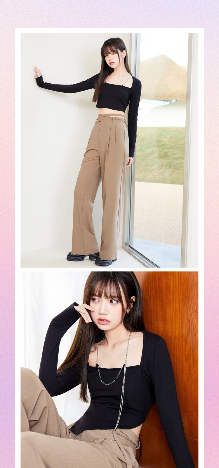 春秋纯色直筒休闲裤女绑带简约百搭坠感梭织阔腿裤 295380