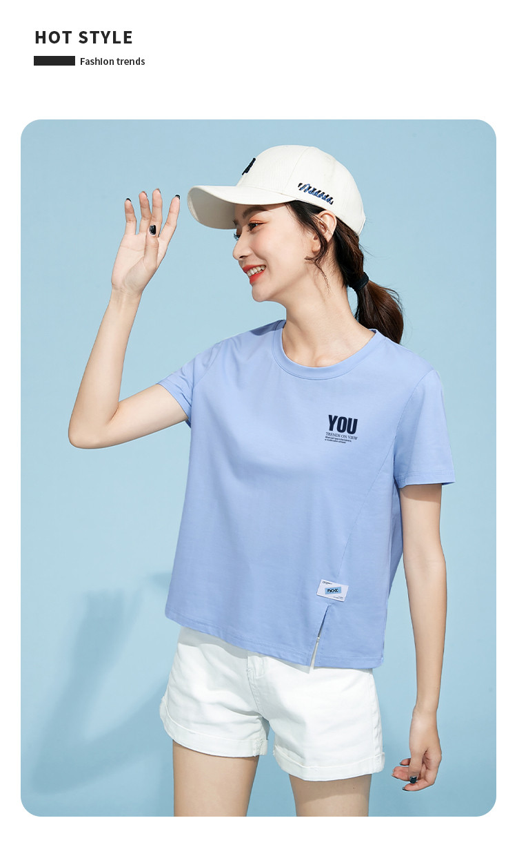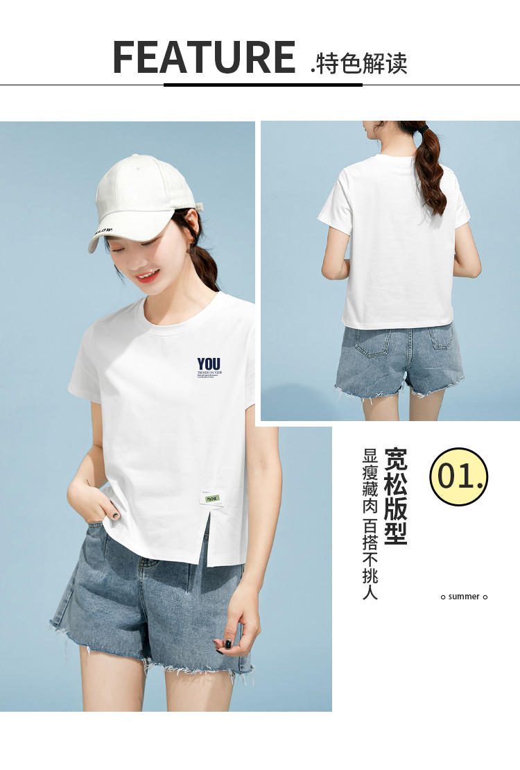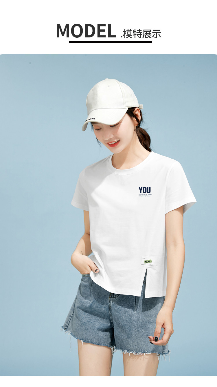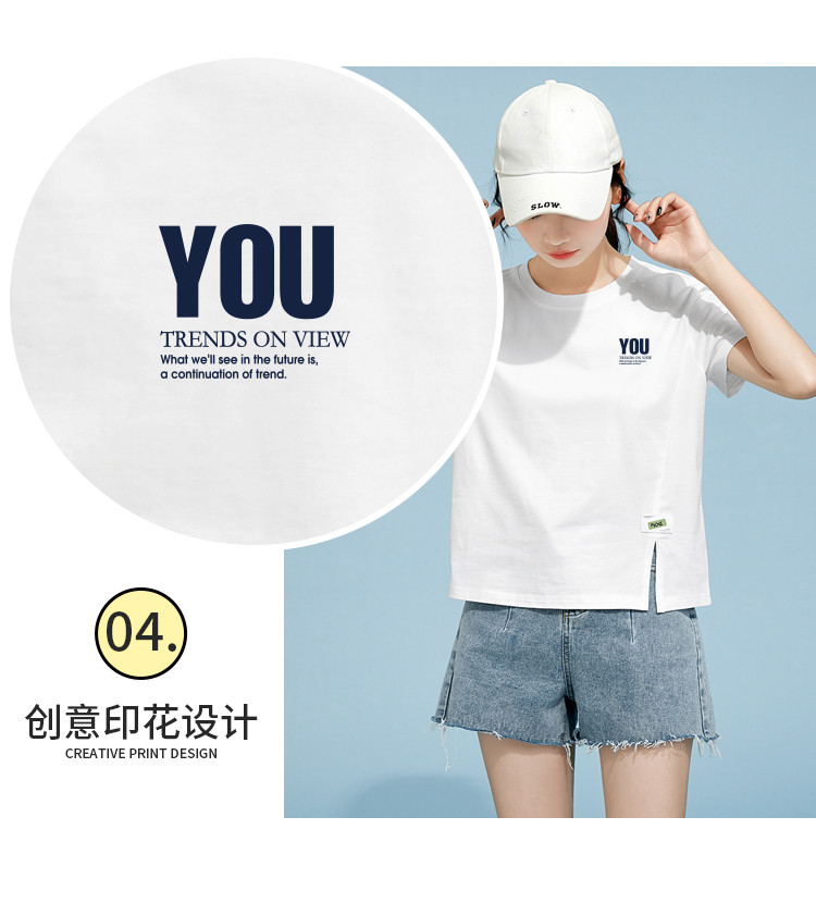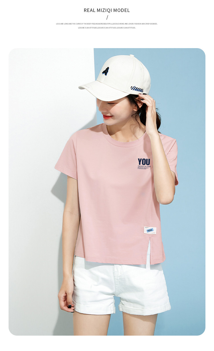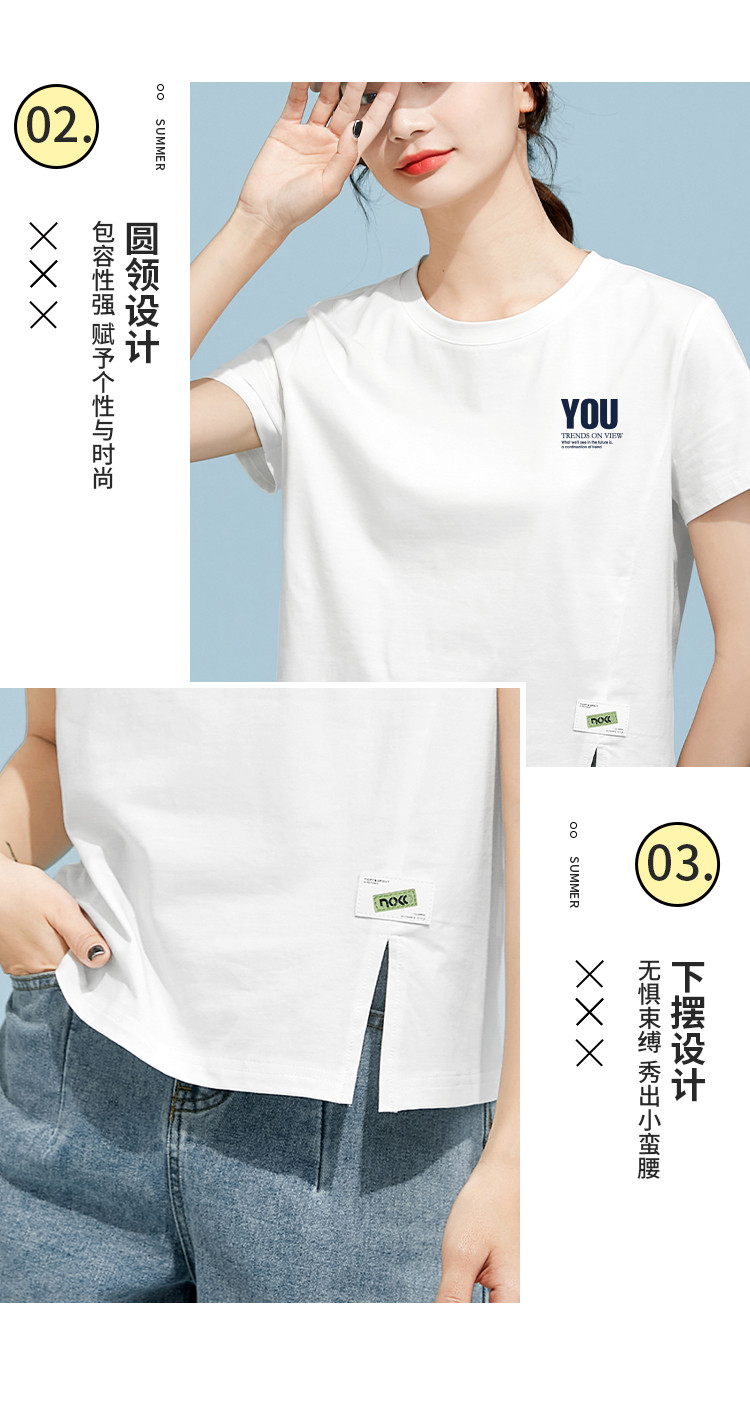 商品名称:米子旗夏季圆领印花T恤女下摆开叉设计宽松休闲短袖上衣 948890
