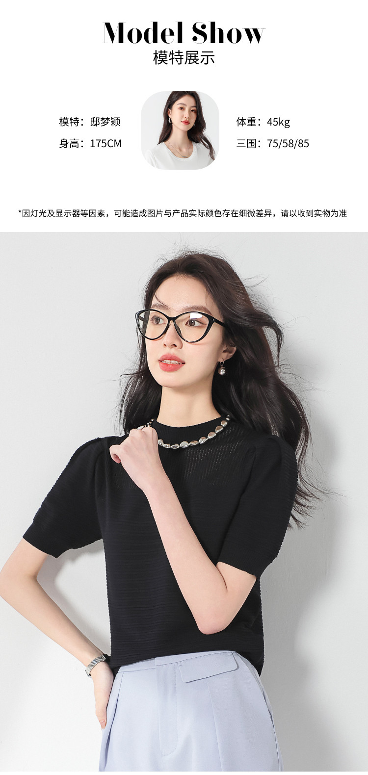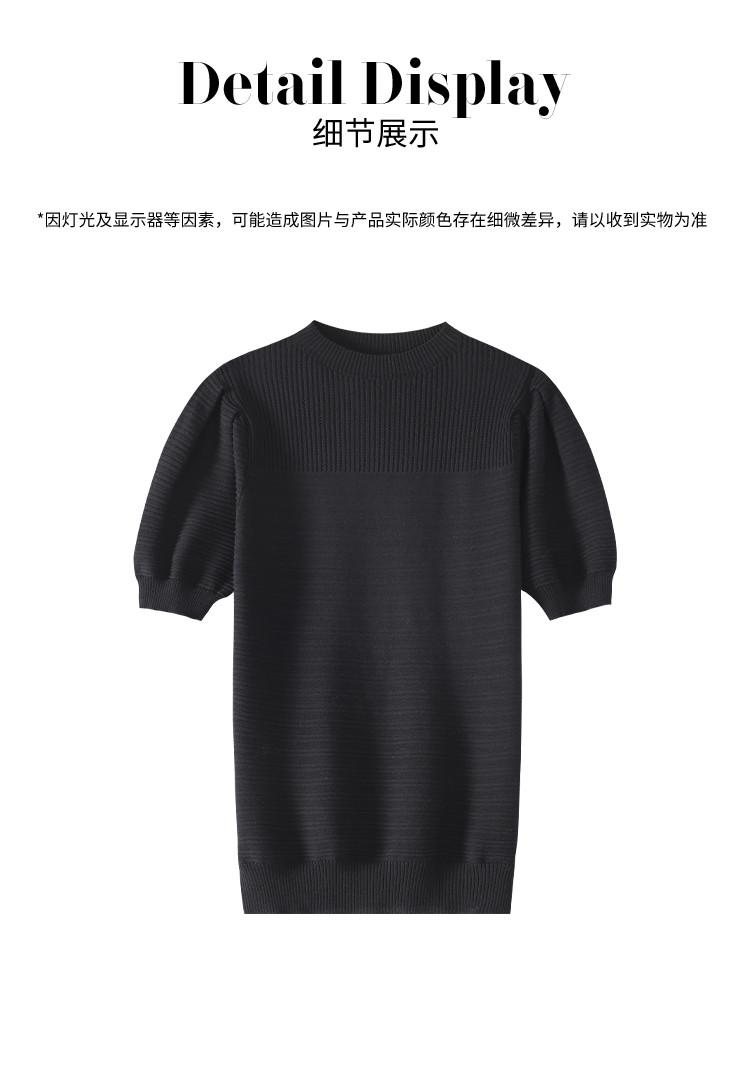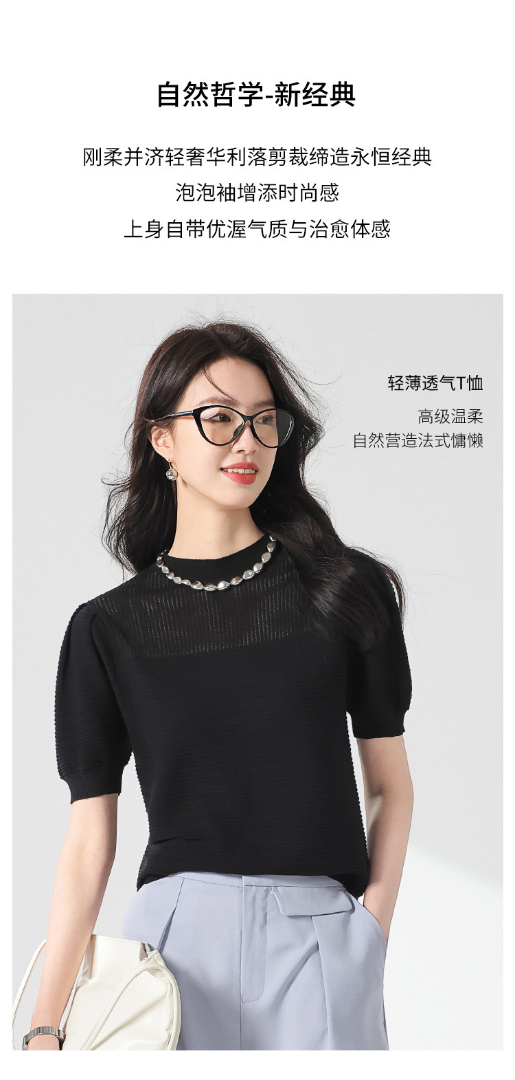 商品名称:【含桑蚕丝】轻薄透气纯色泡泡袖针织衫女夏短袖T恤 083155