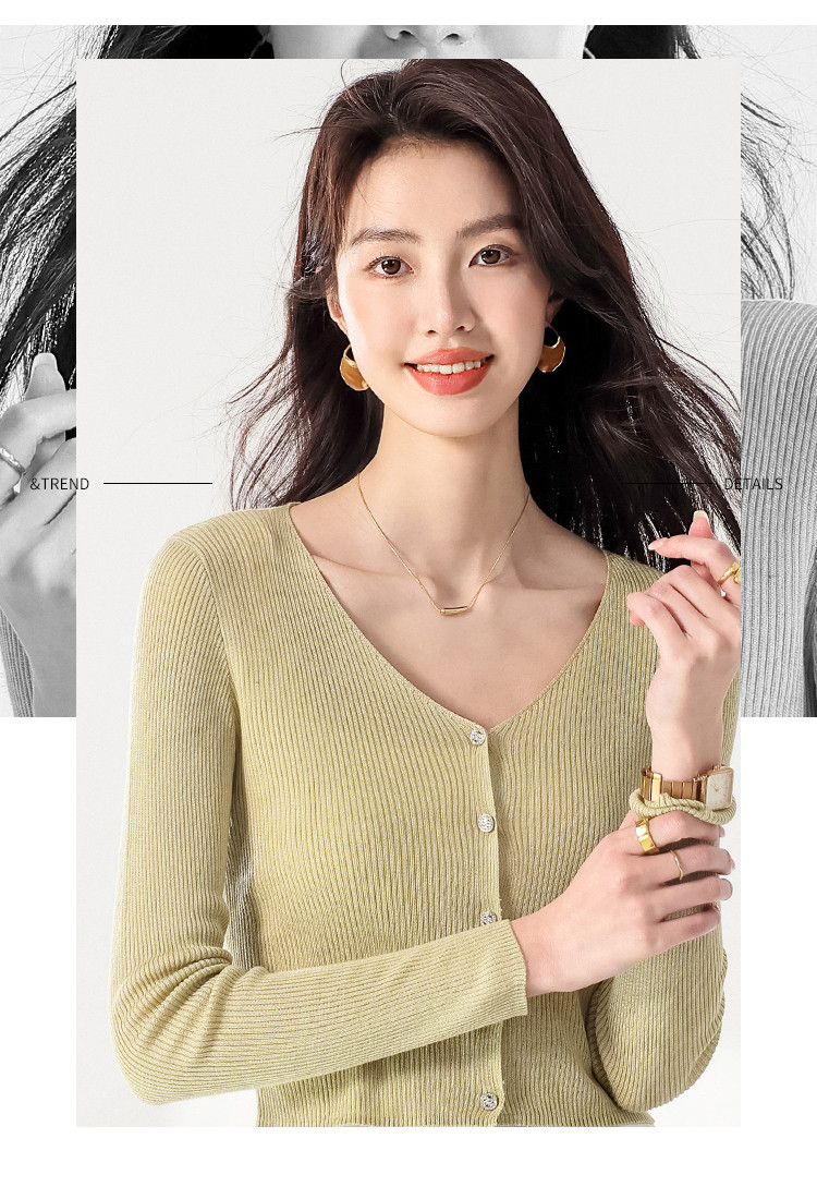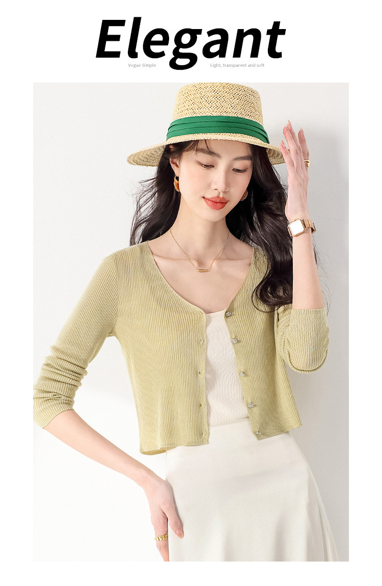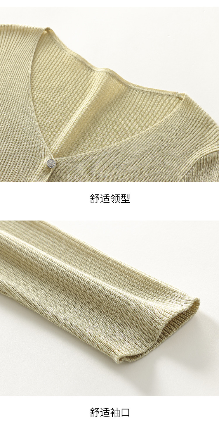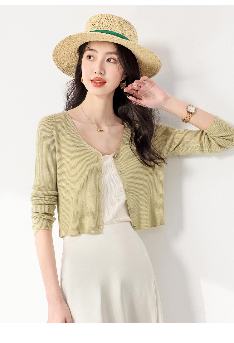 商品名称:【含桑蚕丝】纯色V领抽条长袖针织打底开衫外套夏款空调衫小衫 950547