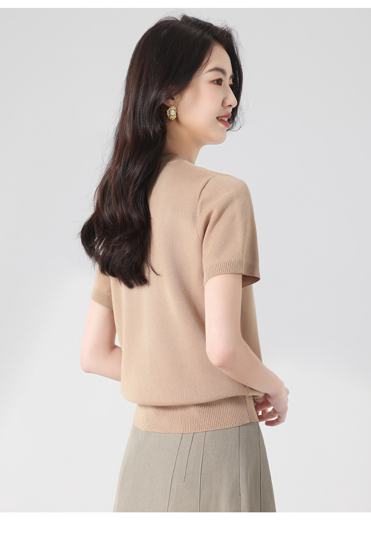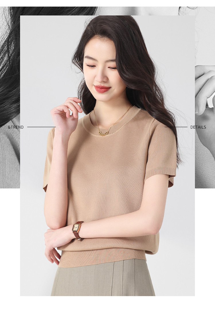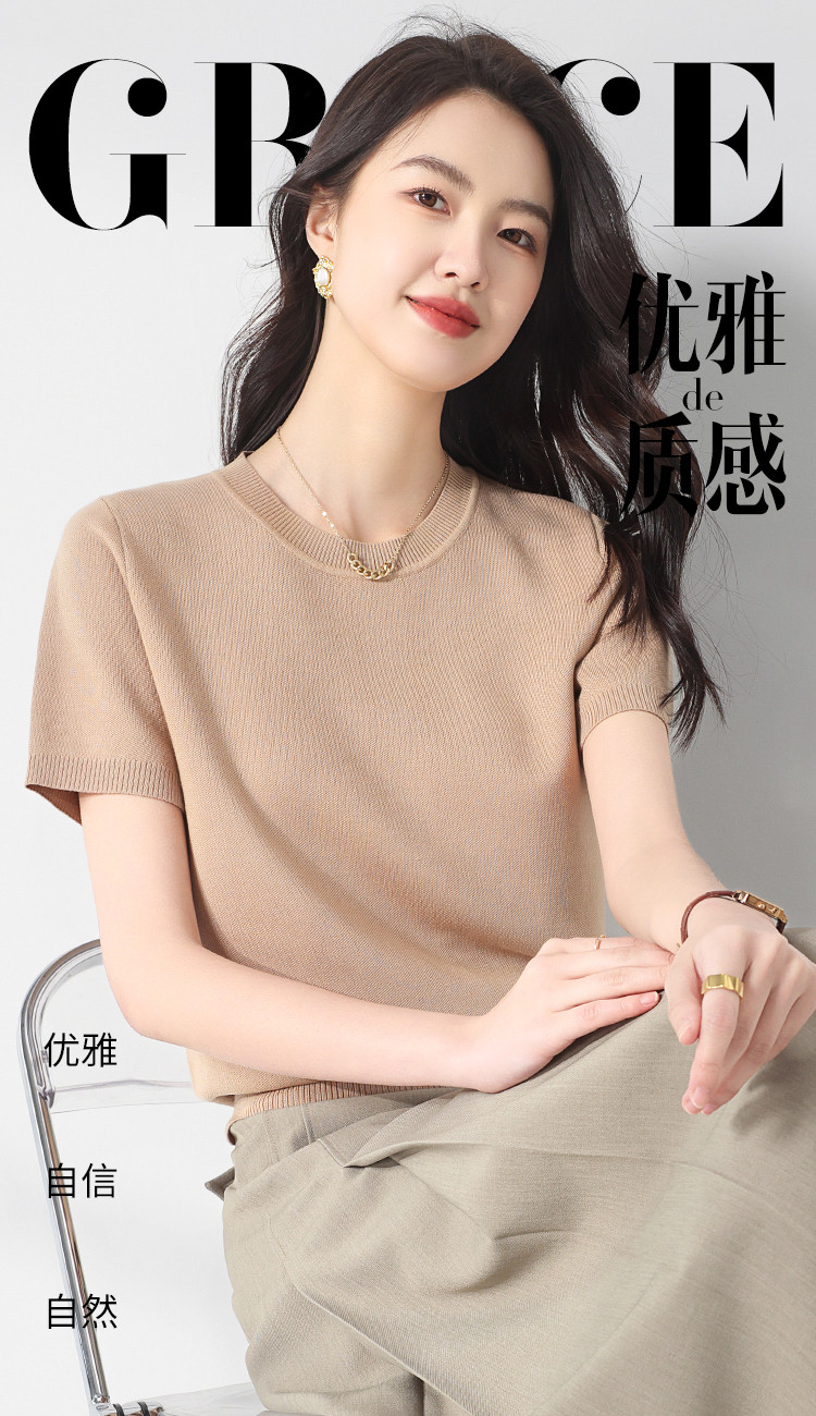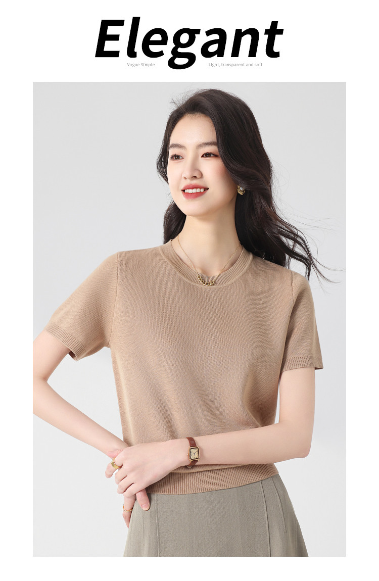 商品名称:基础款纯色百搭圆领含桑蚕丝针织打底衫短袖T恤轻薄透气 444819