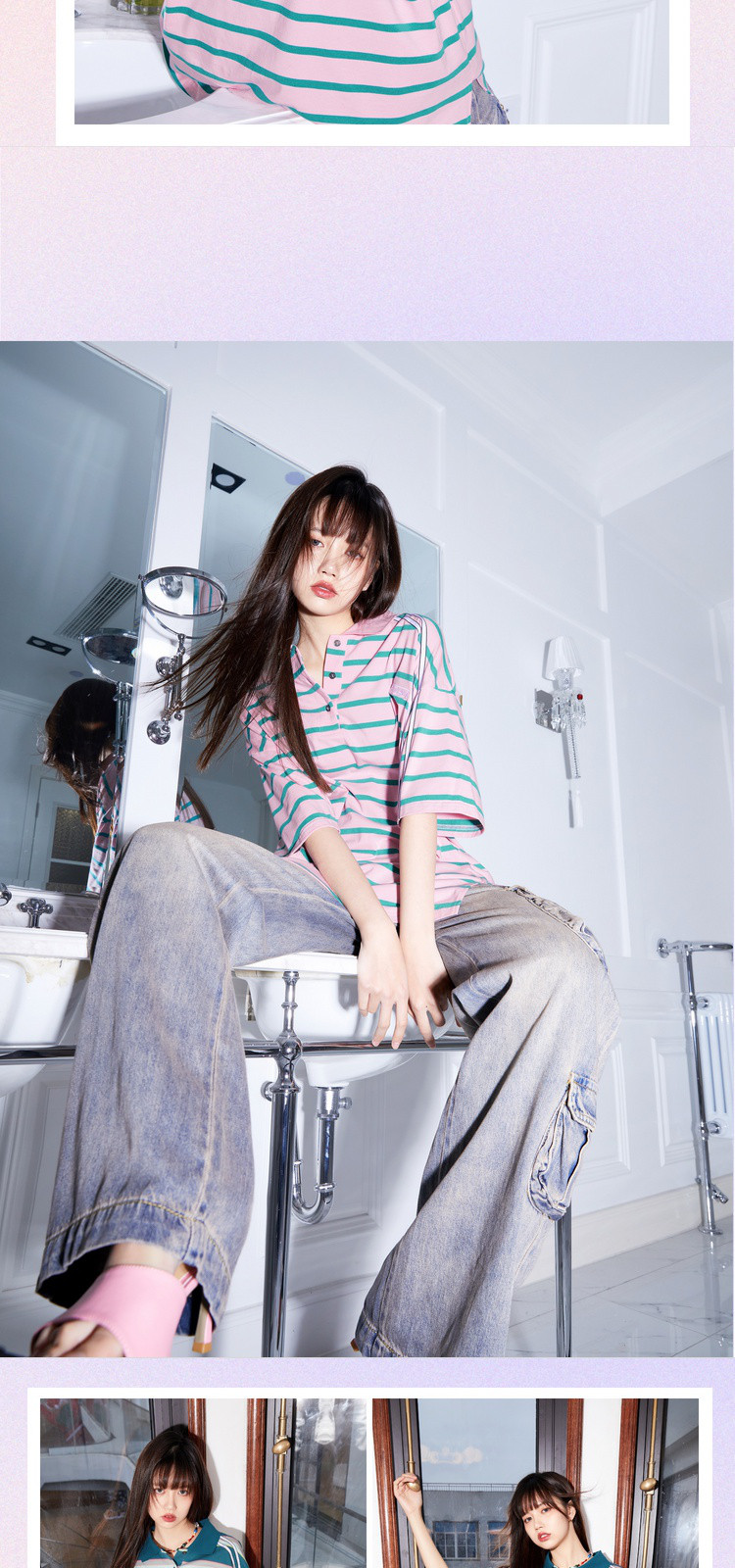 夏季日系复古学院风条纹Polo衫女甜酷风小众高级感T恤 722452