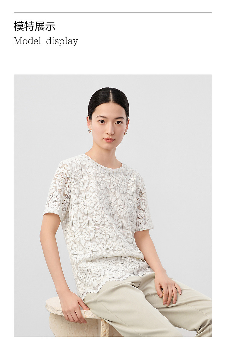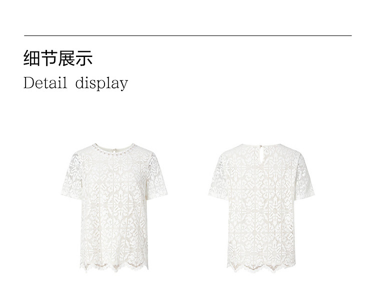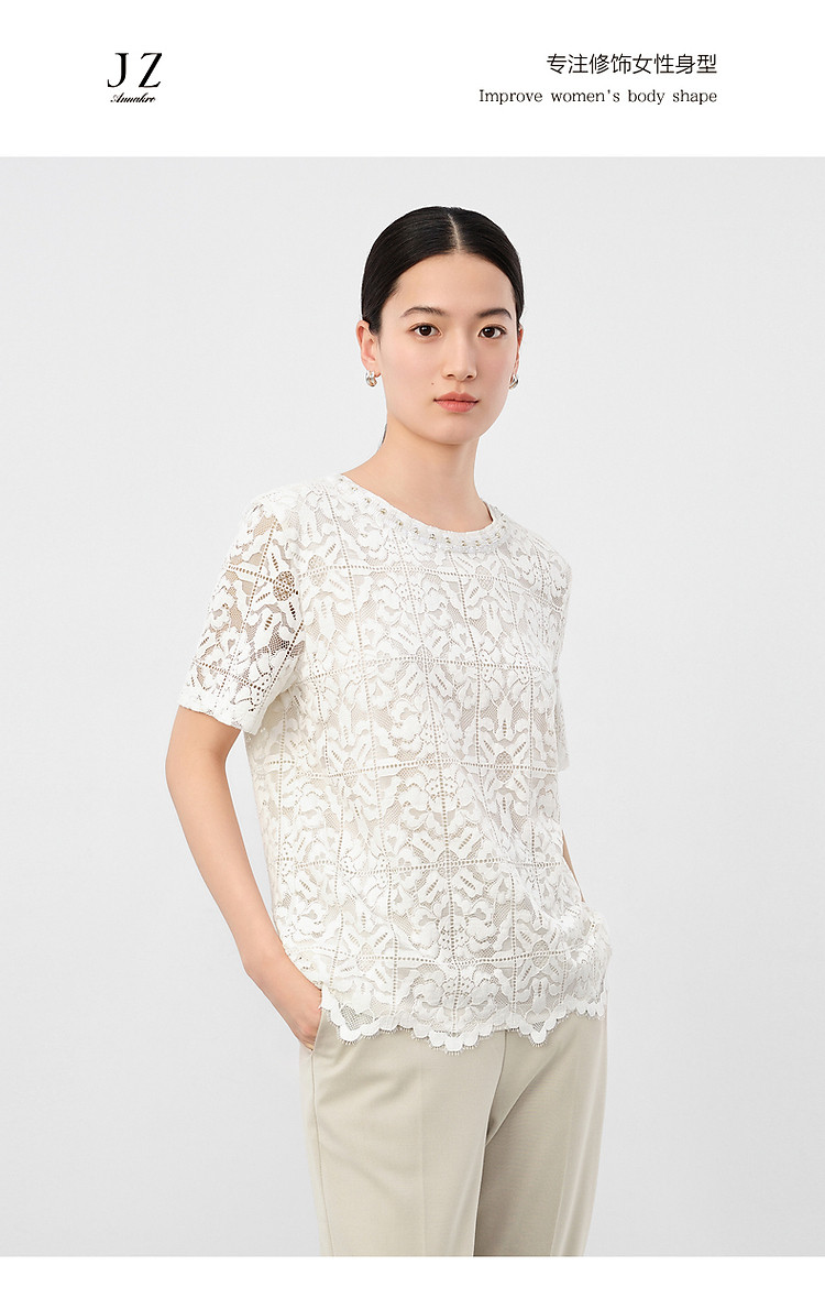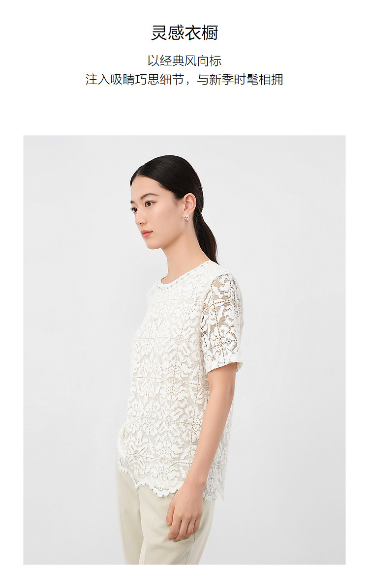 商品名称:玖姿旗下安娜蔻系列优雅轻熟风经典蕾丝钉珠花边宽松T恤女 033676