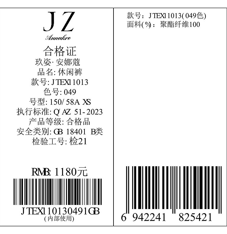 商品名称:玖姿旗下安娜蔻系列通勤简约轻薄哈伦裤休闲裤女夏季 417100
