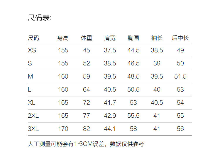 | 尺码 | 衣长(cm) | 肩宽(cm) | 袖长(cm) | 胸围(cm) | 下摆围(cm) | 号型 |