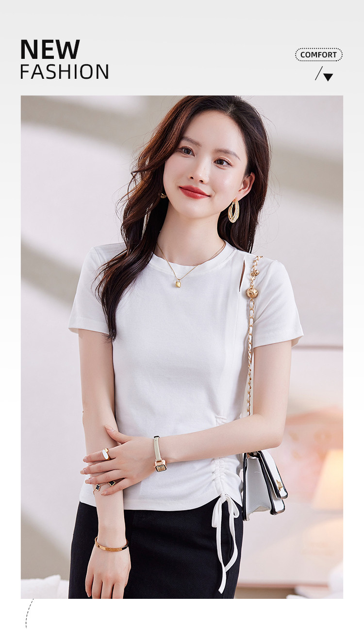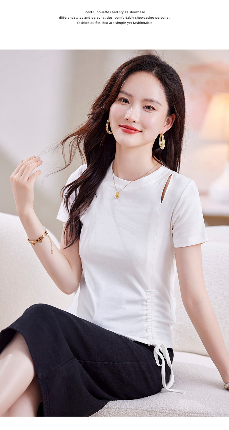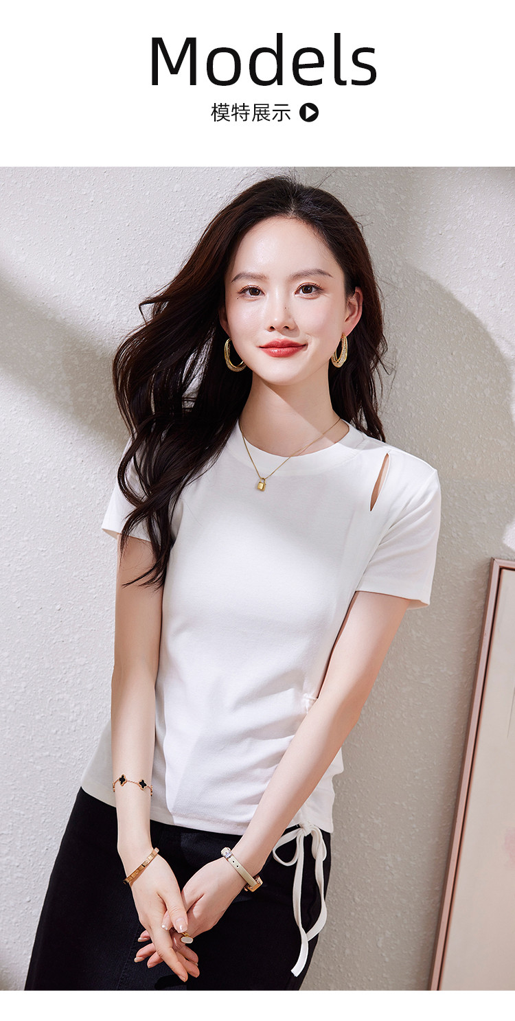 商品名称:夏季时尚BM风短袖女侧边别致抽绳设计破洞圆领高弹修身t恤 053208
