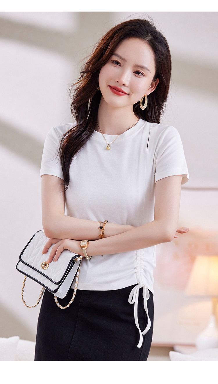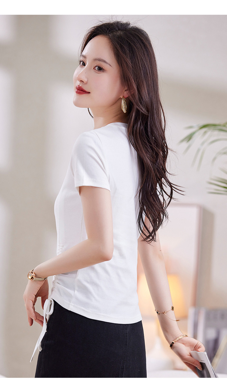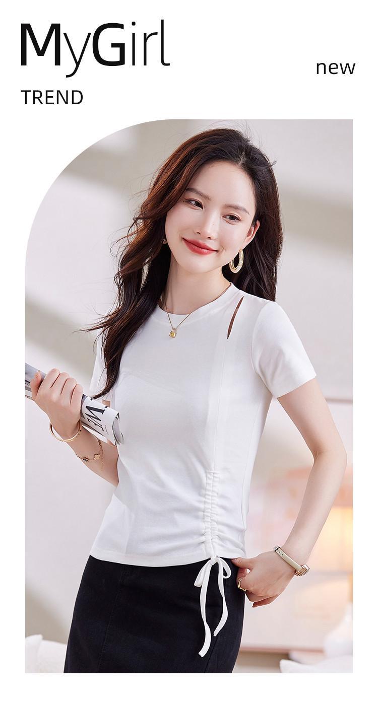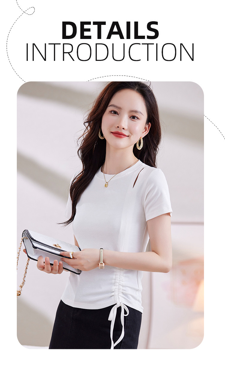 商品名称:夏季时尚BM风短袖女侧边别致抽绳设计破洞圆领高弹修身t恤 053208