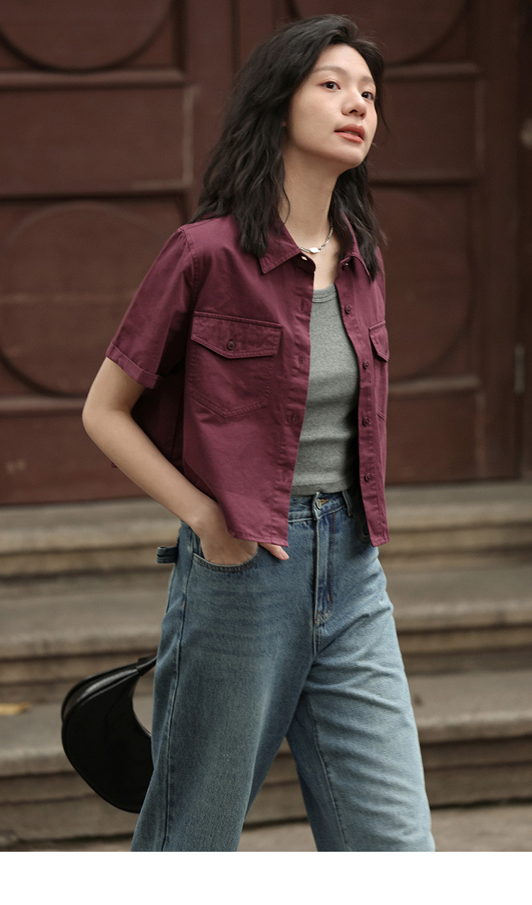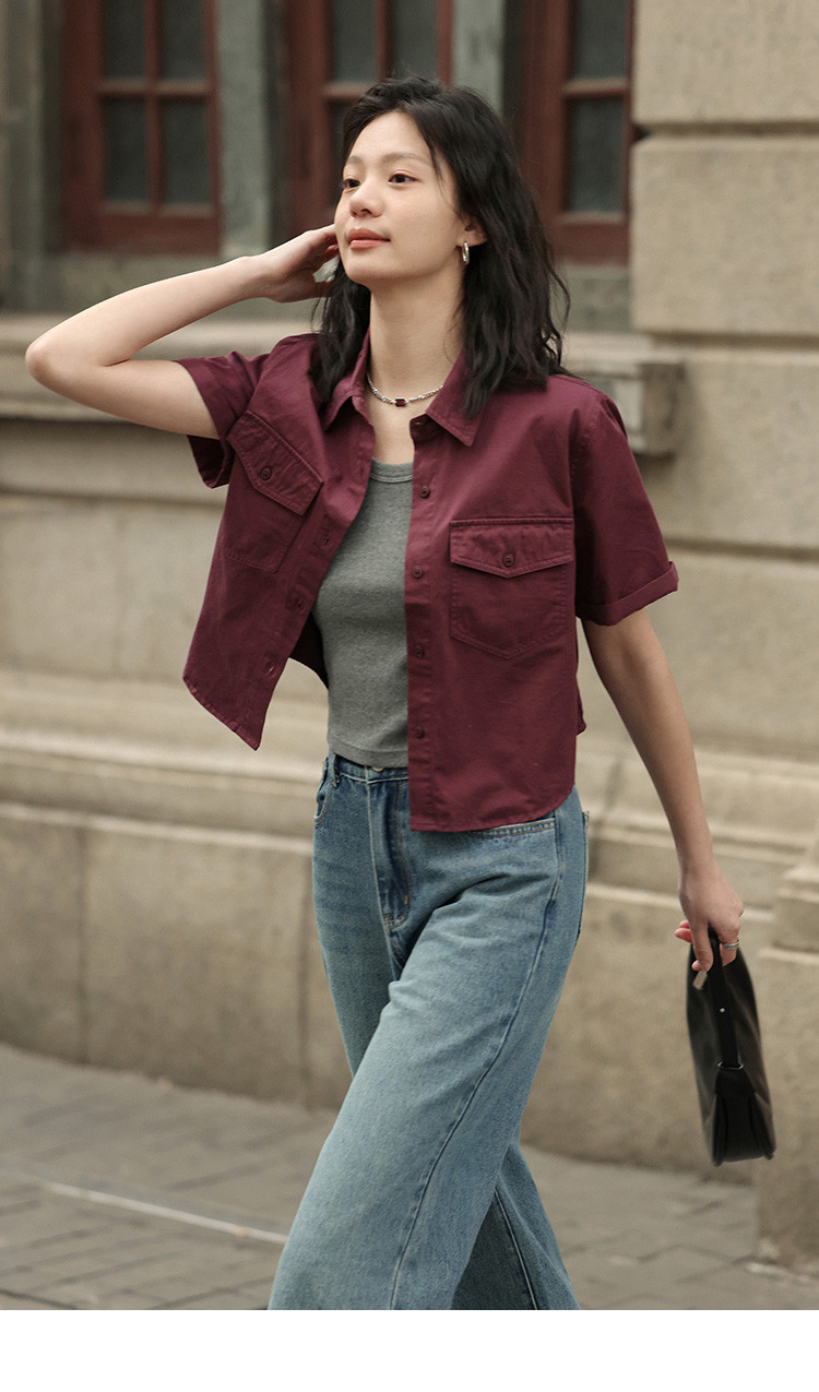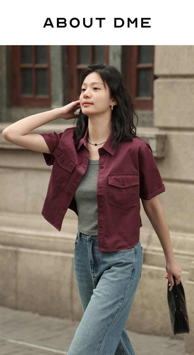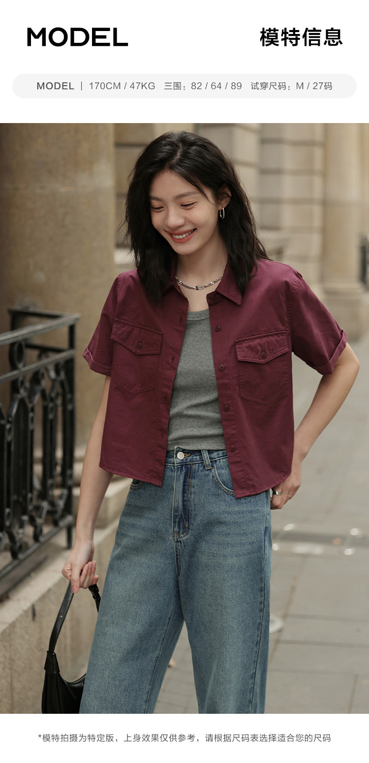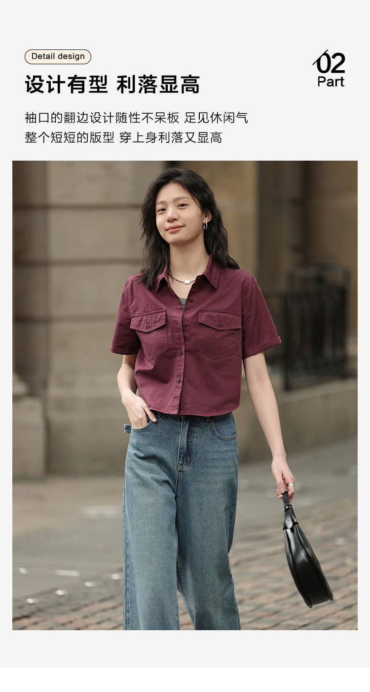 【翻边短袖衬衫】夏款时髦翻领双贴袋袖口翻边短款外套女 028226