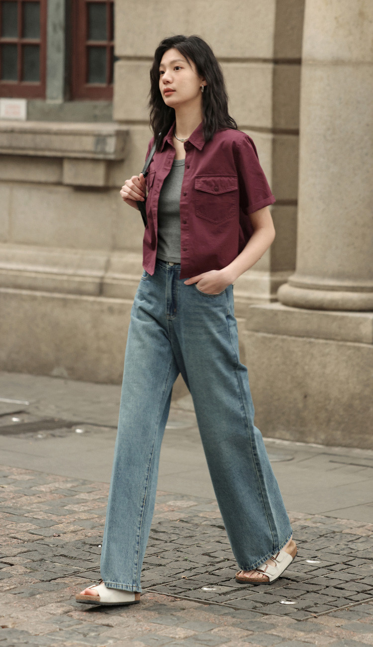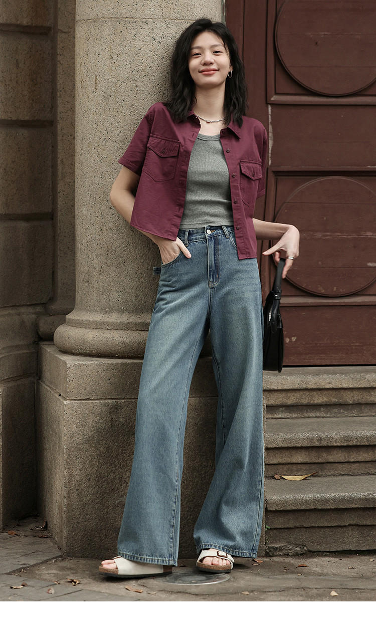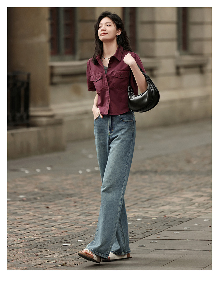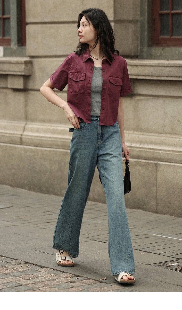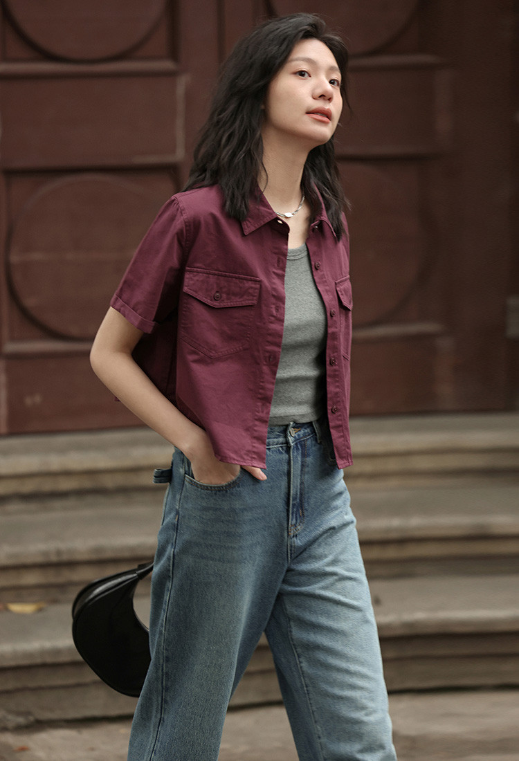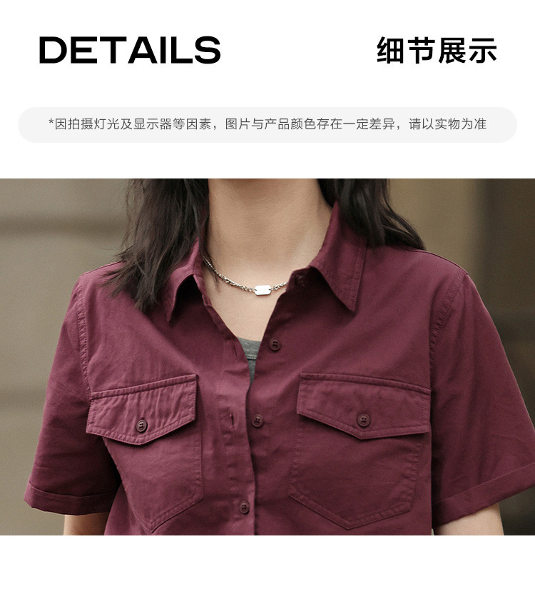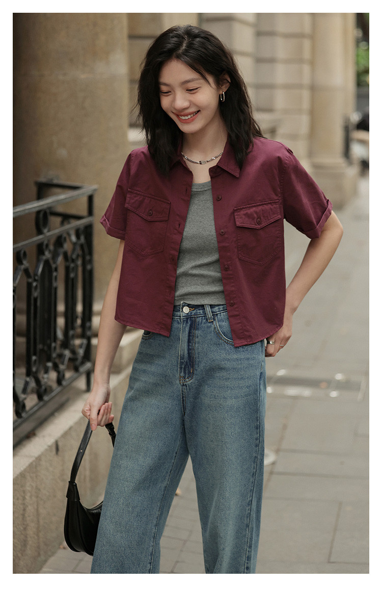 【翻边短袖衬衫】夏款时髦翻领双贴袋袖口翻边短款外套女 028226