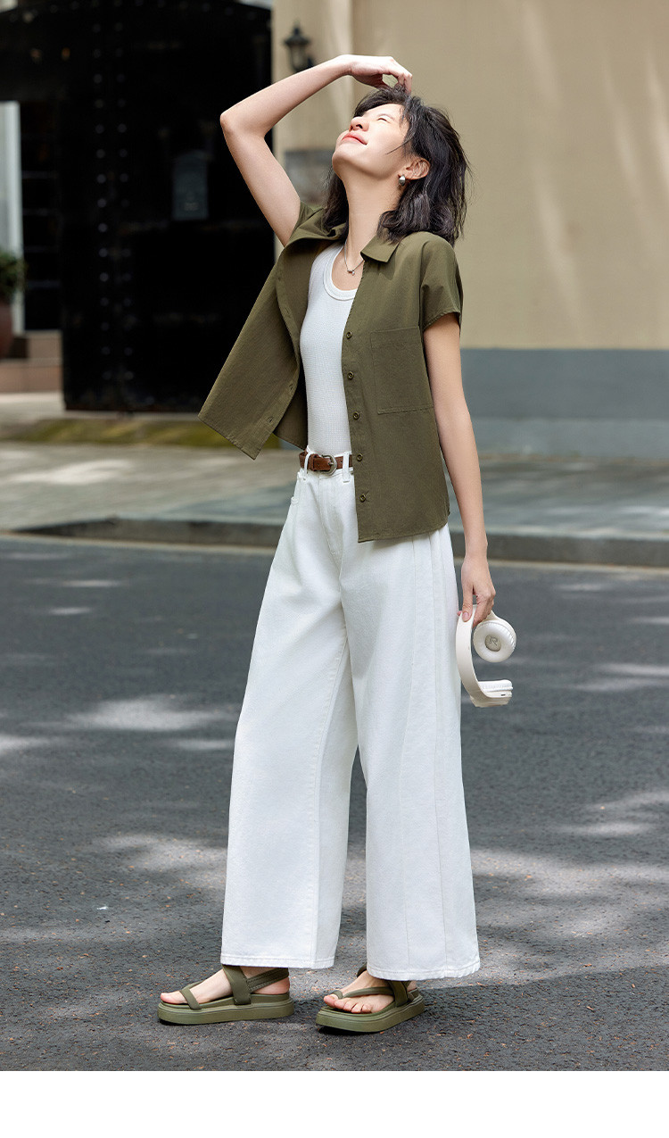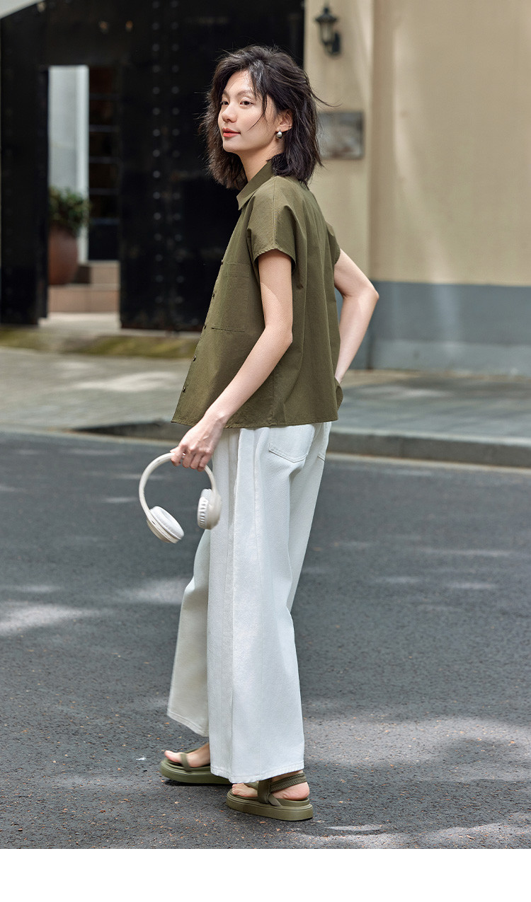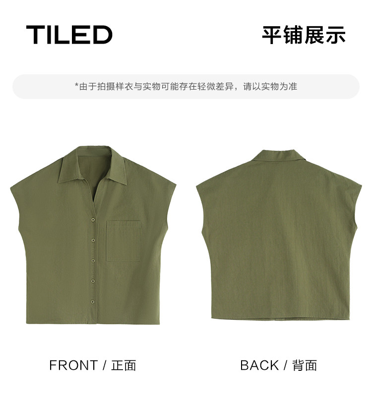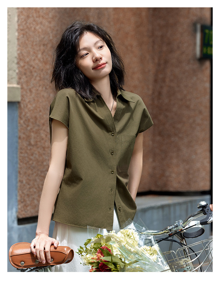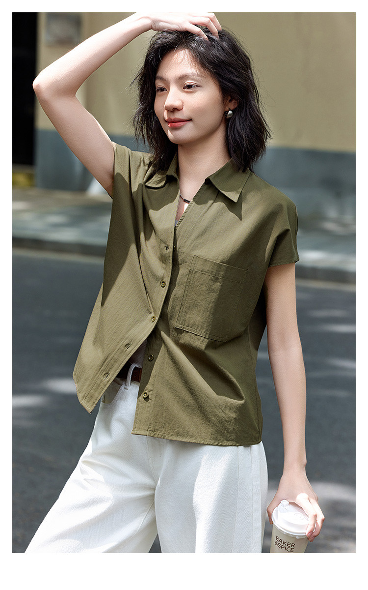 【显白军绿色衬衫】夏款户外休闲风单贴袋翻领宽松衬衫女 815810