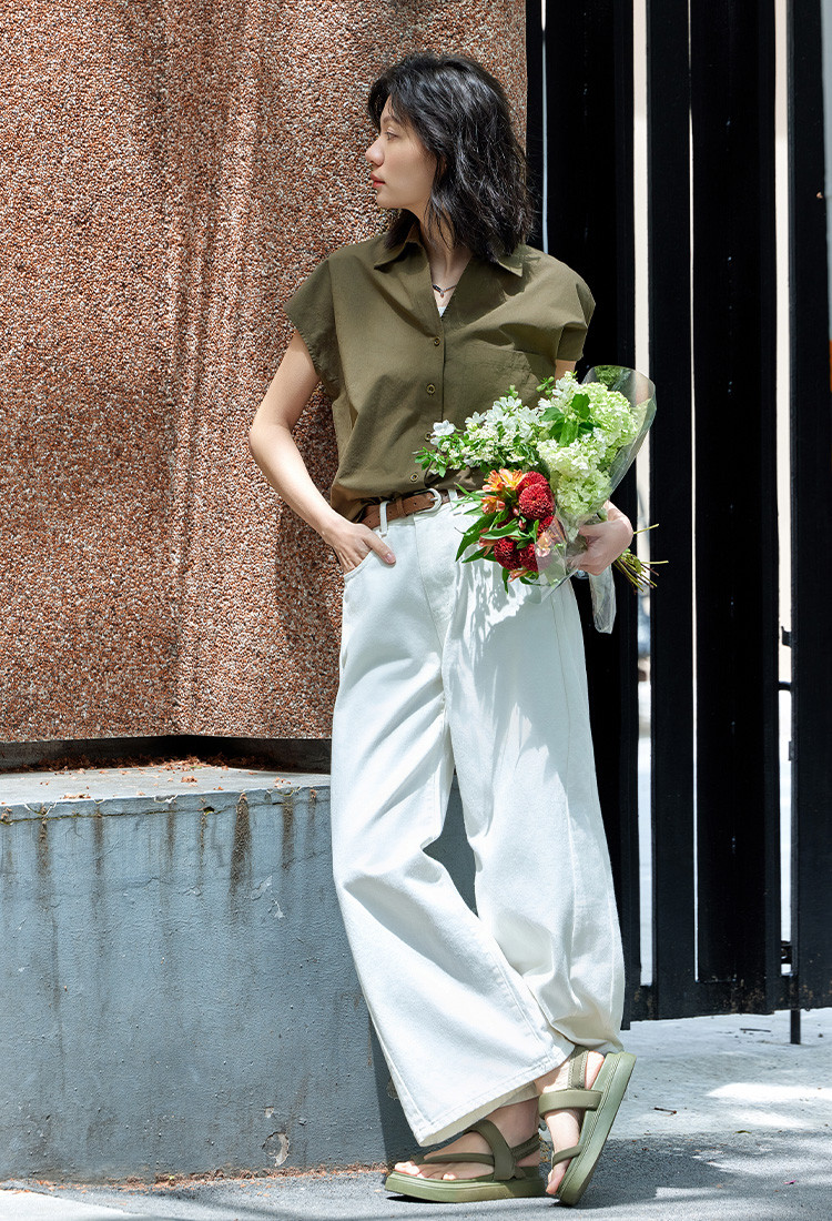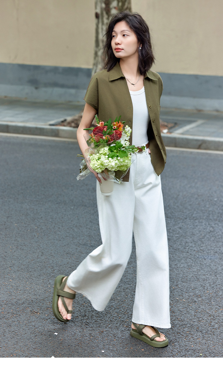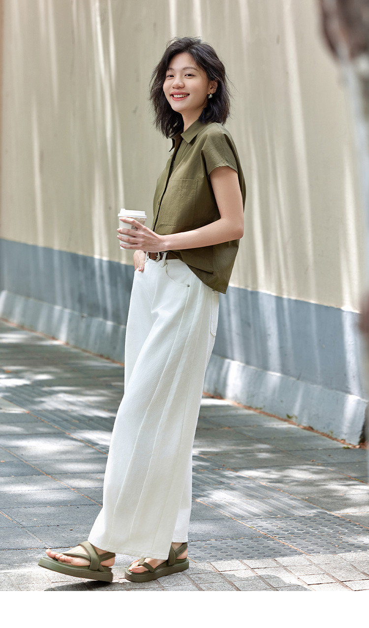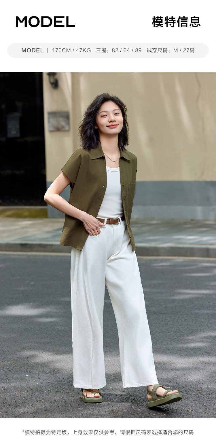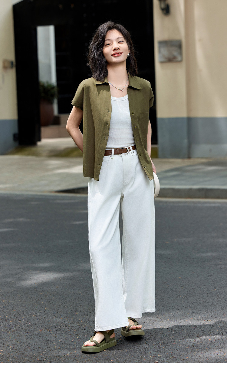 【显白军绿色衬衫】夏款户外休闲风单贴袋翻领宽松衬衫女 815810
