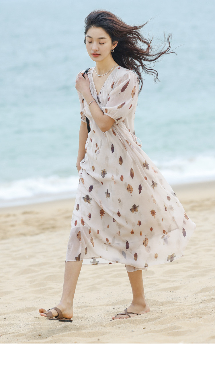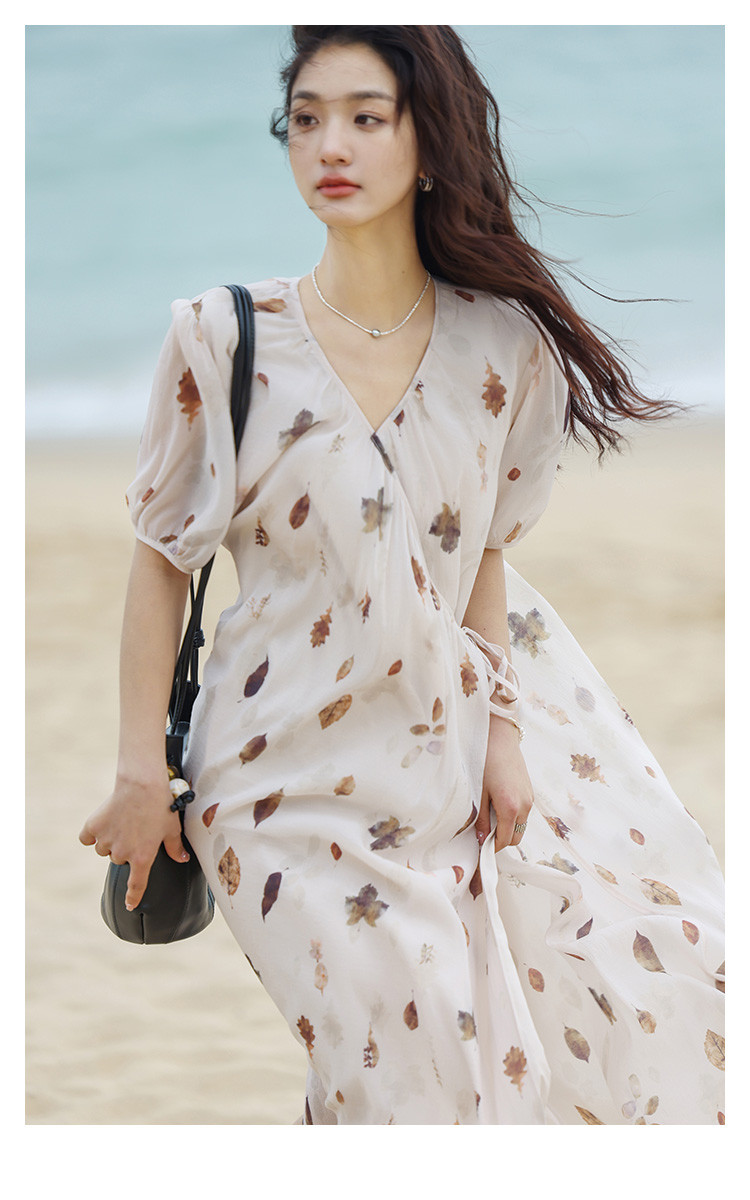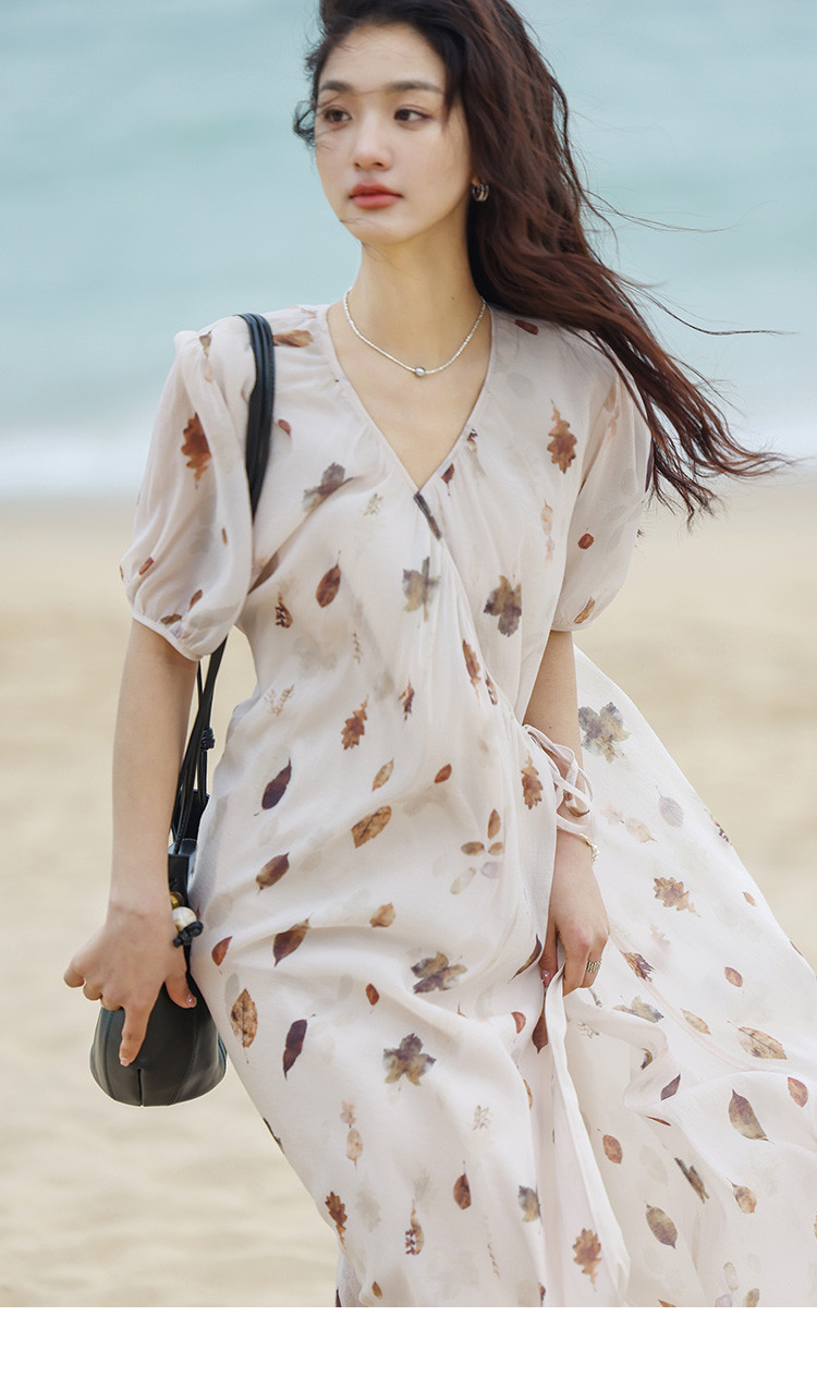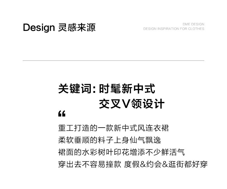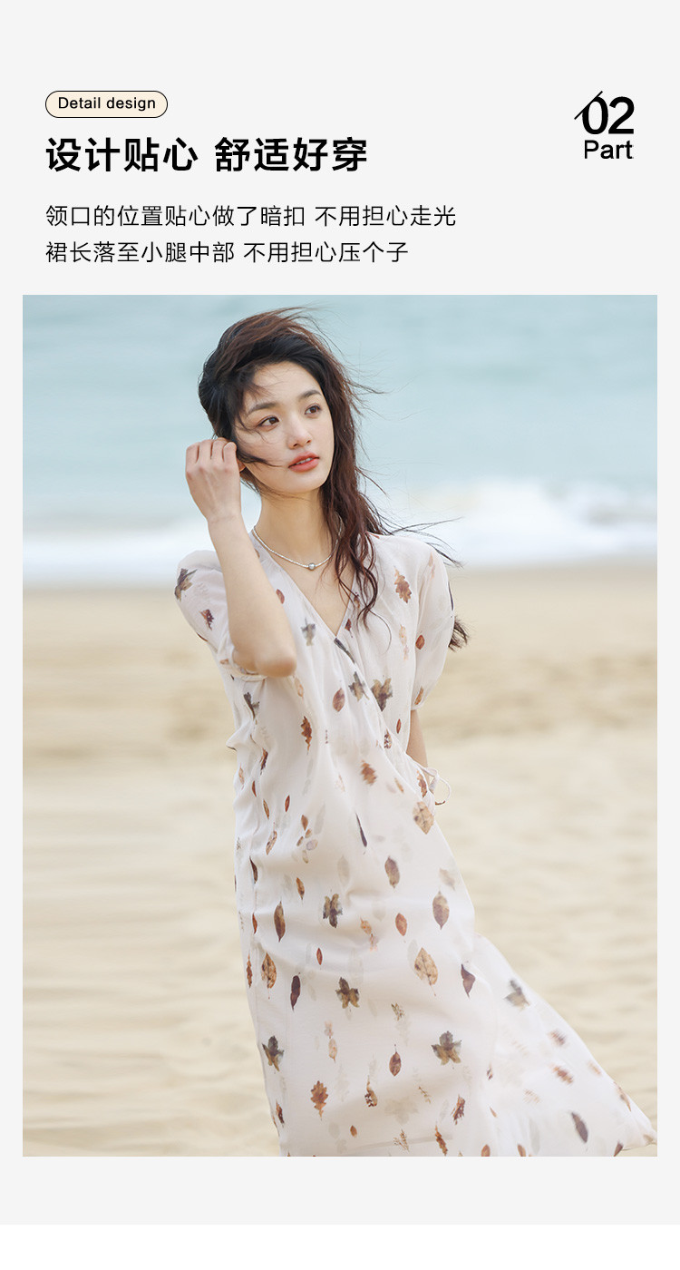 商品名称:【新中式连衣裙】夏款交叉V领树叶印花个性小众舒适长裙 303170