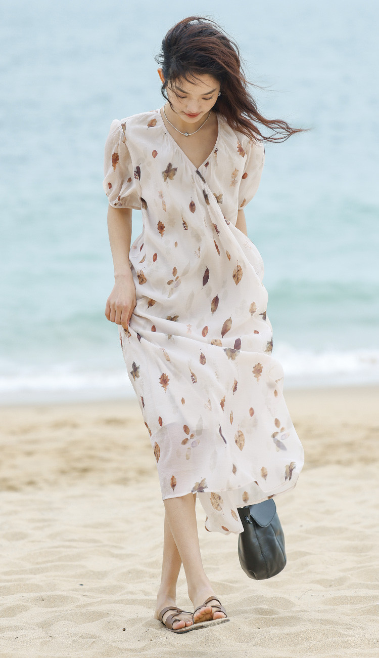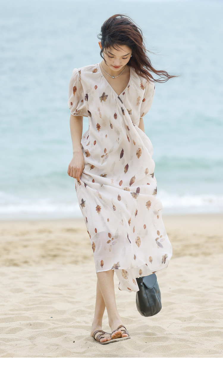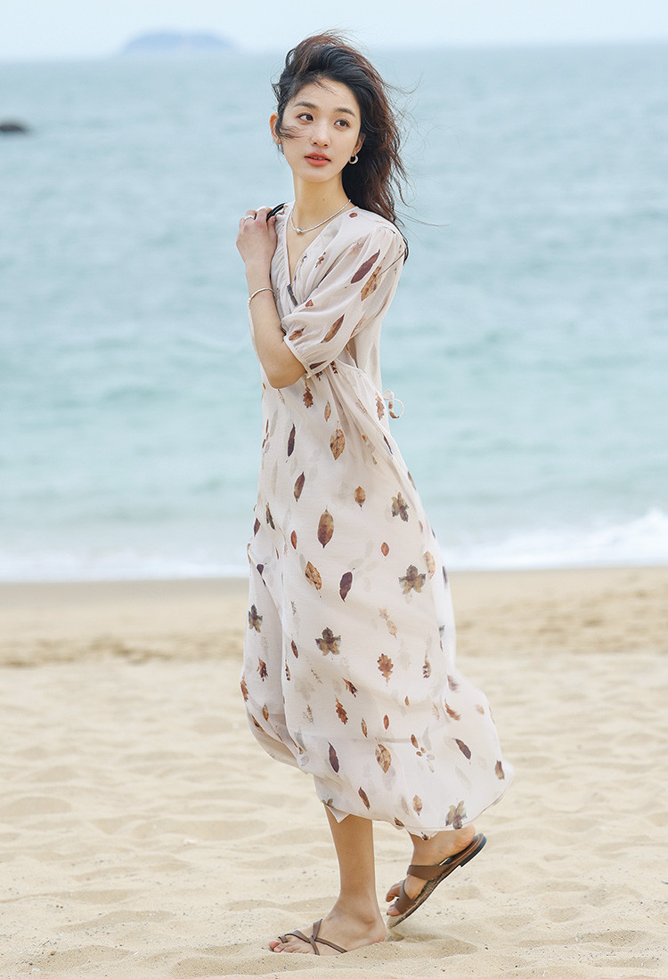 【新中式连衣裙】夏款交叉V领树叶印花个性小众舒适长裙 303170