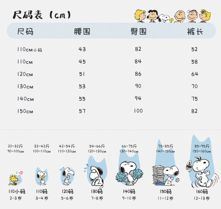 | 尺码 | 身高(cm) | 腰围(cm) | 裤长(cm) | 臀围(cm) | 适合年龄 | 号型 |