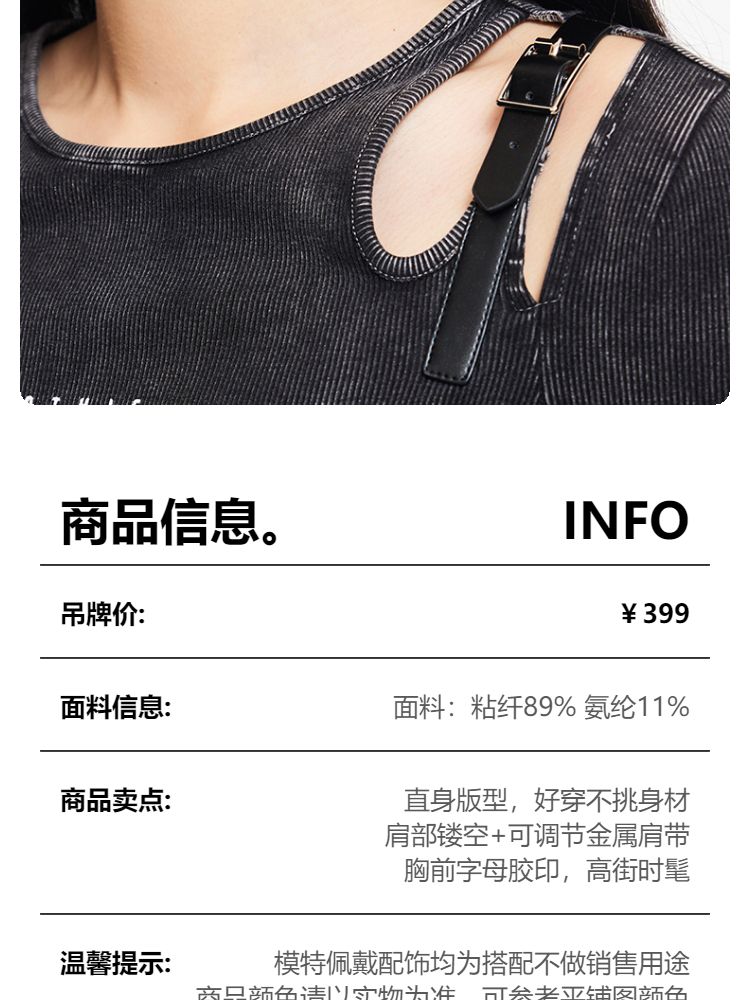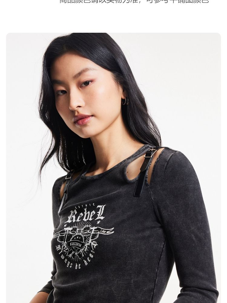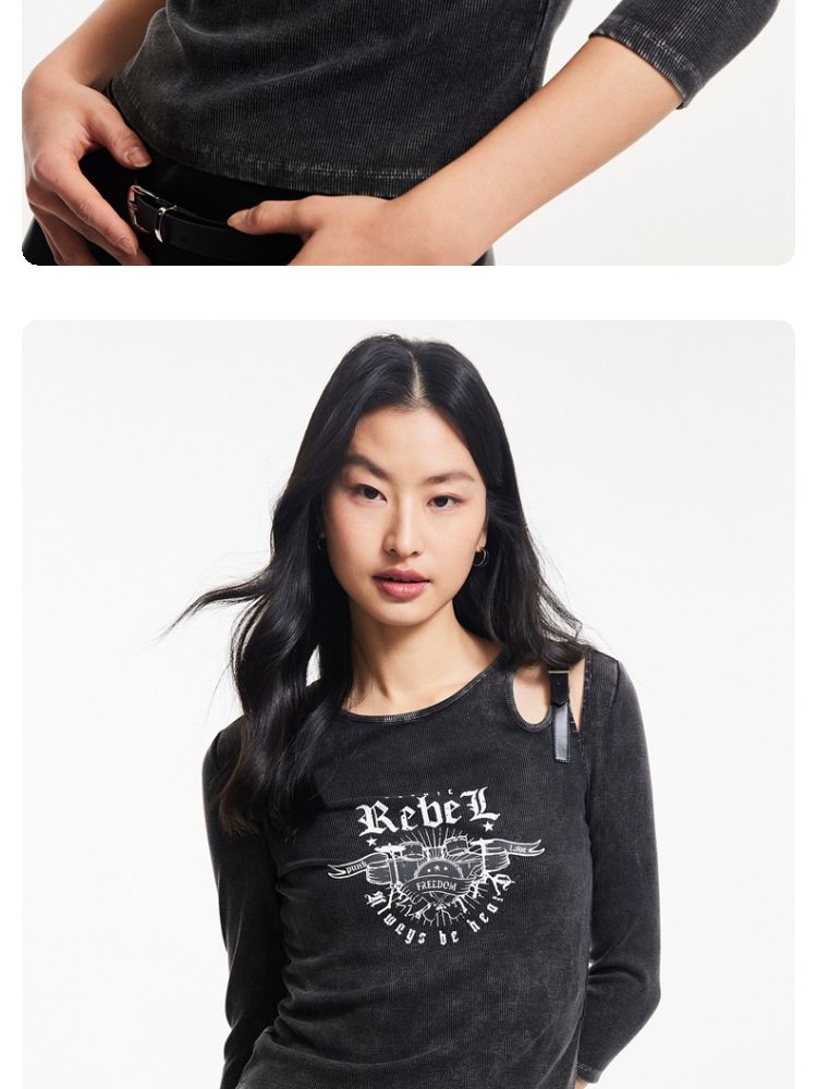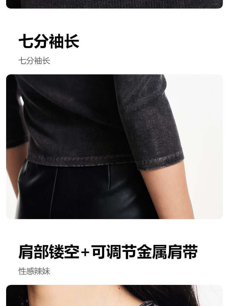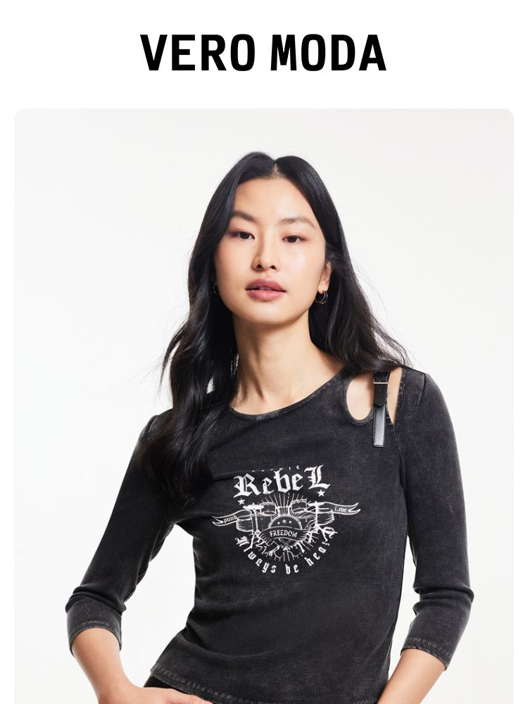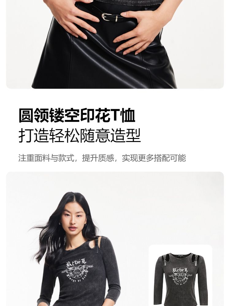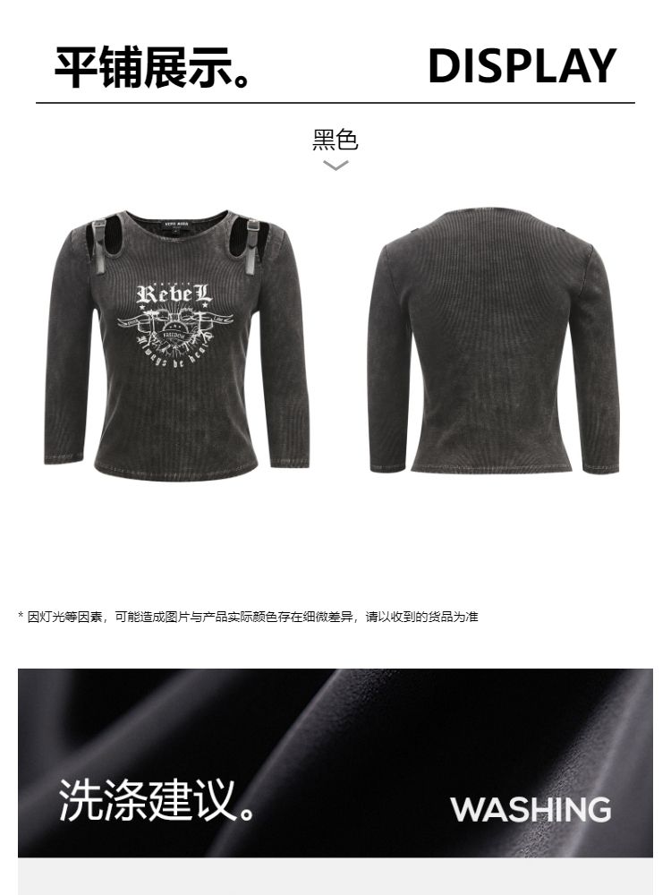 商品名称:T恤女圆领镂空印花七分袖做旧复古时髦辣妹 068433