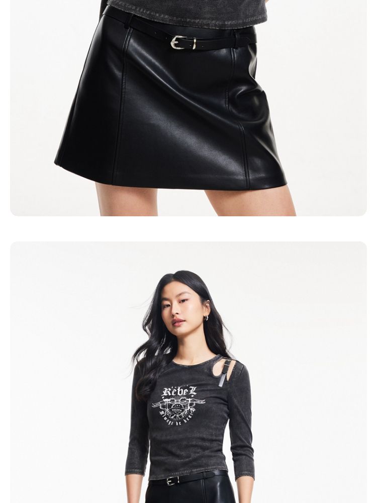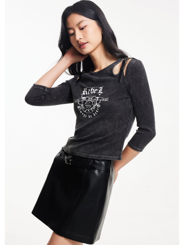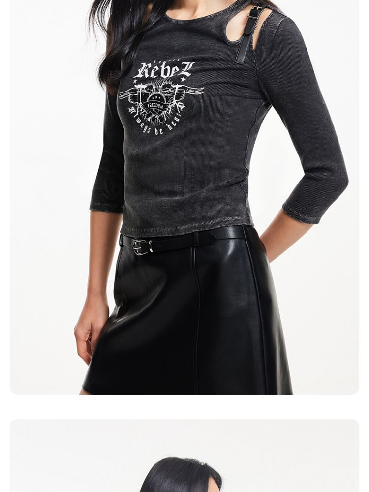 T恤女圆领镂空印花七分袖做旧复古时髦辣妹 068433