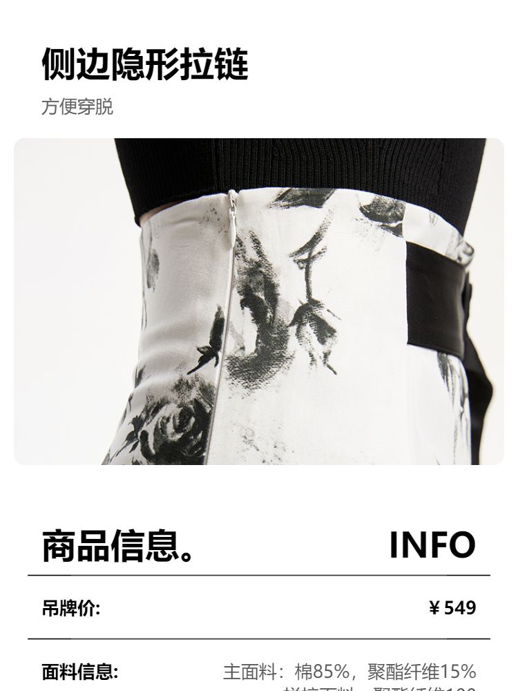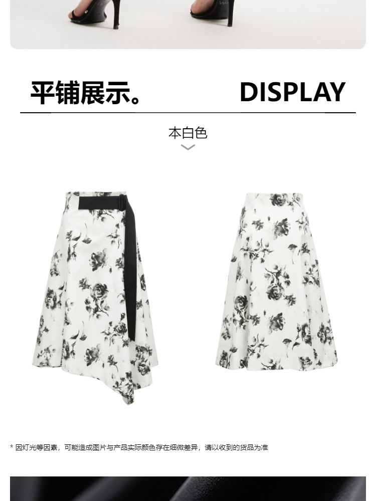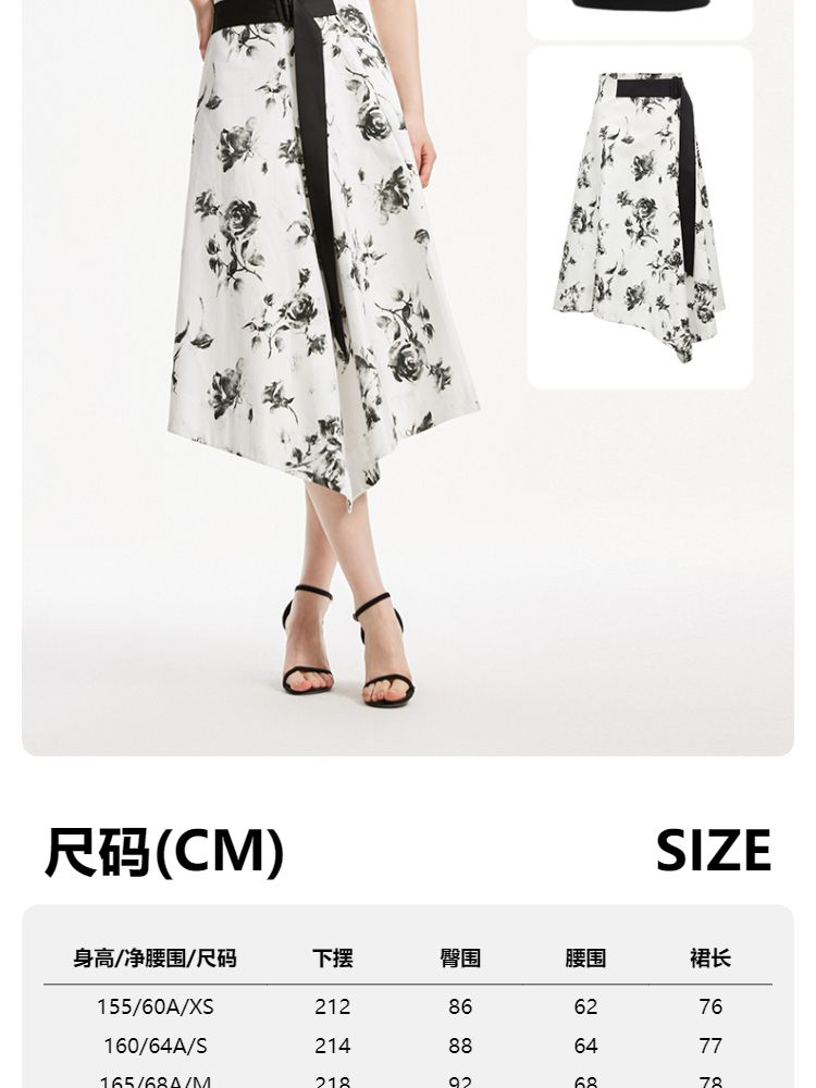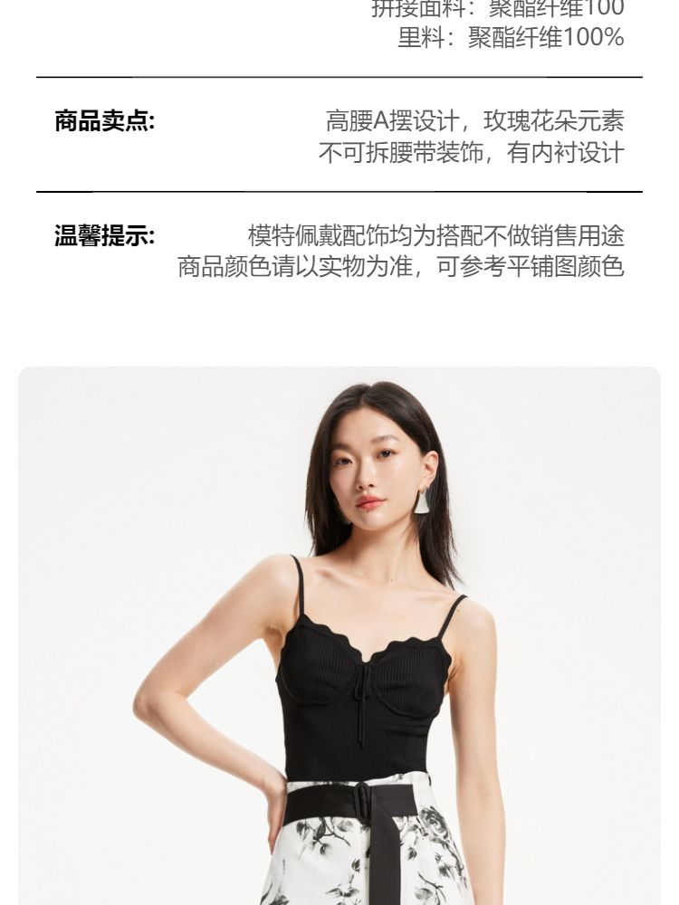 商品名称:【高腰A摆设计】夏半身裙女玫瑰印花收腰A摆钻石领中长裙 007441