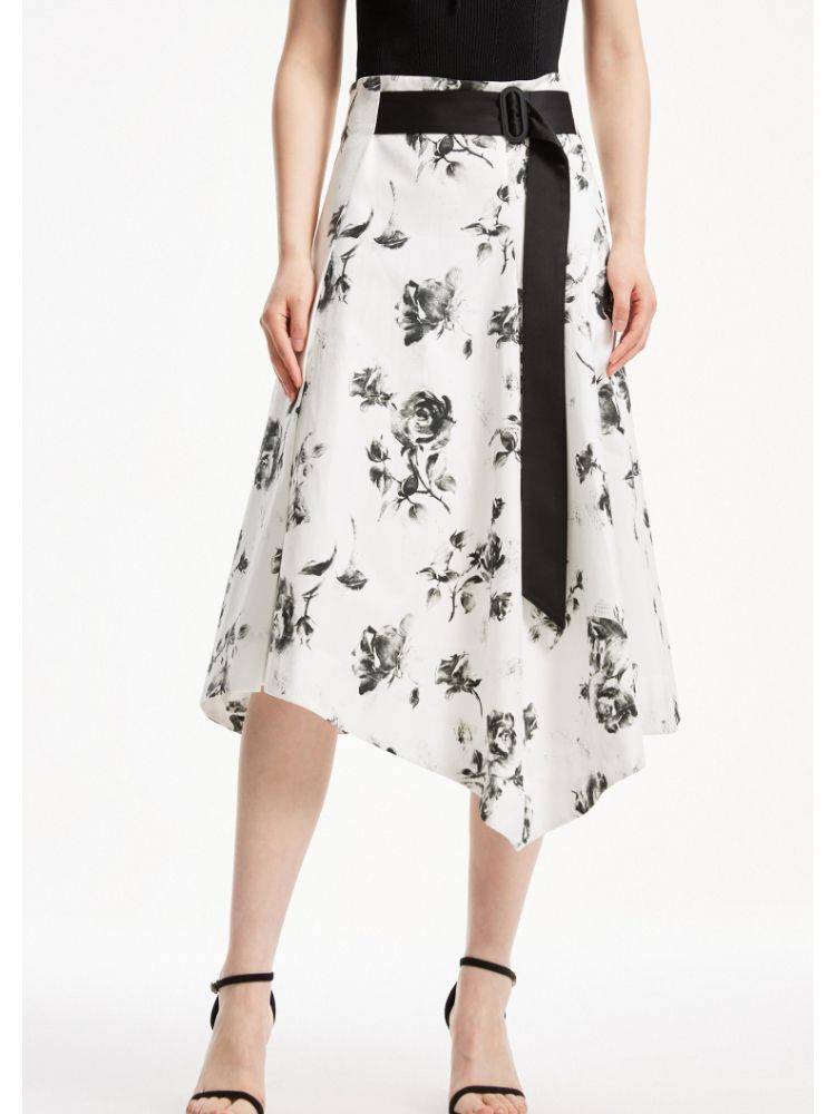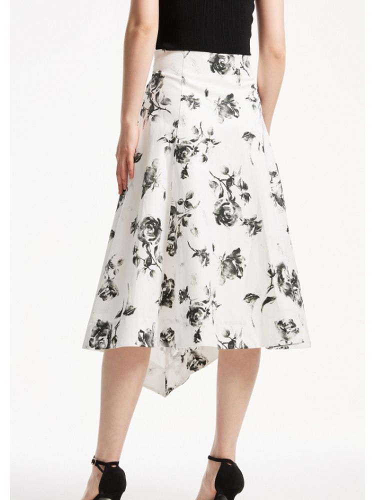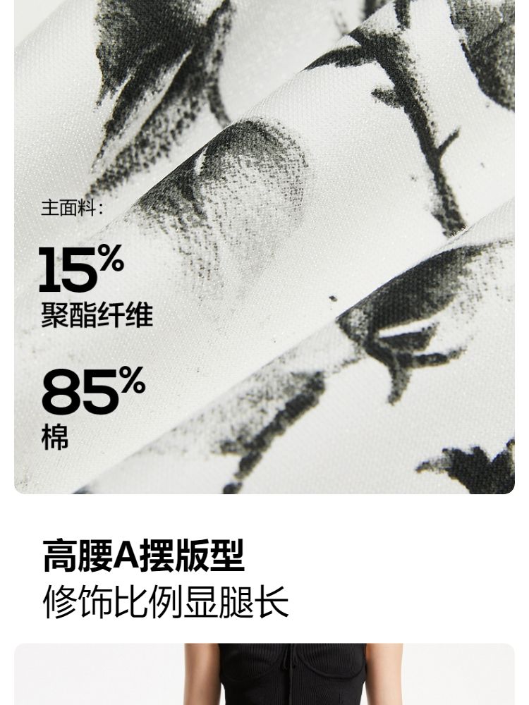 【高腰A摆设计】夏半身裙女玫瑰印花收腰A摆钻石领中长裙 007441