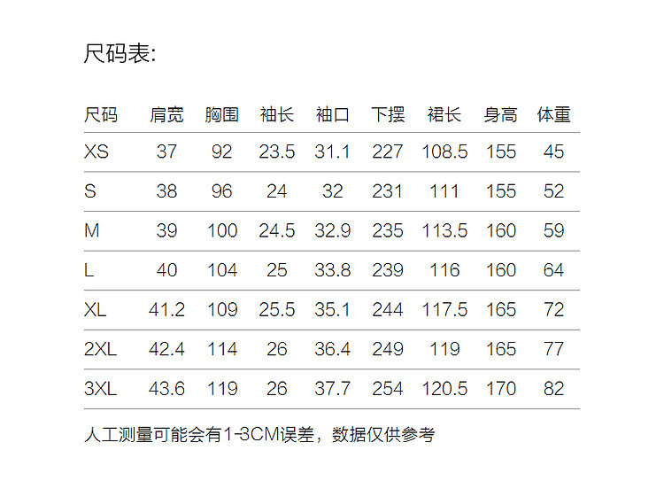 | XS | 108.5 | 37 | 宽松版 | 23.5 | 88 | 150/76A |