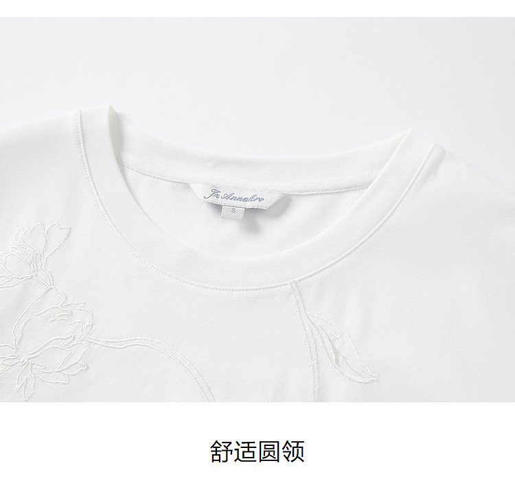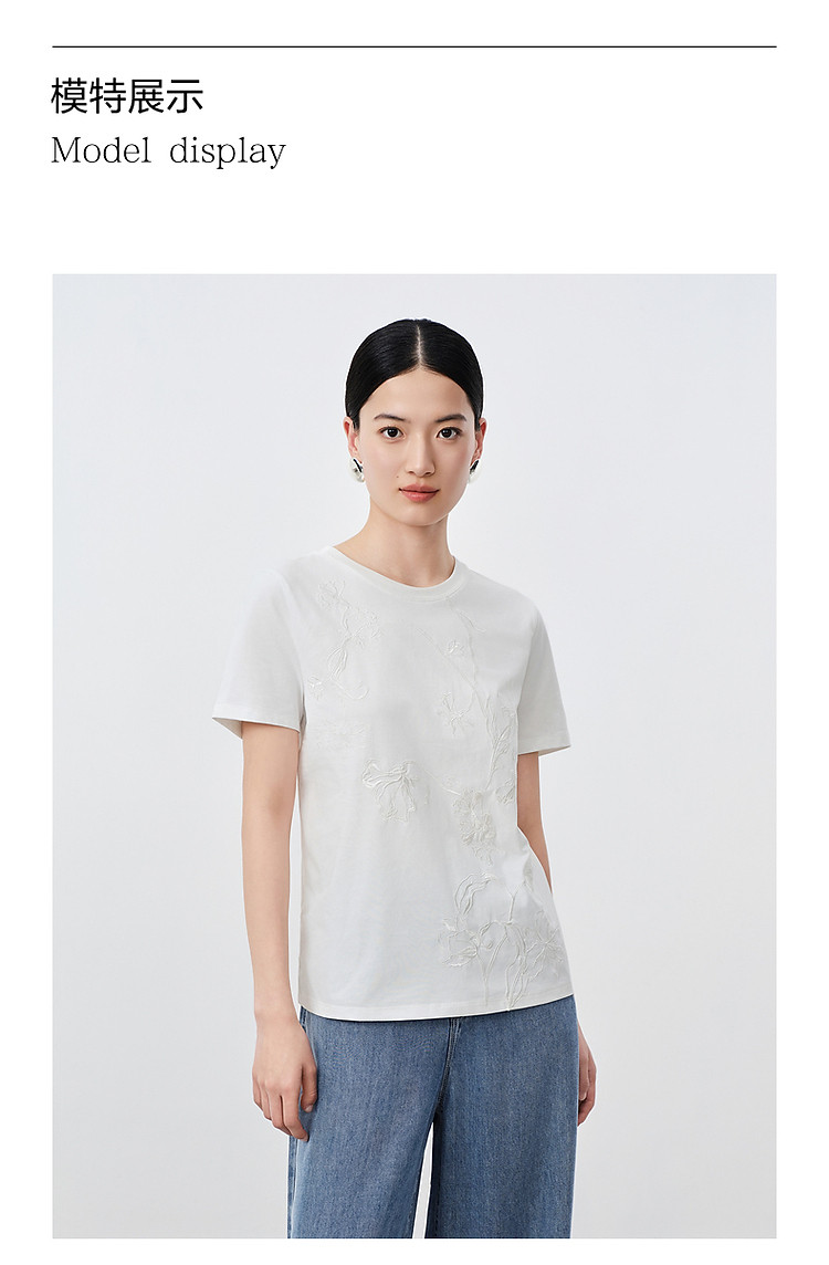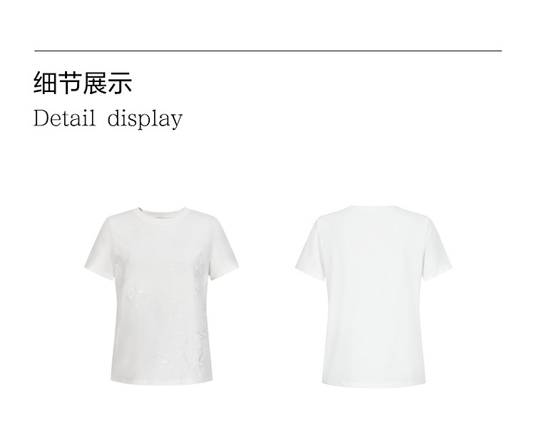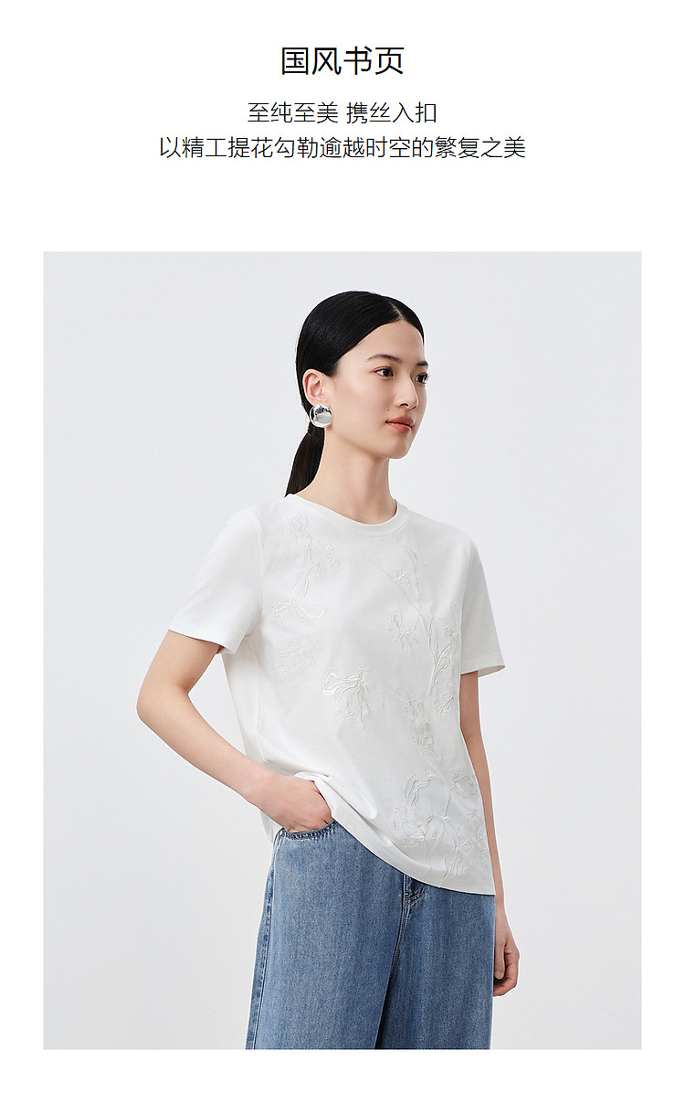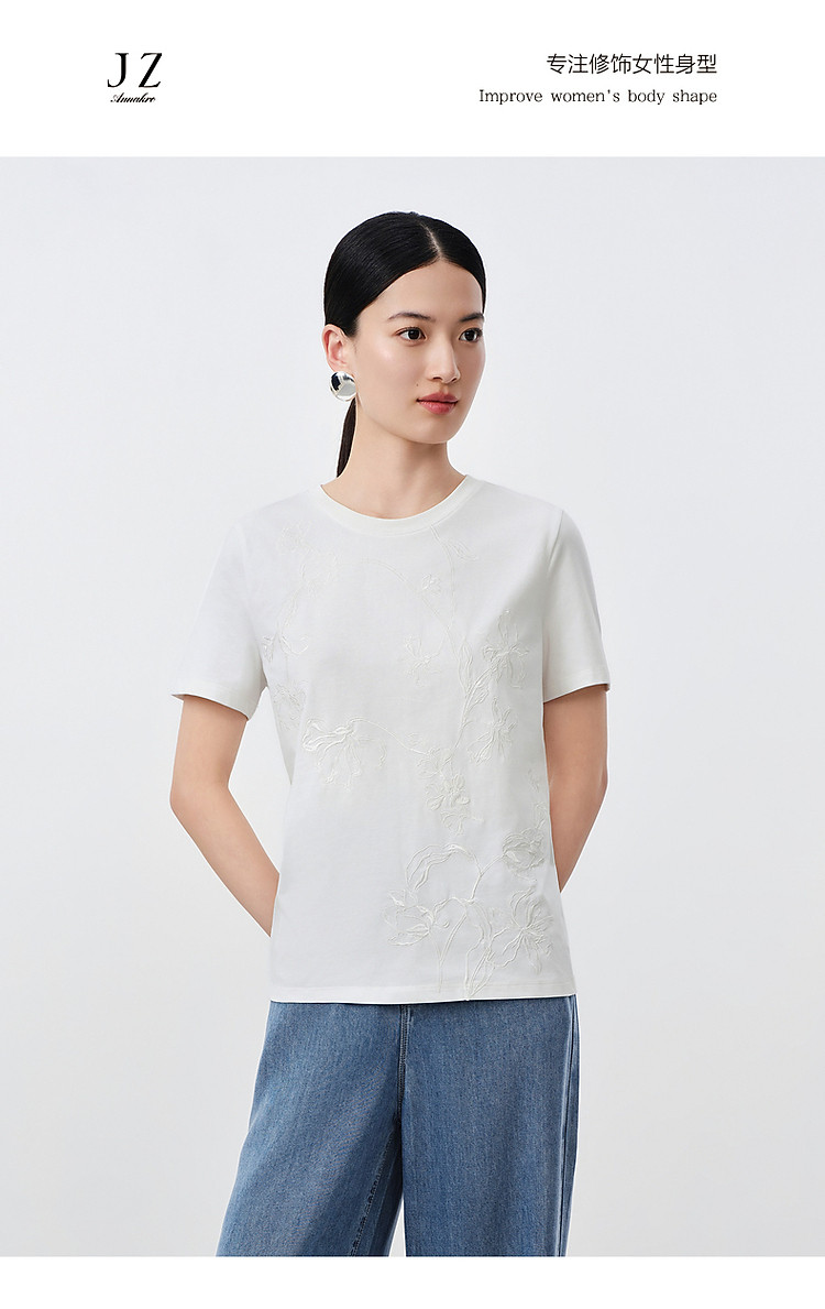 商品名称:玖姿旗下安娜蔻系列简约绣花丝光棉正肩舒适短袖T恤女 654284