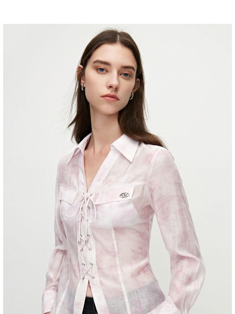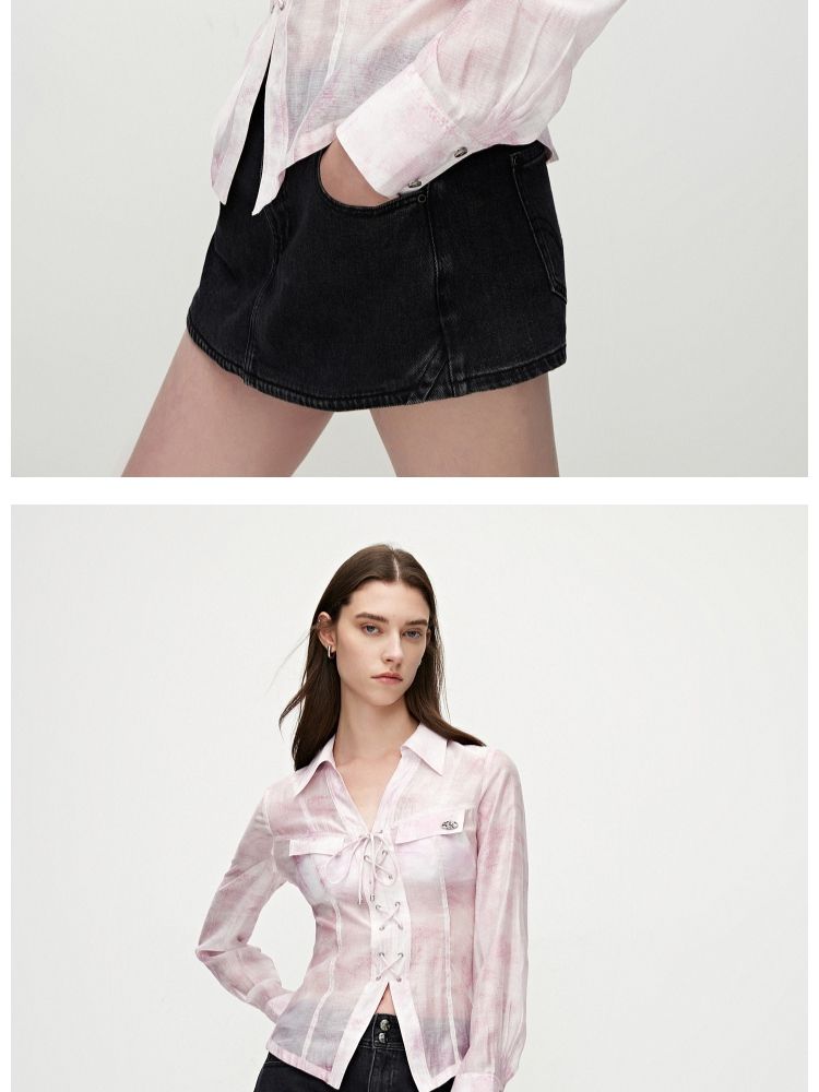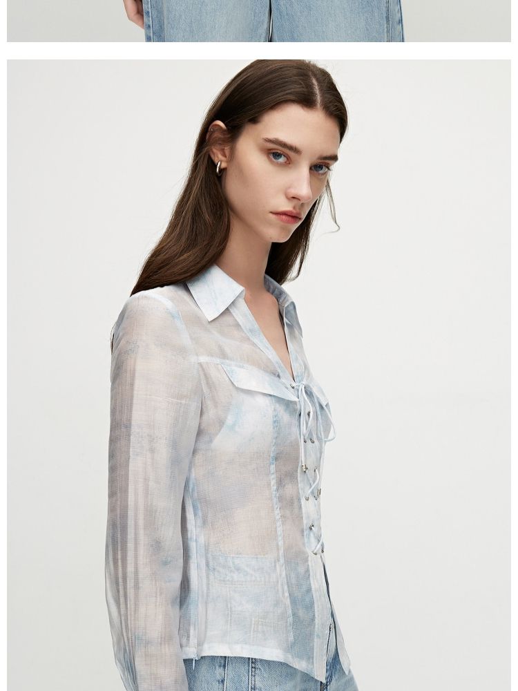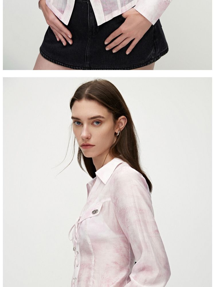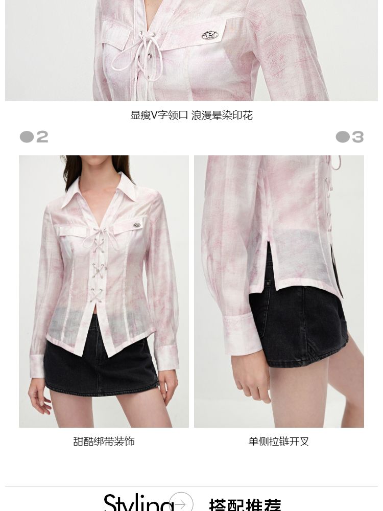 【甜酷设计】夏季含莱赛尔甜酷设计感绑带晕染印花薄款衬衫女 766746