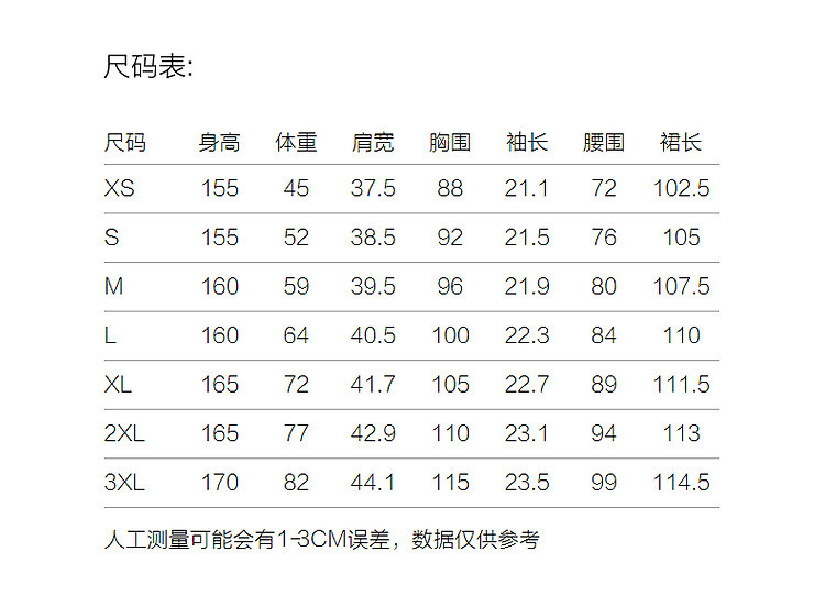 | 尺码 | 裙长(cm) | 肩宽(cm) | 腰围(cm) | 袖长(cm) | 胸围(cm) | 号型 |