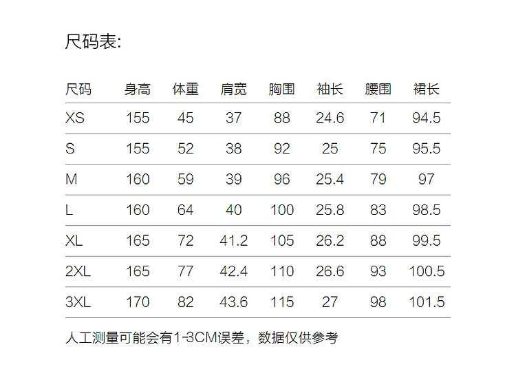 | 尺码 | 裙长(cm) | 肩宽(cm) | 腰围(cm) | 袖长(cm) | 胸围(cm) | 号型 |