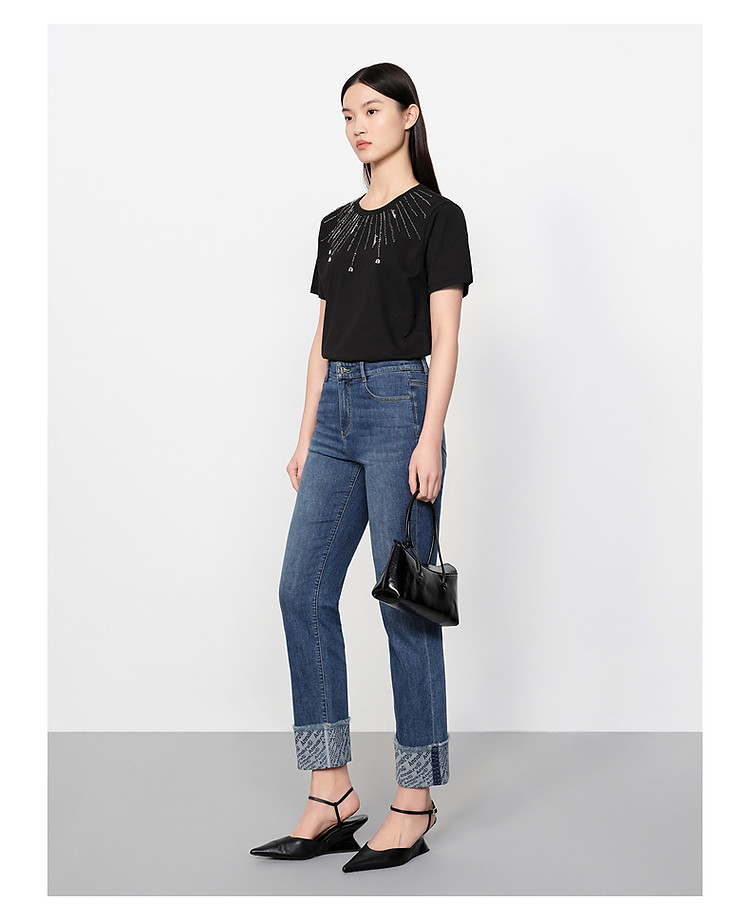 玖姿旗下安娜蔻系列花漾星辰简约珠片钉珠宽松上衣T恤女 795084