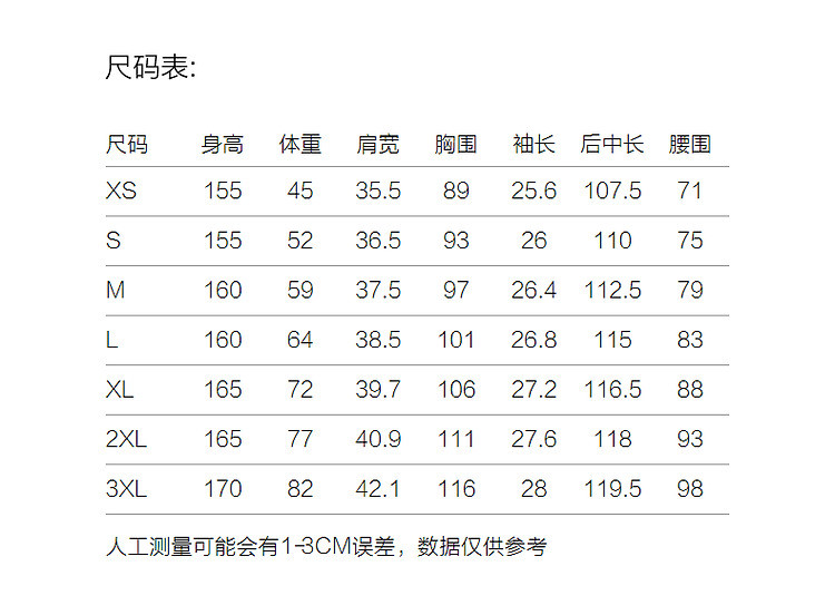 | 尺码 | 裙长(cm) | 肩宽(cm) | 腰围(cm) | 袖长(cm) | 胸围(cm) | 号型 |