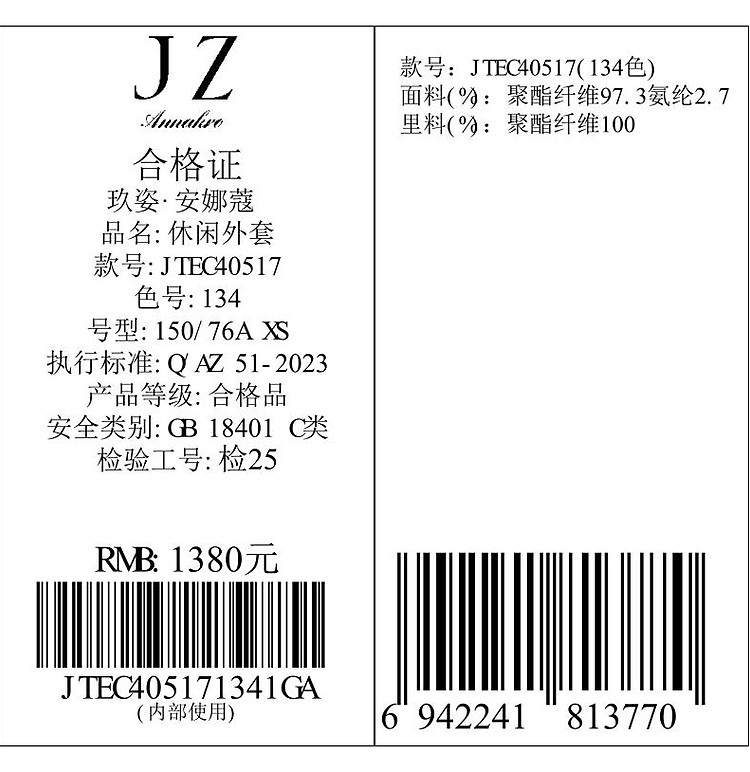 商品名称:玖姿旗下安娜蔻系列复古休闲老钱风印花外套女春季 738188