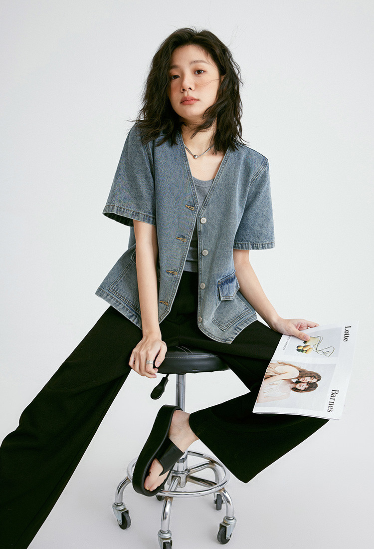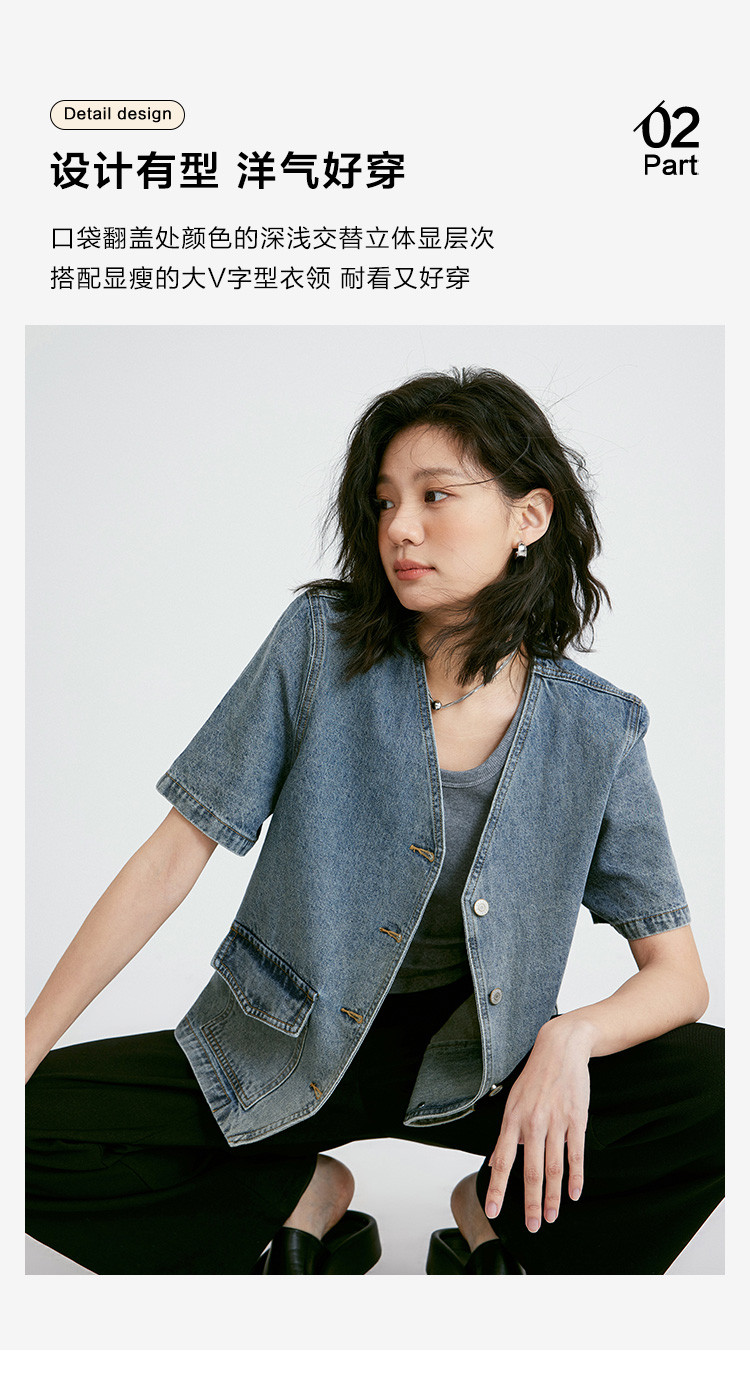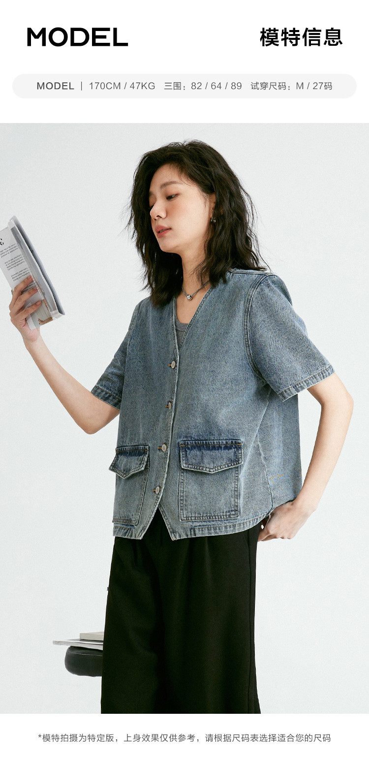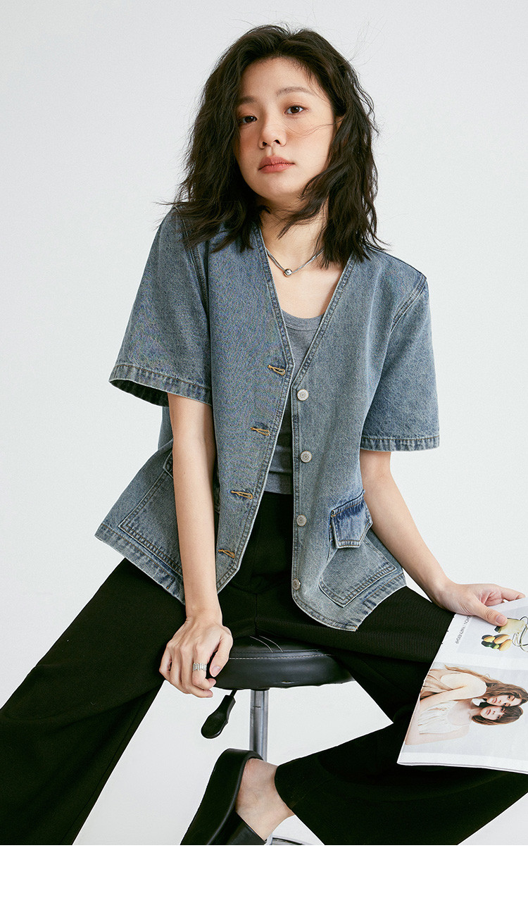 【V领牛仔外套】夏款酷帅街头风气质正肩袖复古外套女 256514