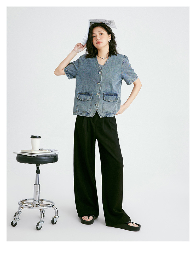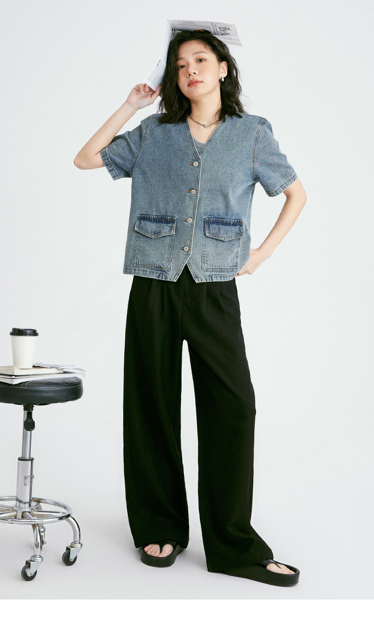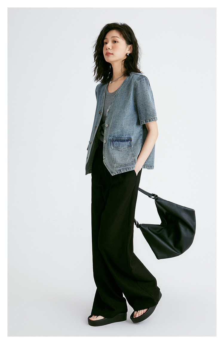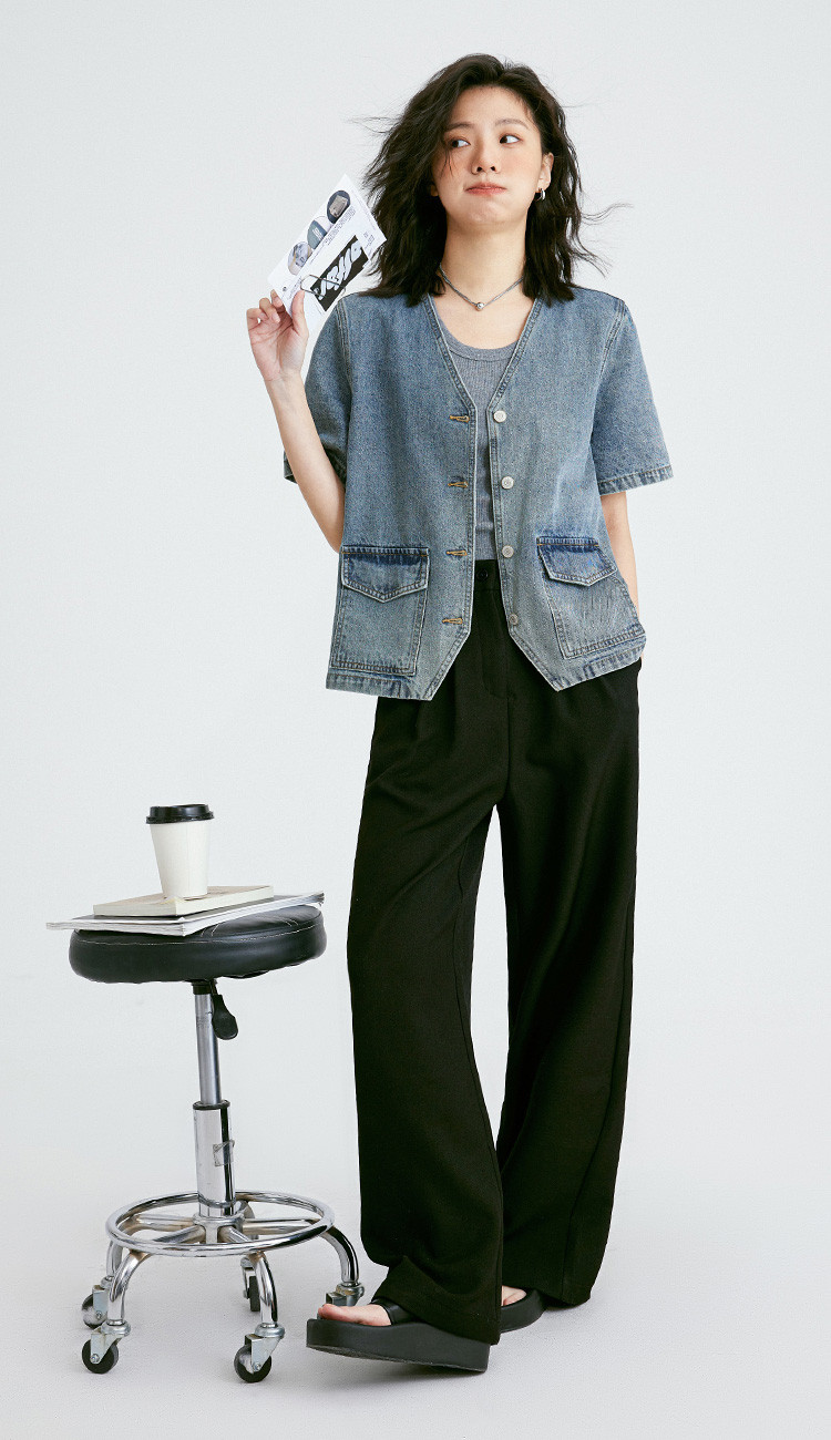 【V领牛仔外套】夏款酷帅街头风气质正肩袖复古外套女 256514