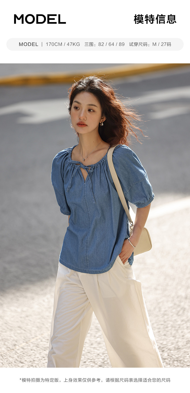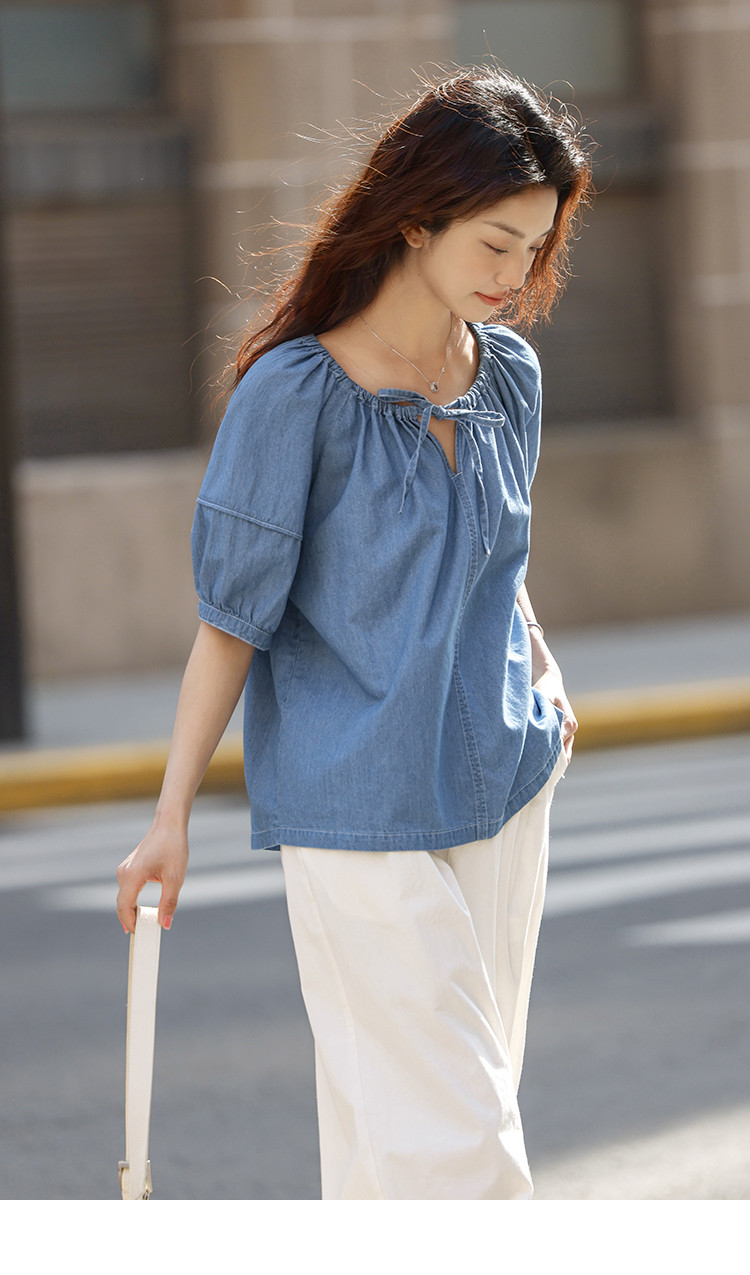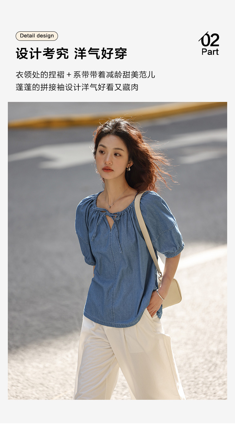 【学院风泡泡袖牛仔衬衫】夏款圆领抽绳连肩袖牛仔小衫女 040514