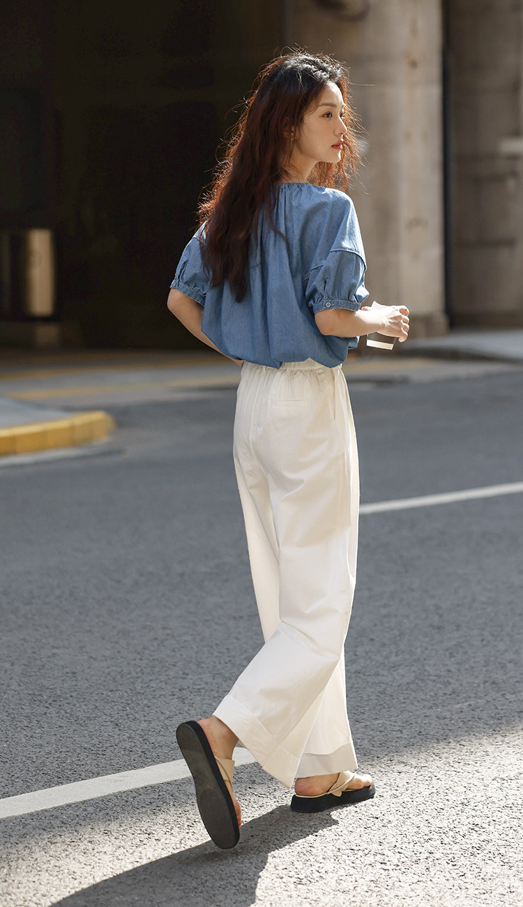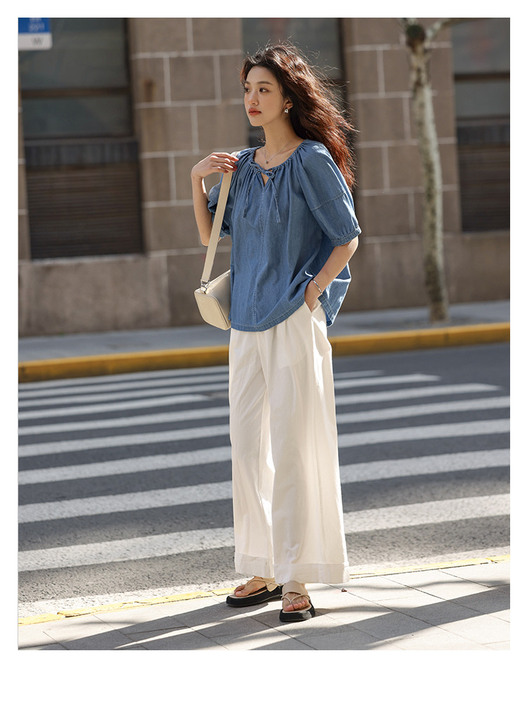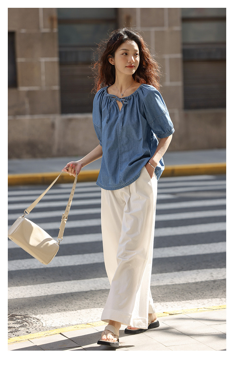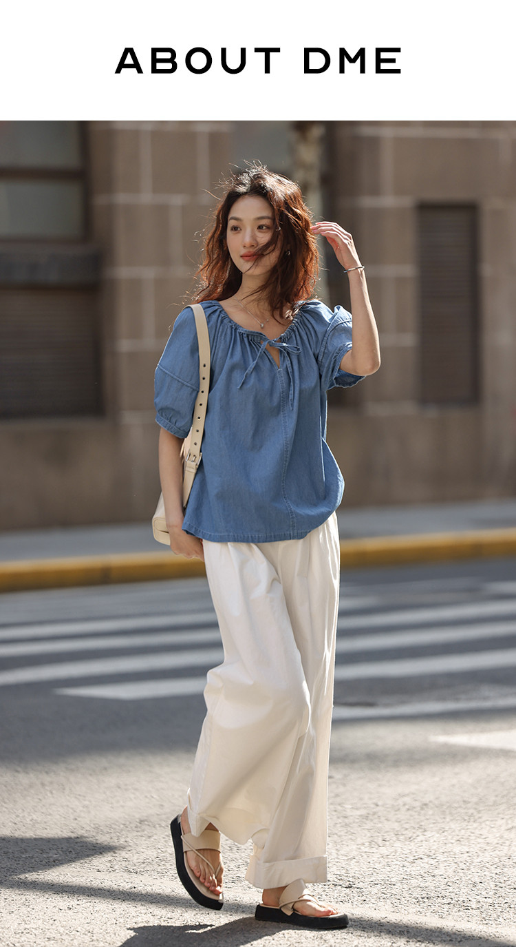 【学院风泡泡袖牛仔衬衫】夏款圆领抽绳连肩袖牛仔小衫女 040514