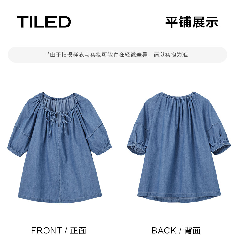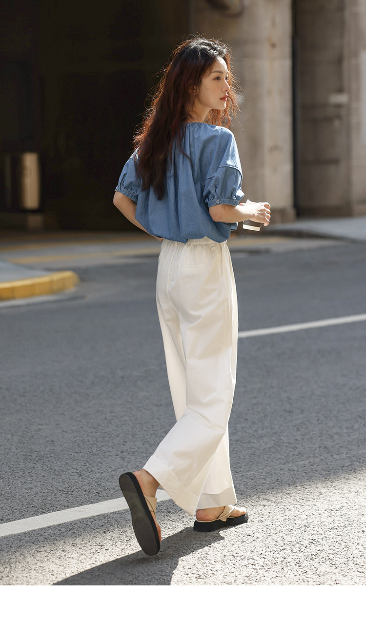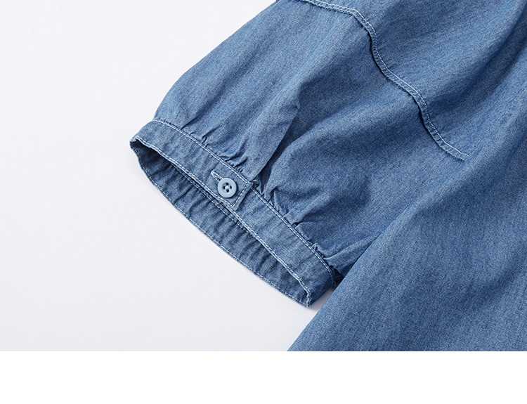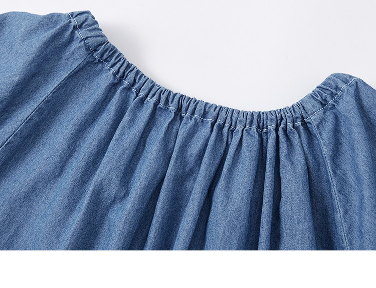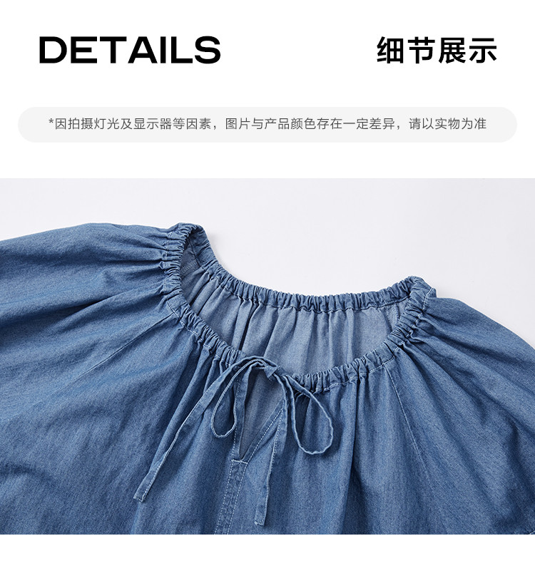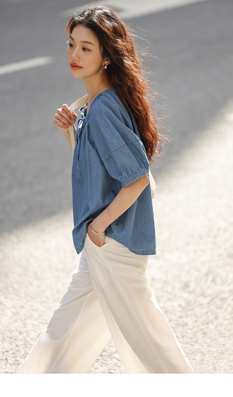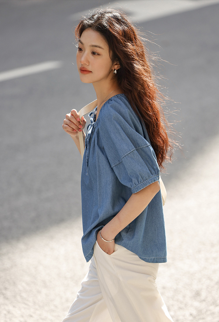 商品名称:【学院风泡泡袖牛仔衬衫】夏款圆领抽绳连肩袖牛仔小衫女 040514