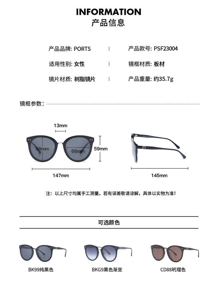 商品名称:PORTS女款日常时尚休闲猫眼板材太阳镜PSF23004 304010