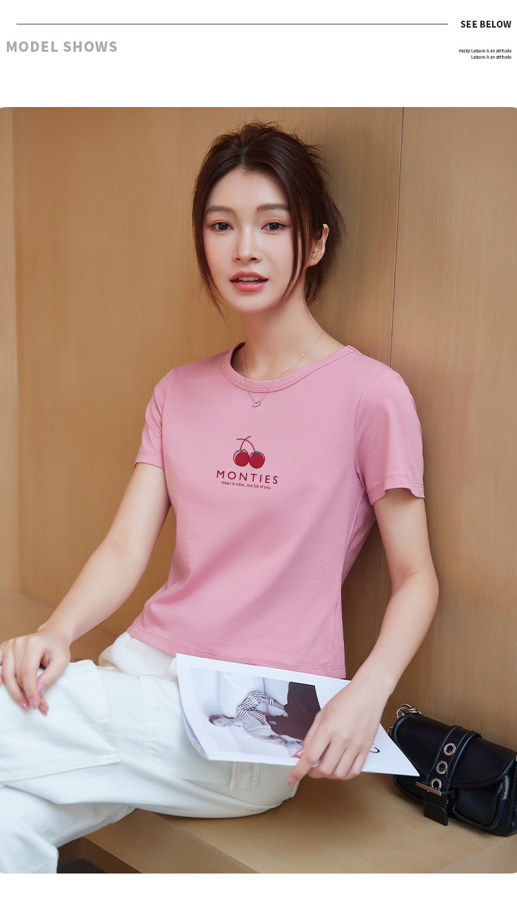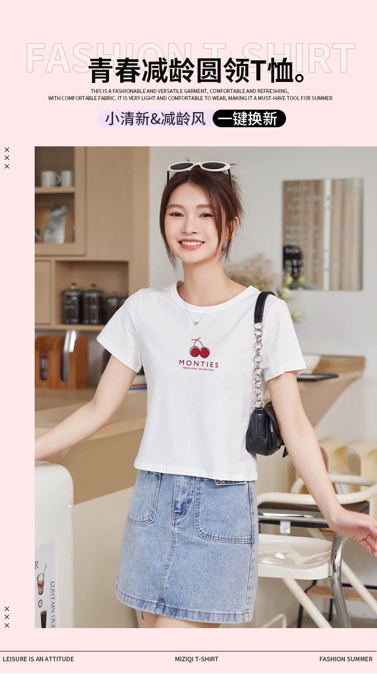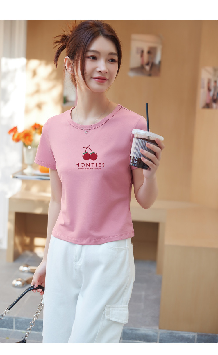 米子旗夏季圆领樱桃印花T恤女短款修身简约短袖上衣 010778