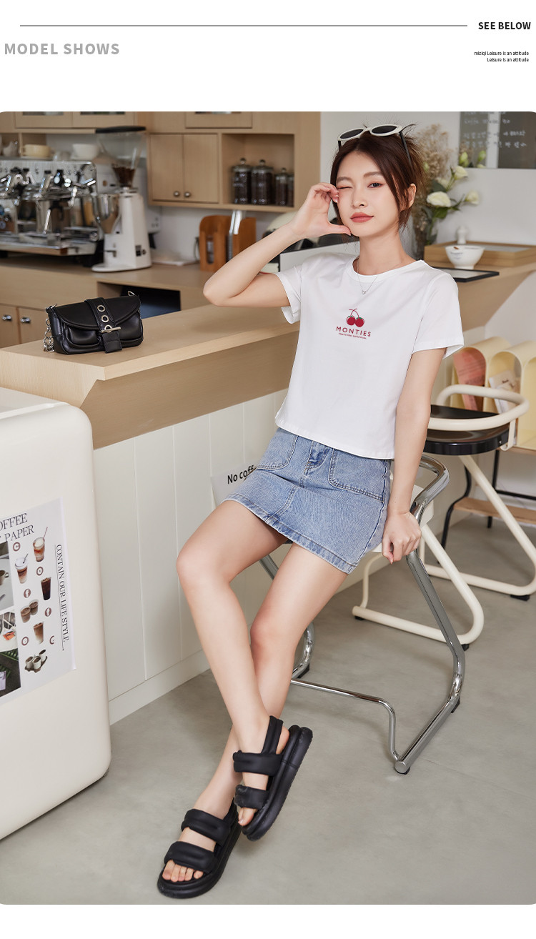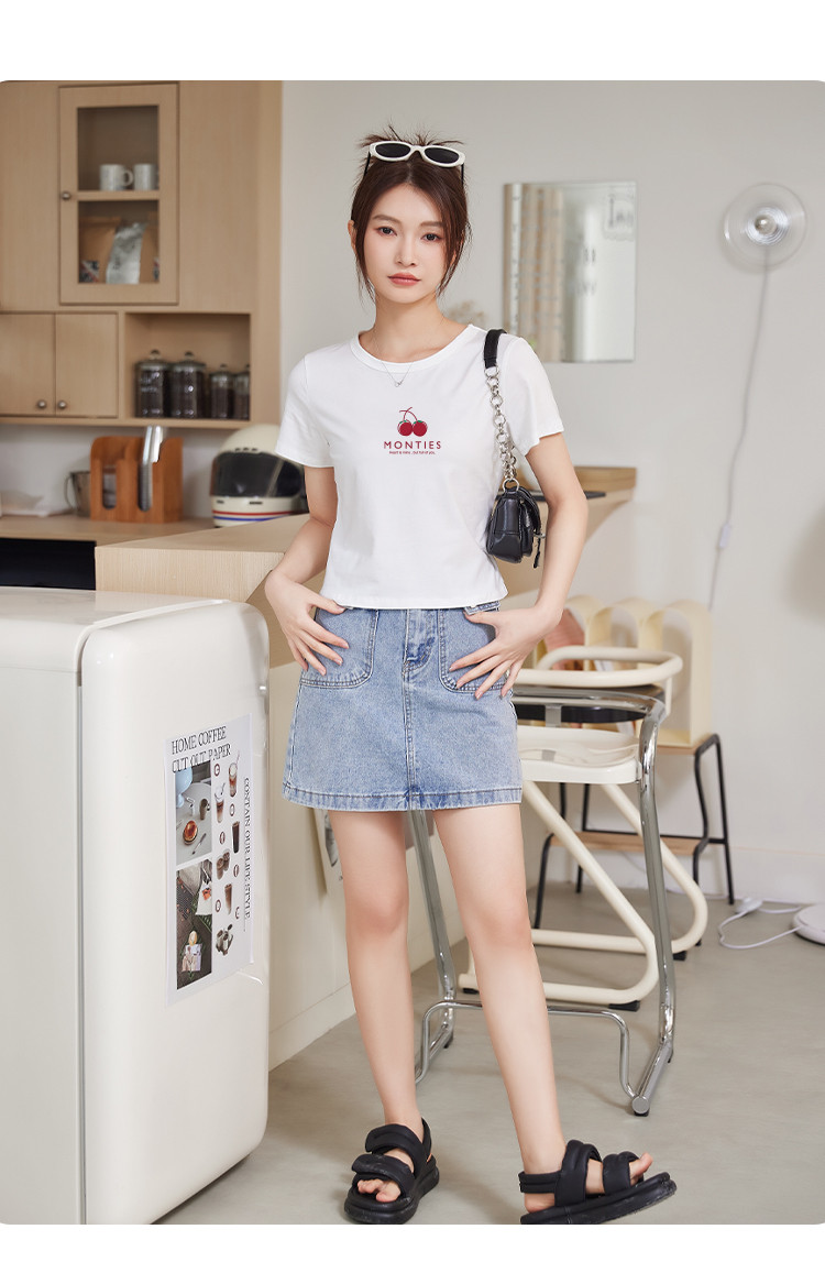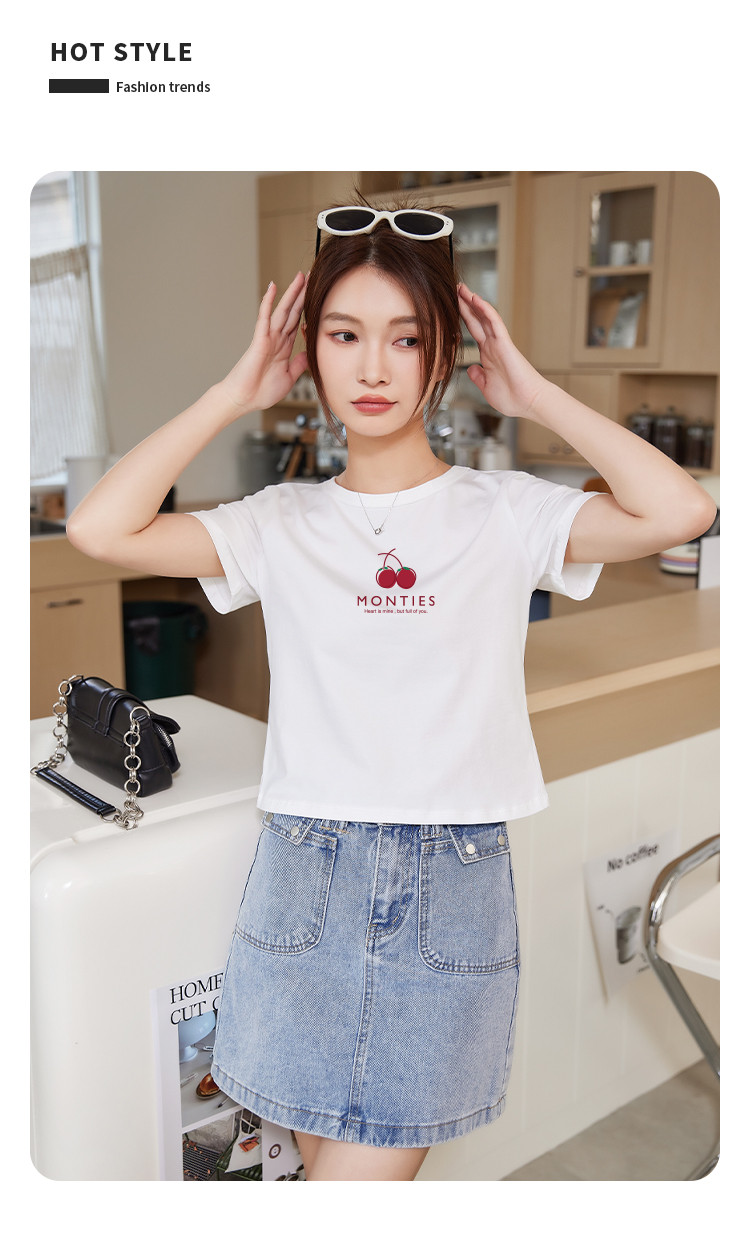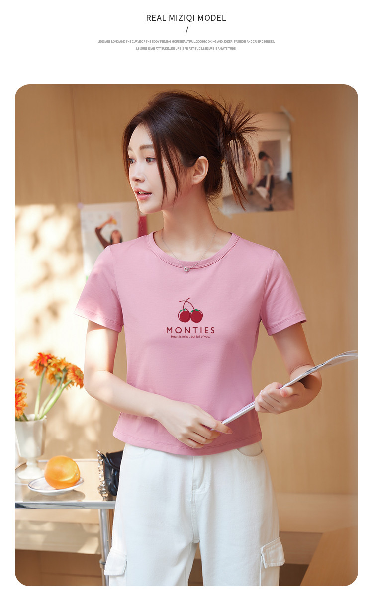 米子旗夏季圆领樱桃印花T恤女短款修身简约短袖上衣 010778