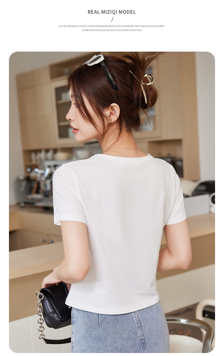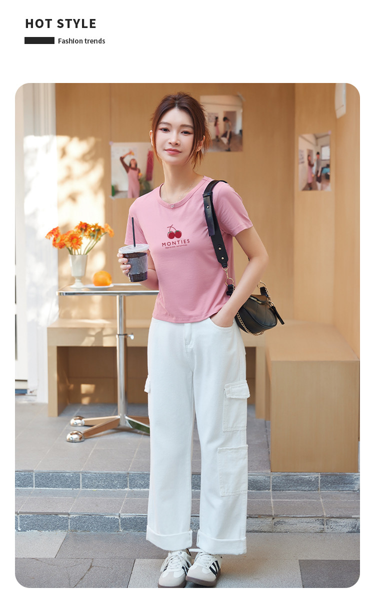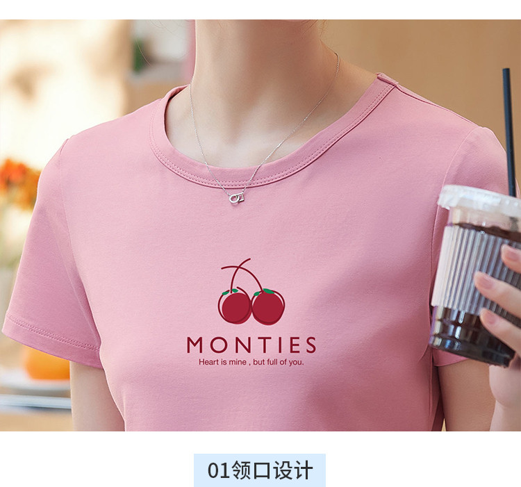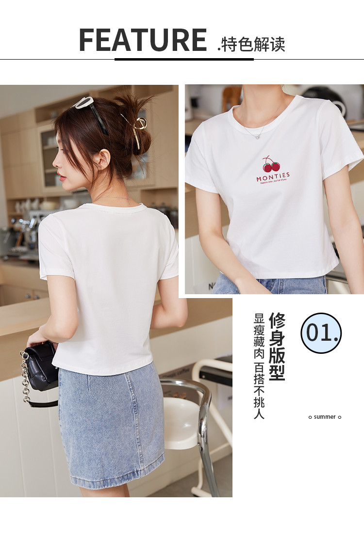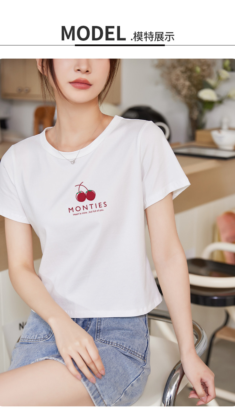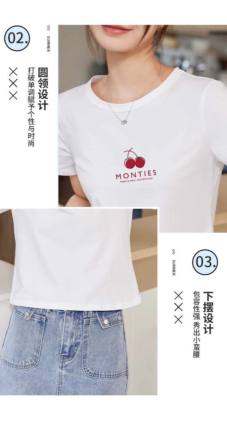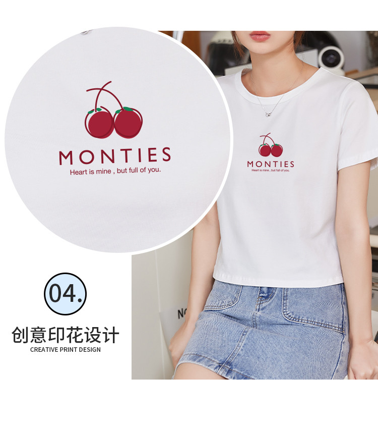 商品名称:米子旗夏季圆领樱桃印花T恤女短款修身简约短袖上衣 010778