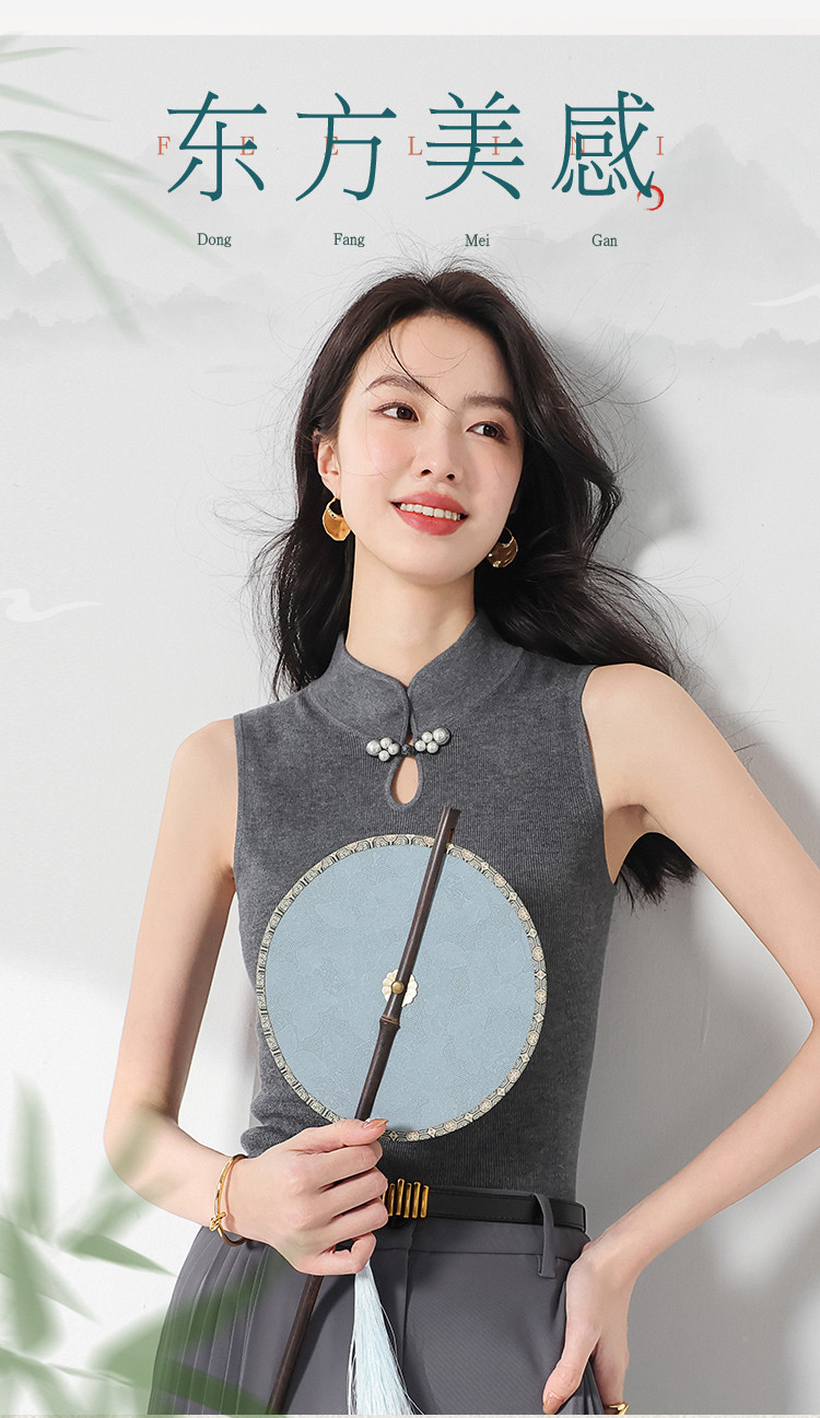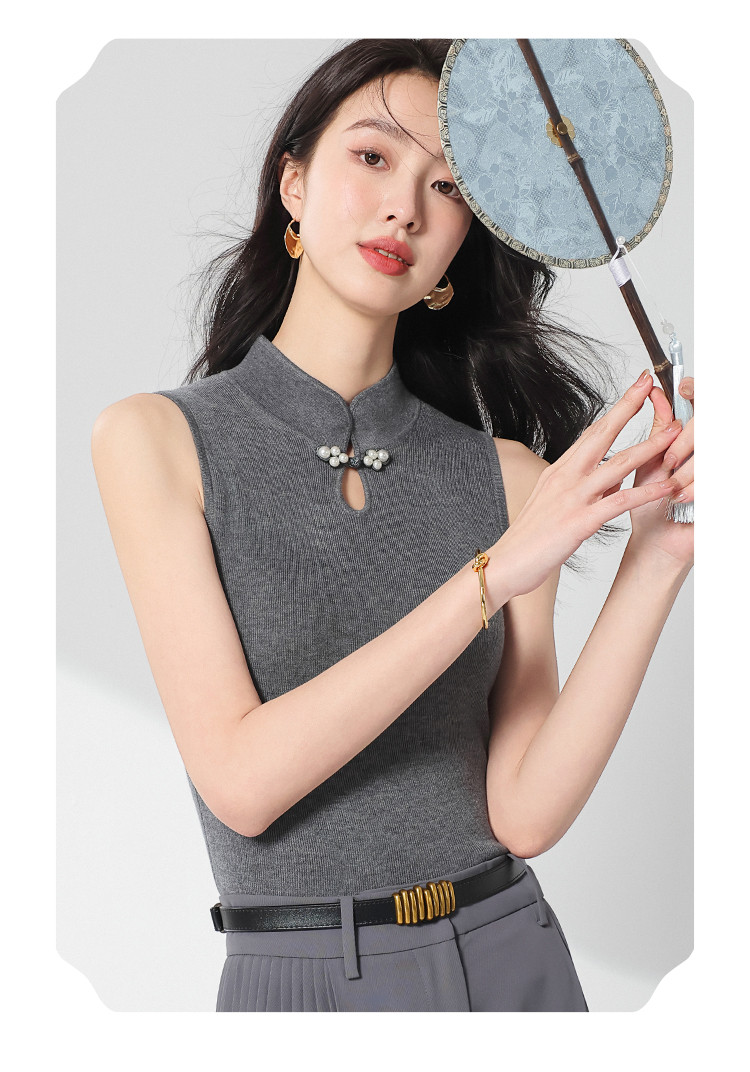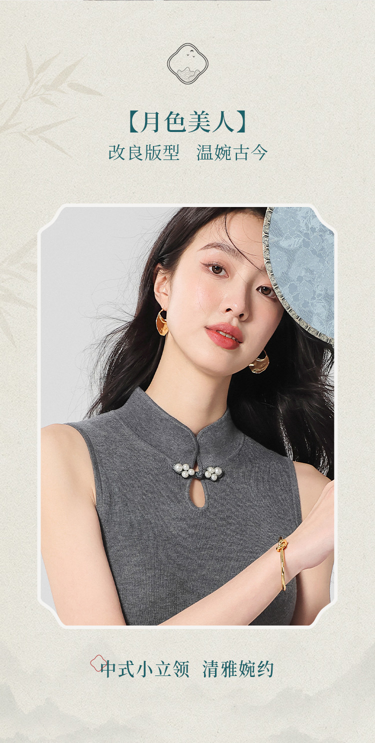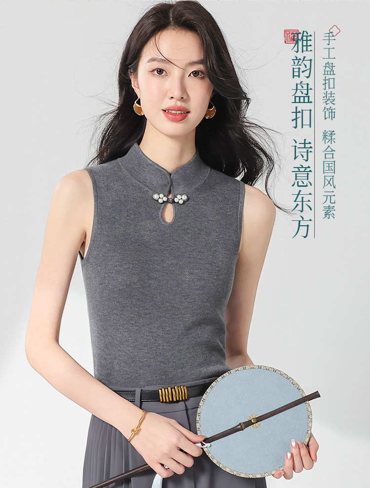 商品名称:【国风】新中式轻薄透气含桑蚕丝立领无袖针织打底衫背心夏款马甲 182675