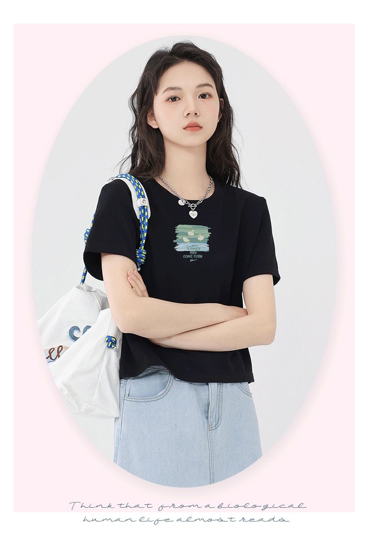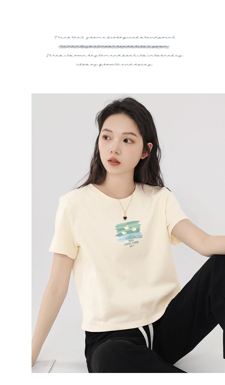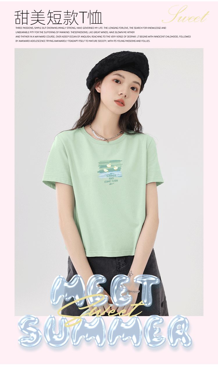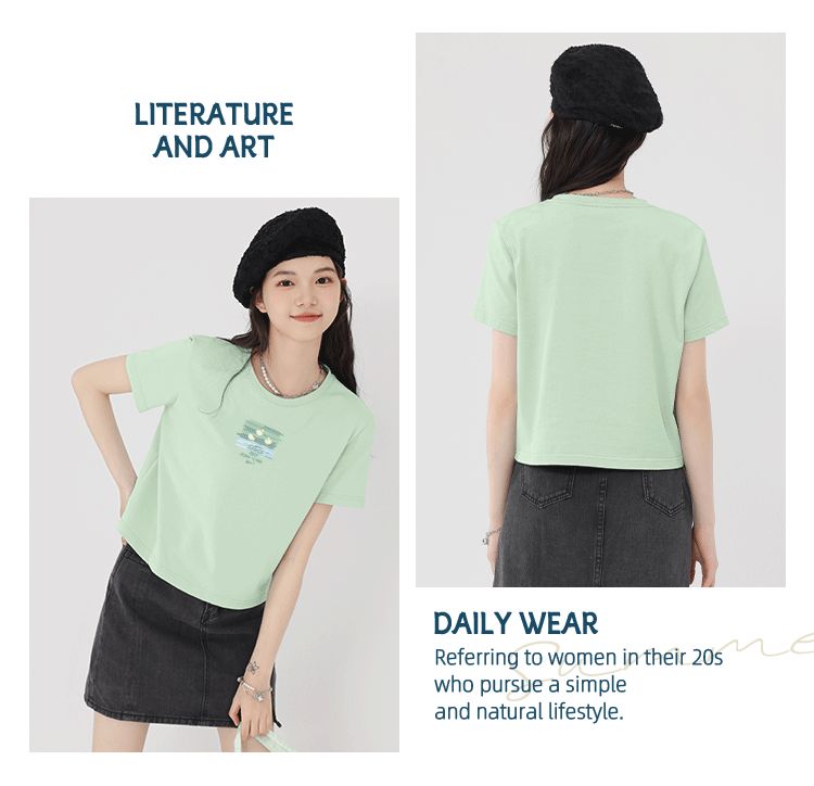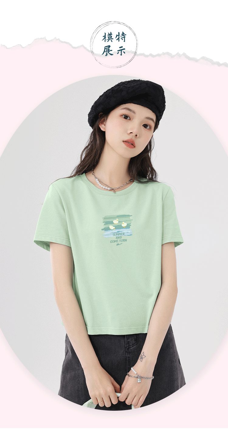 商品名称:【女装100%棉】夏季女式短袖休闲短款显瘦正肩设计感T恤 214675