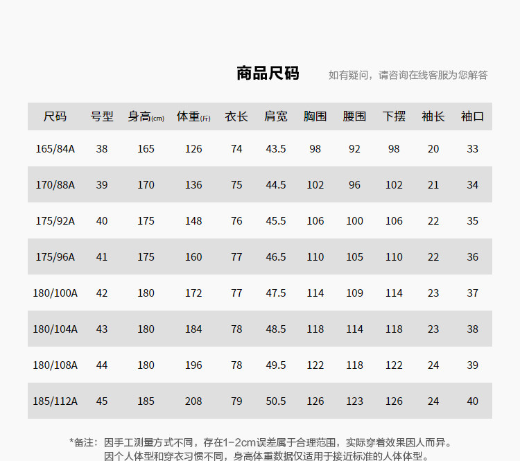 | 38(推荐58~63kg) | 74 | 43.5 | 92 | 20 | 98 | 98 | 165/84A |