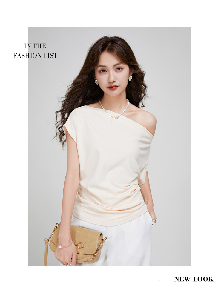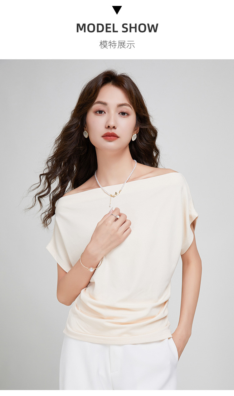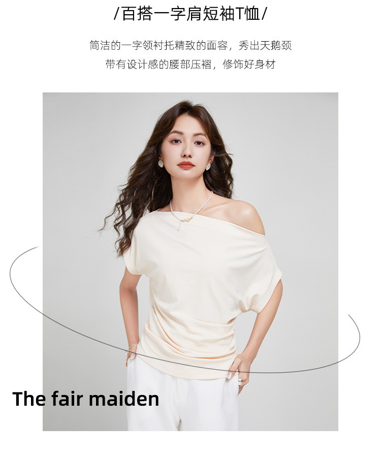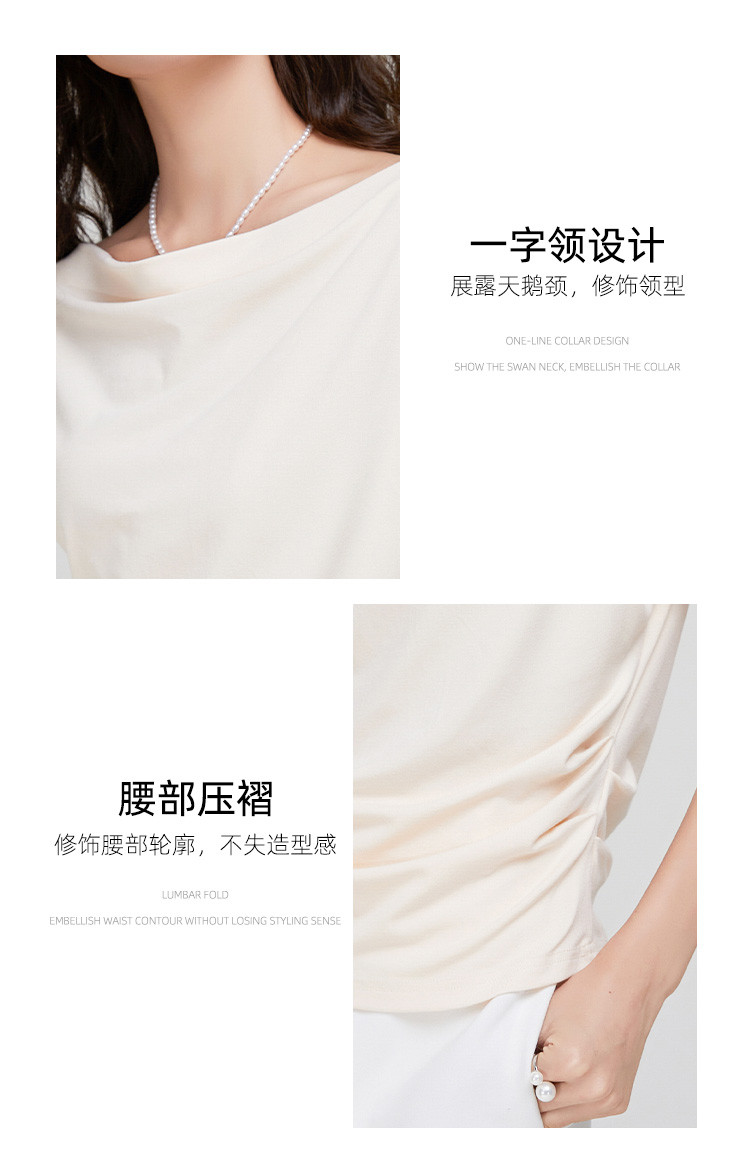 商品名称:高级感纯色一字领t恤女夏季法式设计斜肩露锁骨气质显瘦上衣 957464