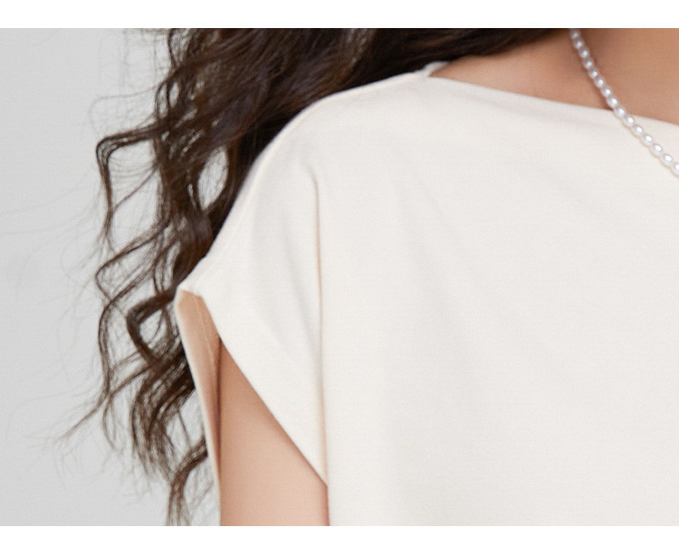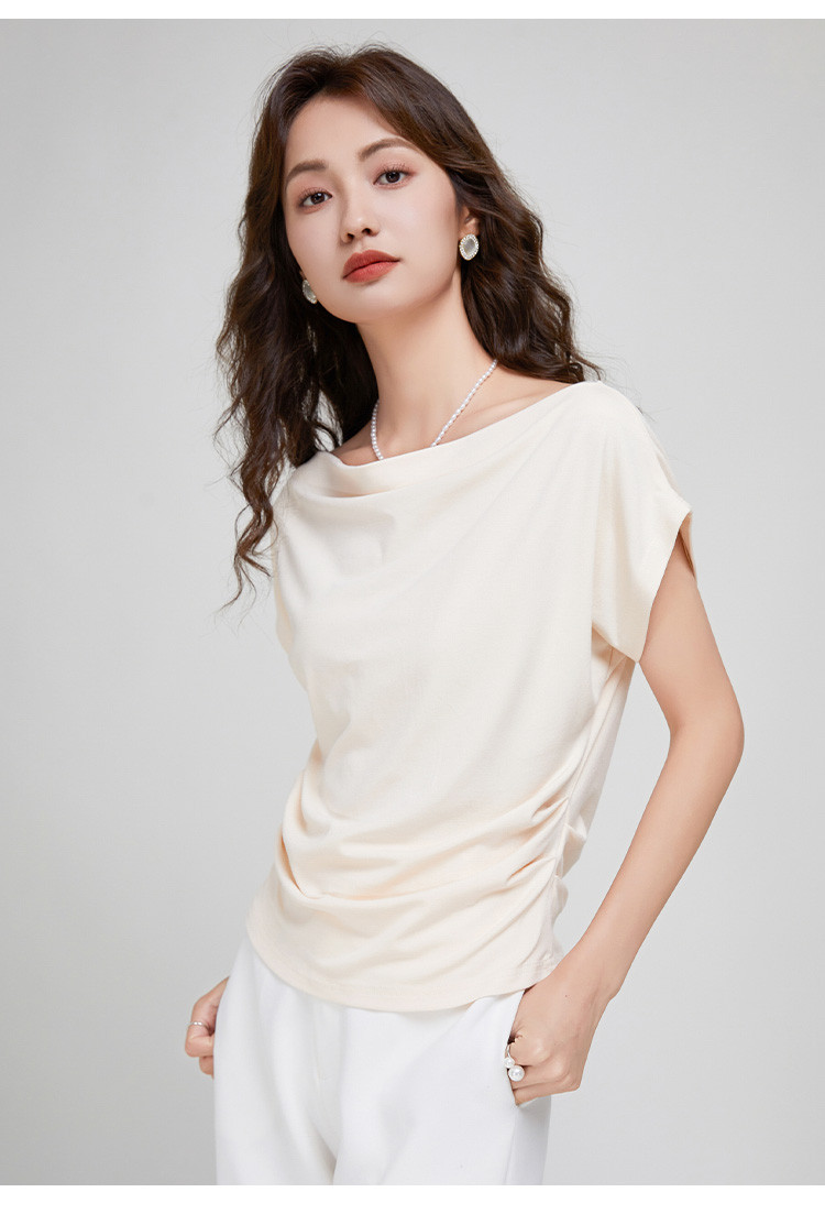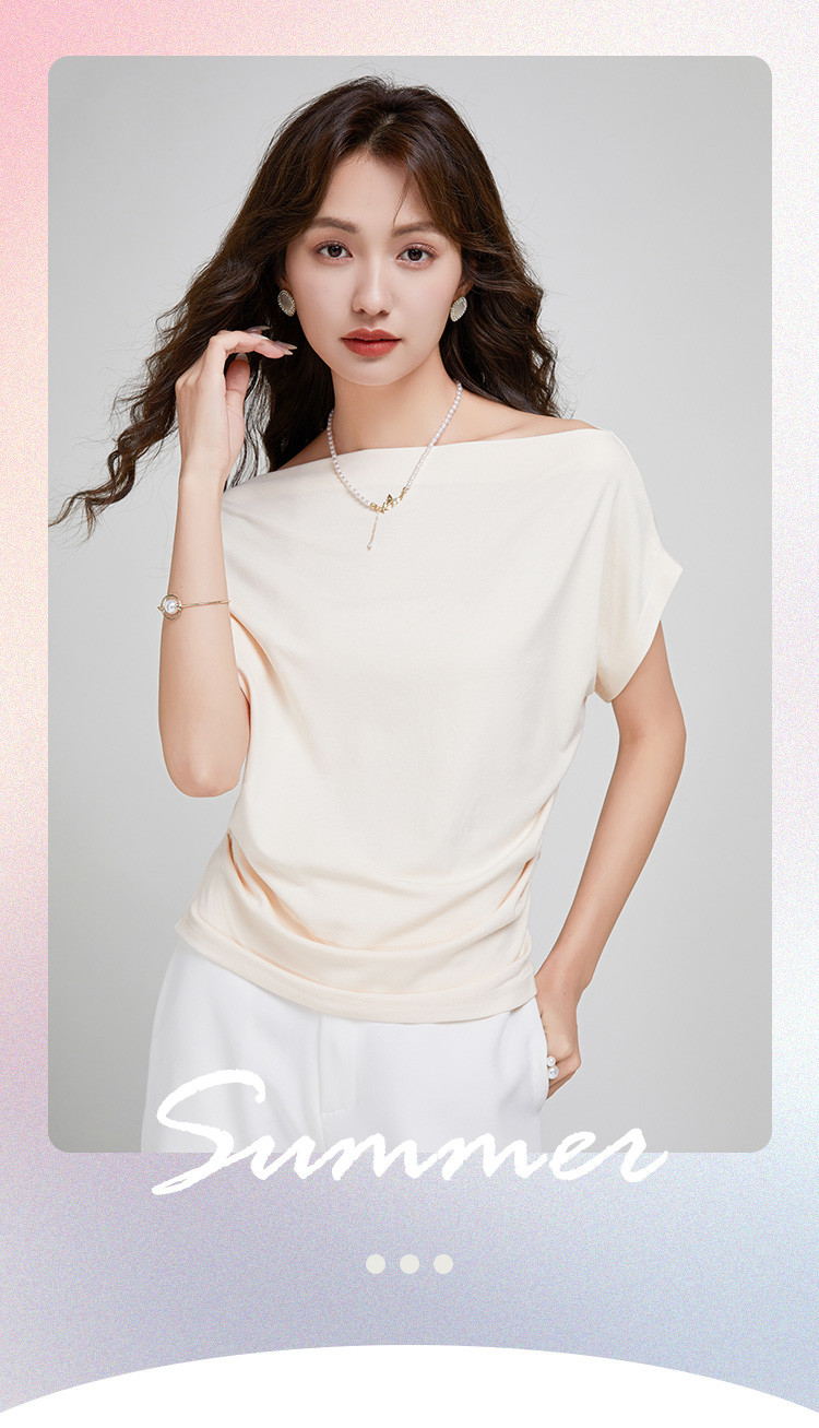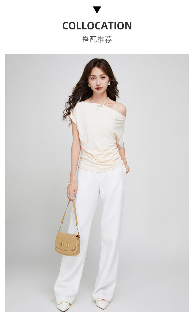 商品名称:高级感纯色一字领t恤女夏季法式设计斜肩露锁骨气质显瘦上衣 957464