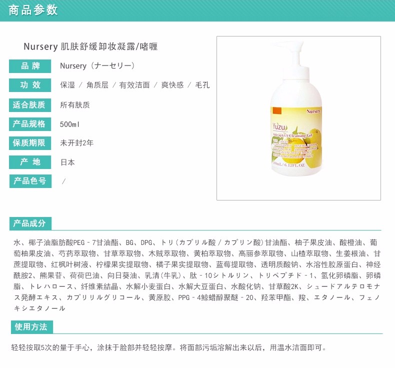 商品名称:Nrusery/娜斯丽 柚子卸妆啫喱 500ML 新旧版本随机发