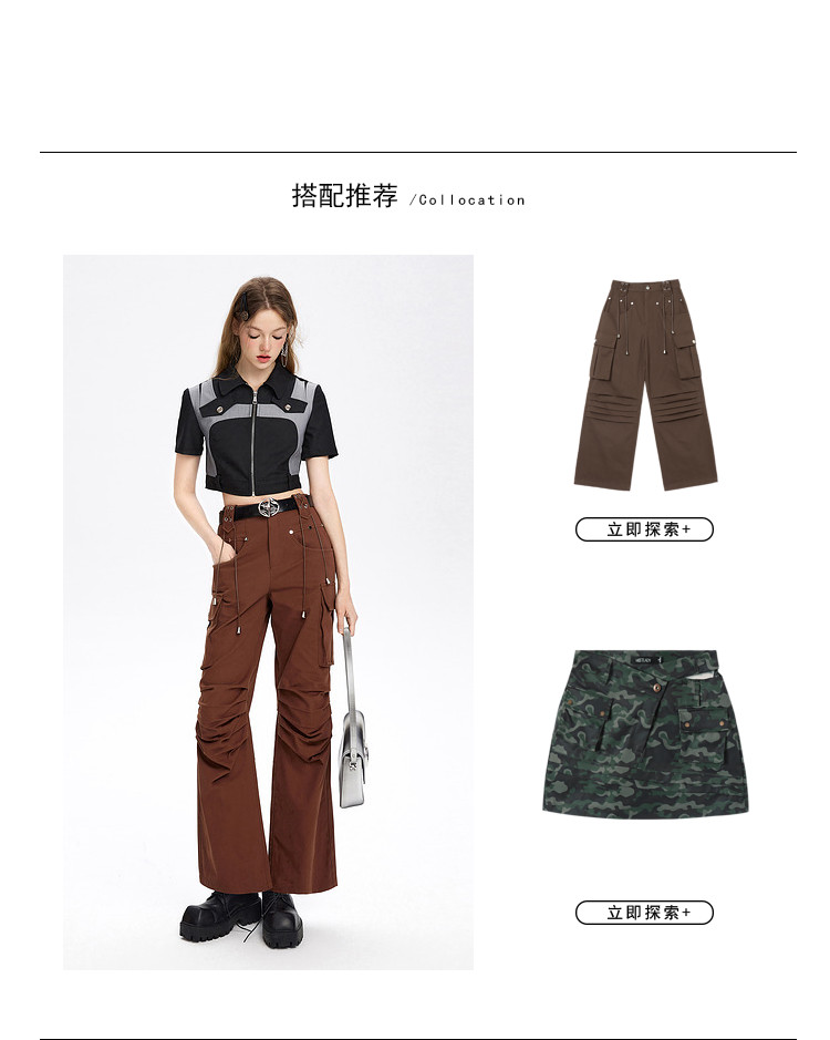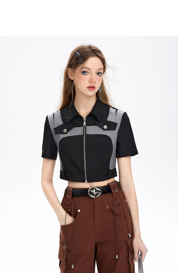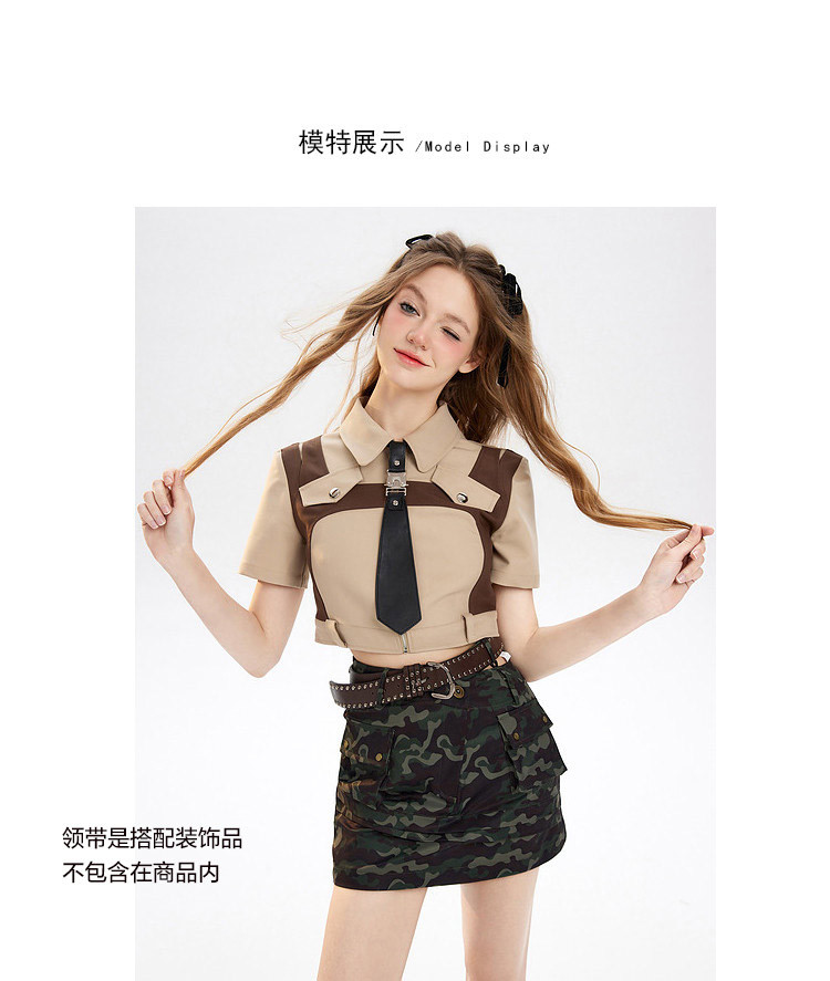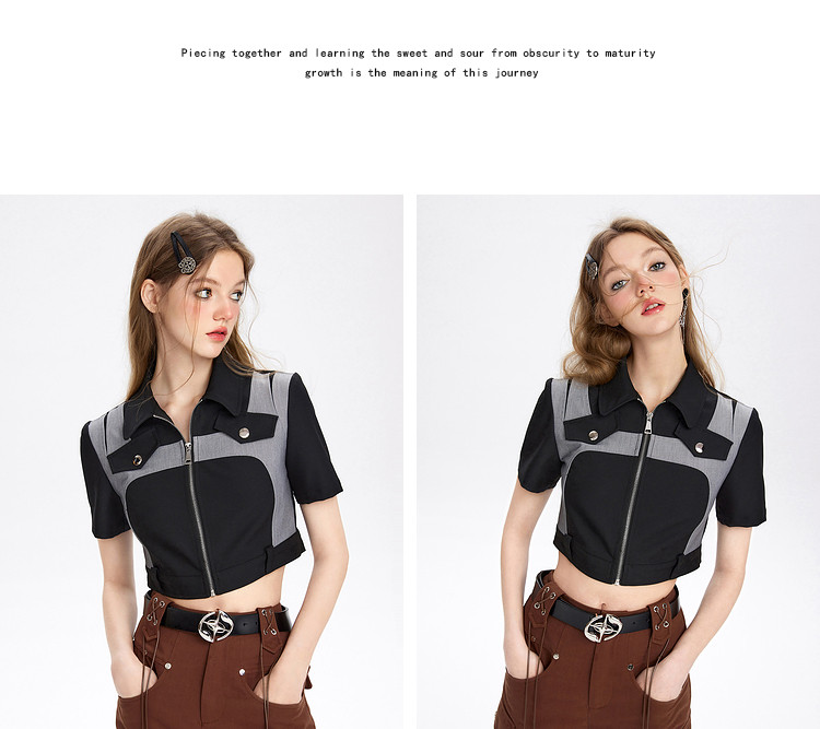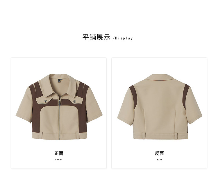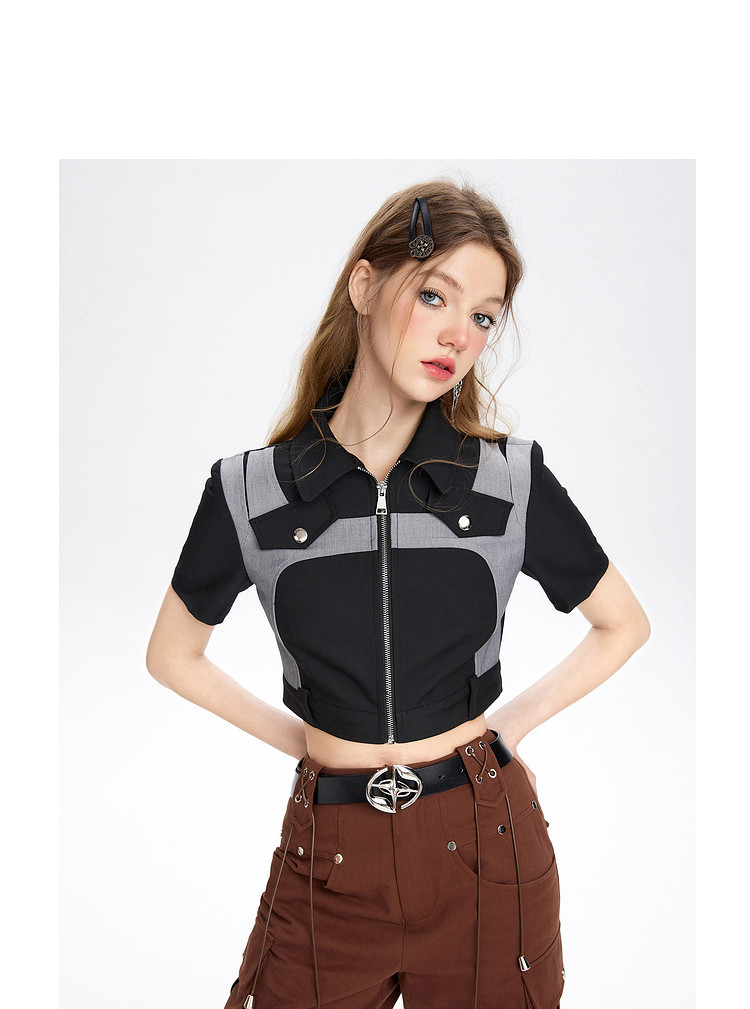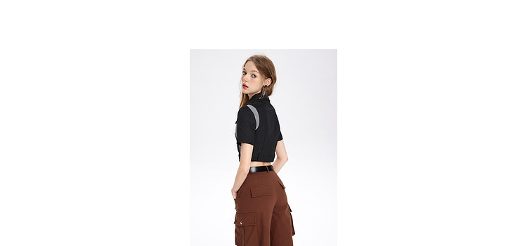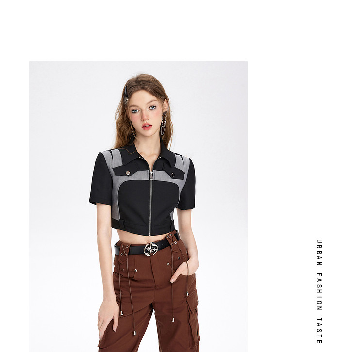 商品名称:夏装美式复古学院风衬衫女撞色拼接正肩露脐短上衣 686804